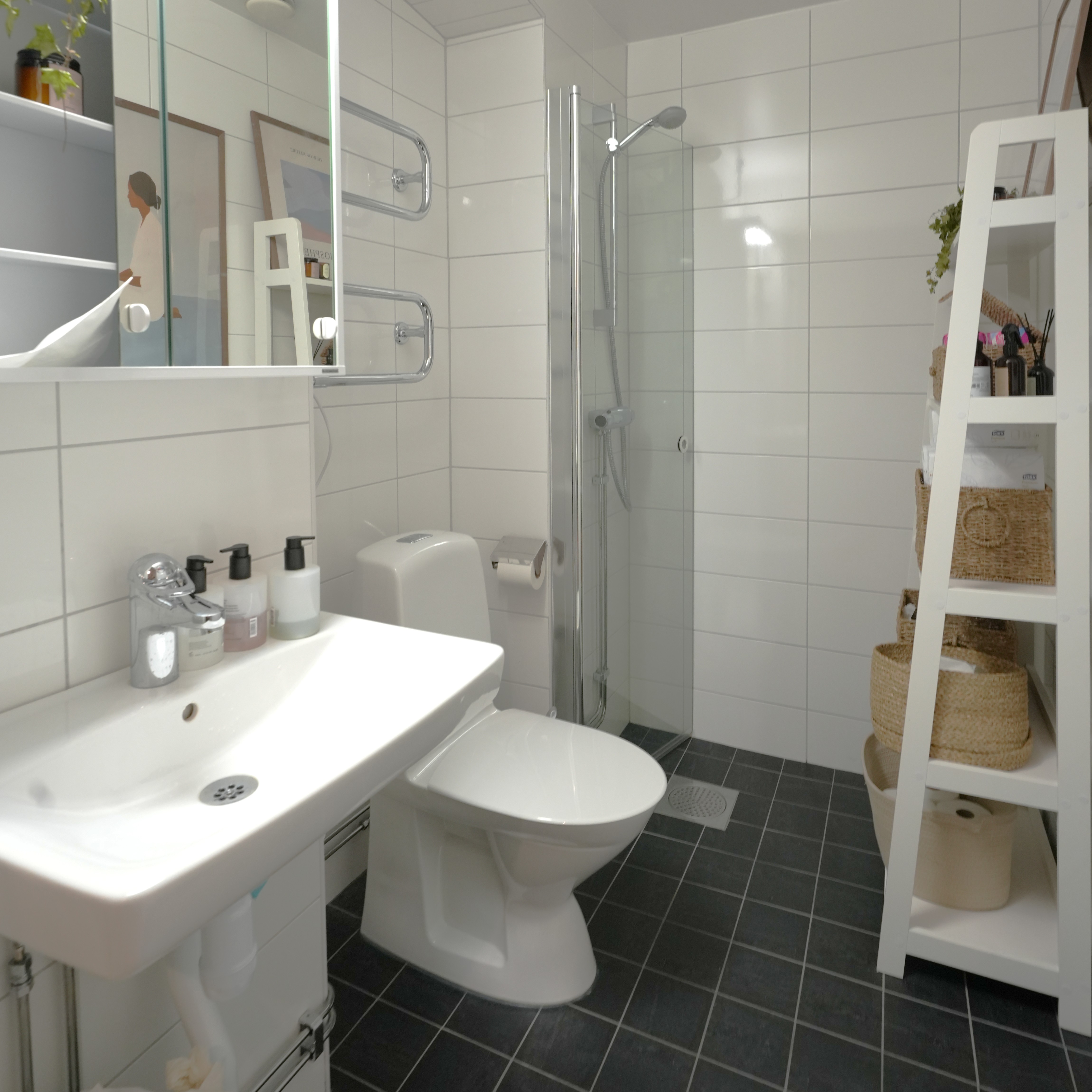 Två stora ljus rum ut mot Tomtebogatan. Wc med dusch finns. Lokalen har högt i tak och kakelugn.