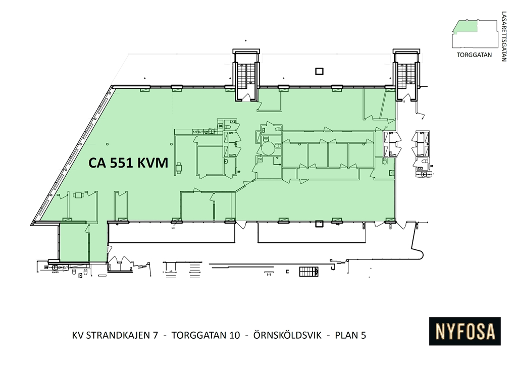 Lokalen ligger på husets översta våningsplan, plan 5, med en yta om ca 551 kvm och har stora i ena kortsidan stora panoramafönster mot Strandgatan och Paradisbadet, samt längs långsidan mot utsidan samt mot den stora invändiga ljusgården, vilket tar tillvara och sprider dagsljuset i lokalerna.