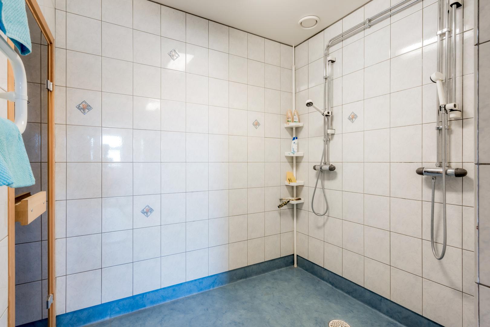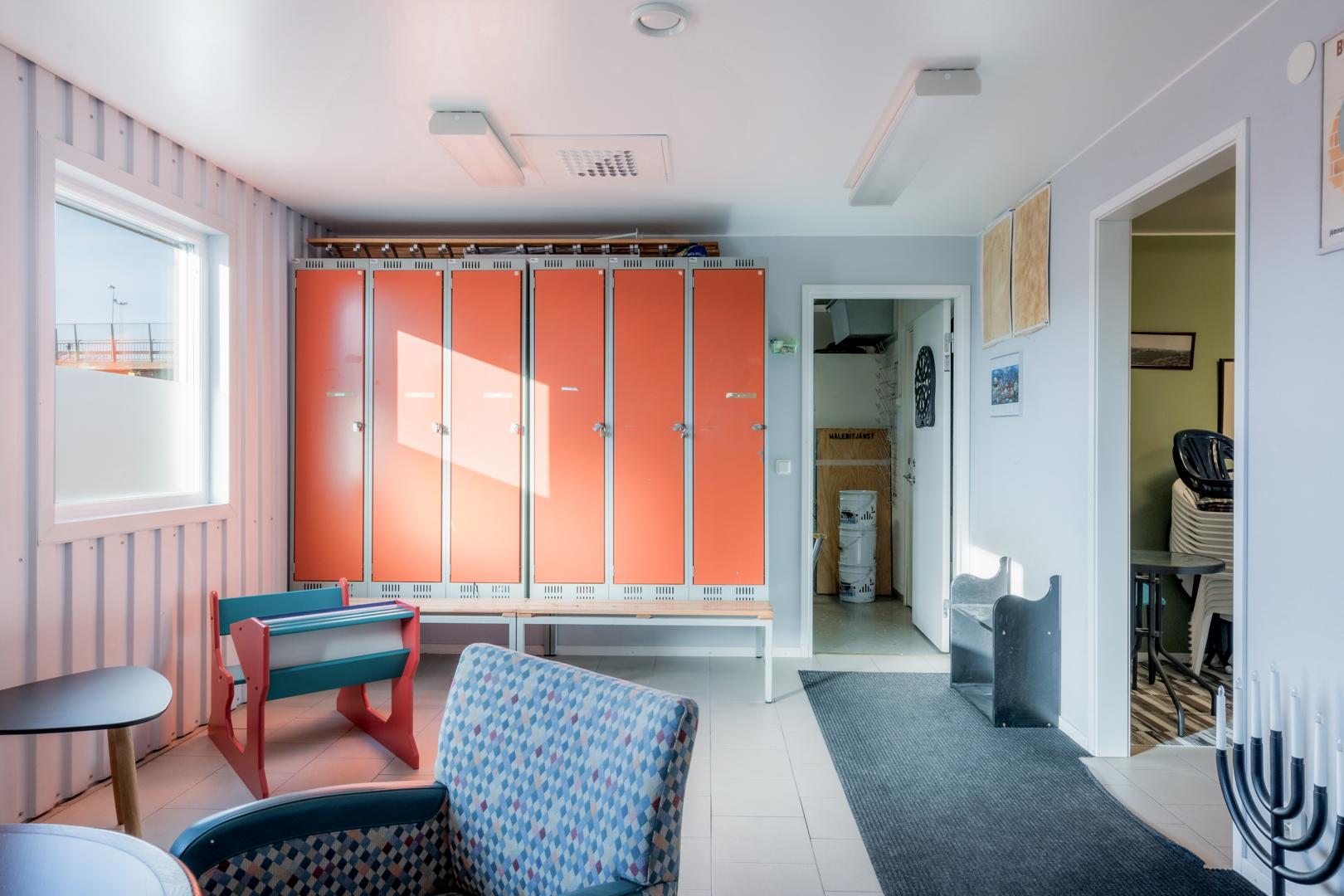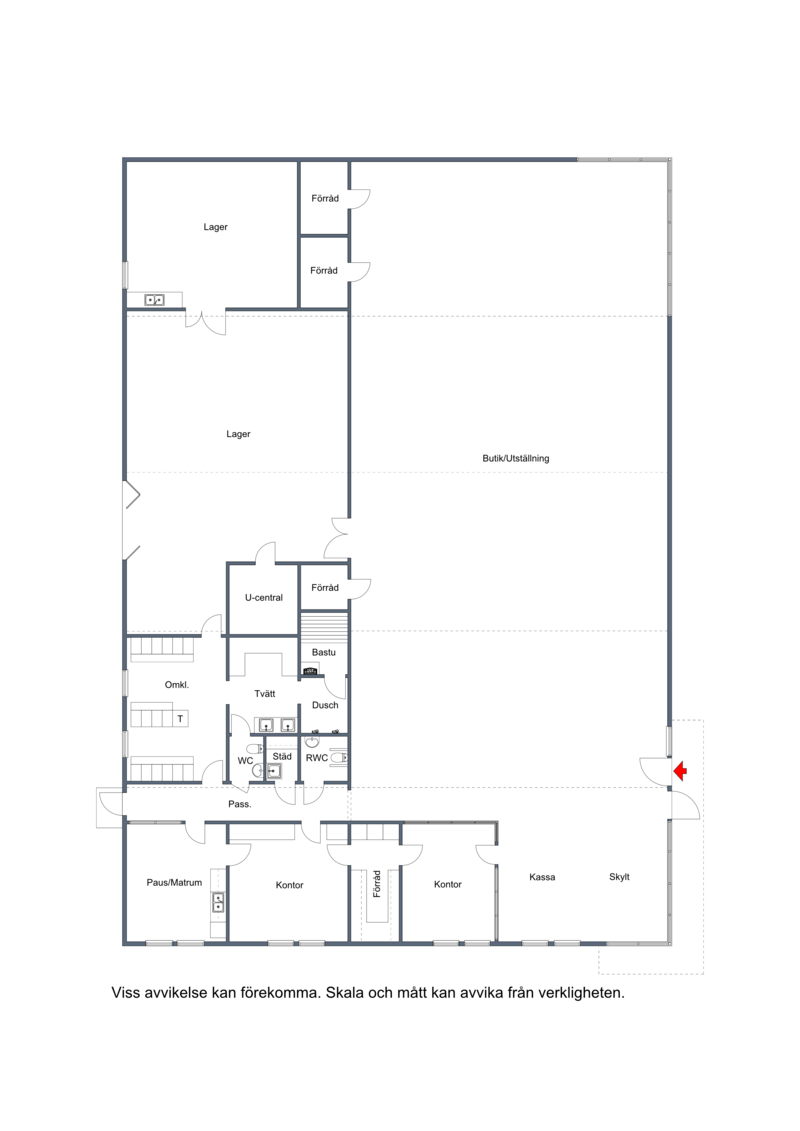 Lokalen är uppdelad i praktiska ytor – med direkt anslutning från entrén finns en yta som passar utmärkt för butik eller showroom. Vidare finns rymlig lageryta med direkt access till lastport för in- och utlastning. Från lagret nås omklädningsrum med tillhörande duschmöjligheter, bastu och WC.