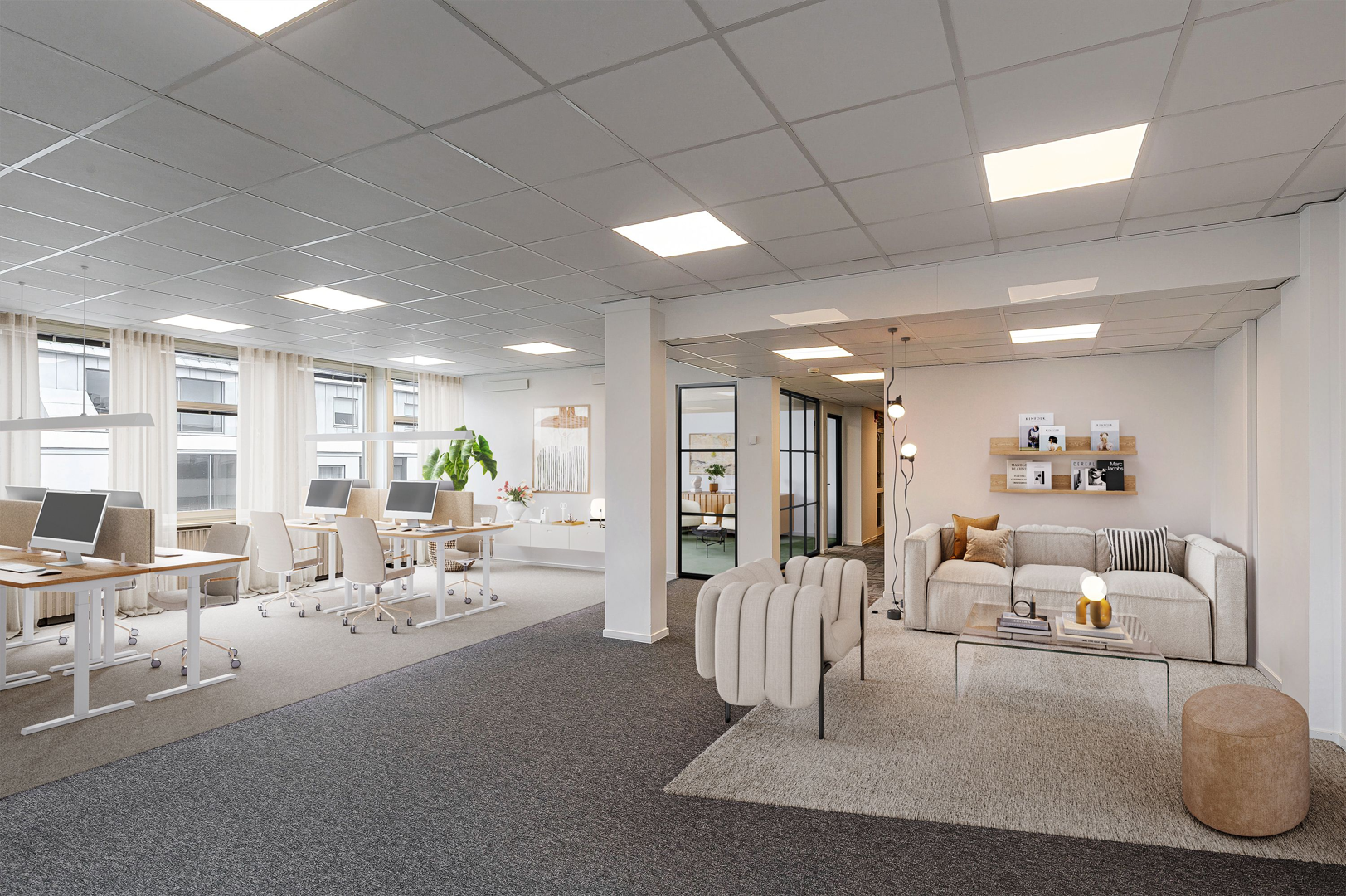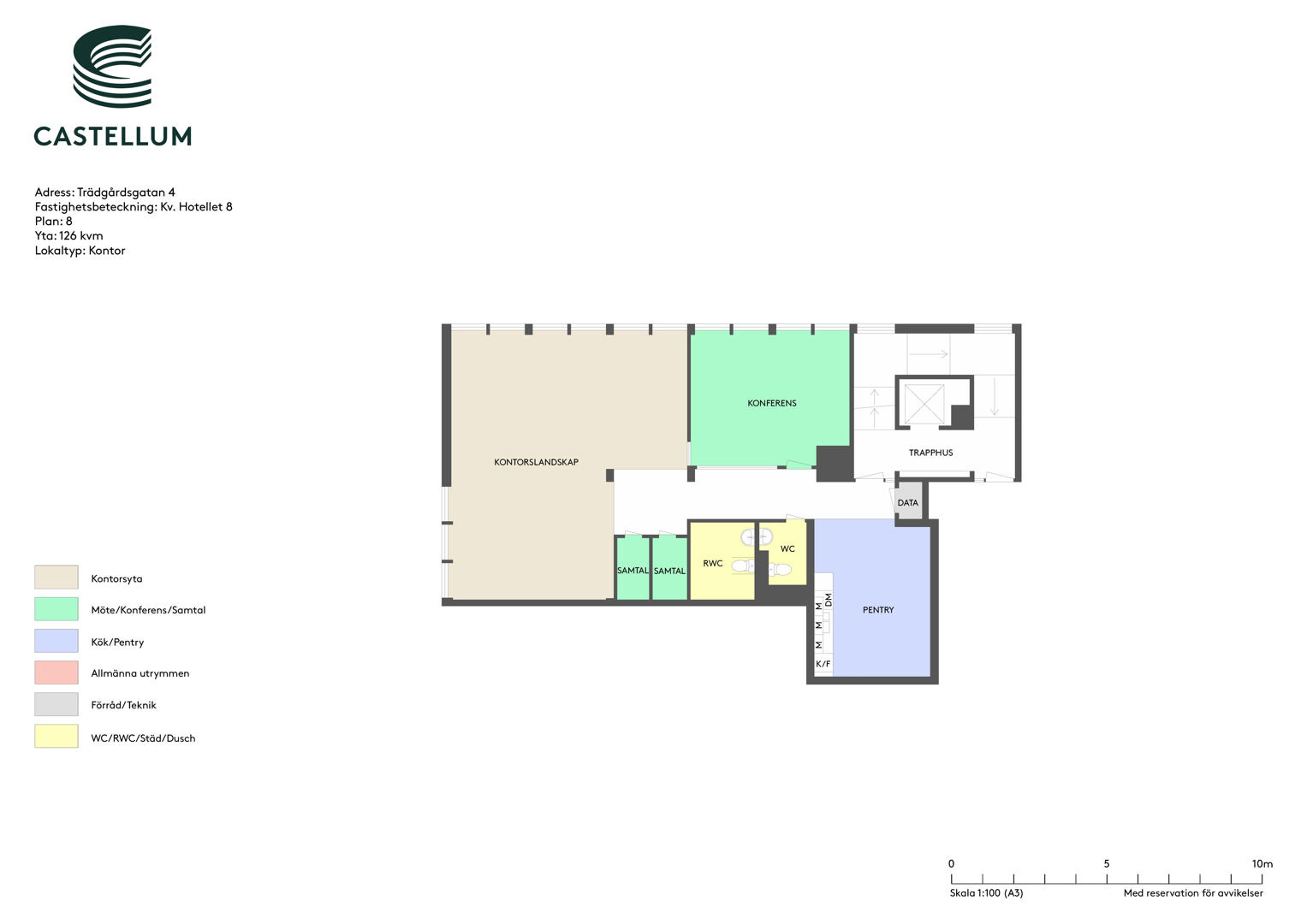 Kontoret lämpar sig väl för arbete i öppet landskap så som det är utformat idag. Kontorslandskapet inrymmer ca 10-12 arbetsplatser med anslutande mötesrum som tidigare varit två mindre samtalsrum. Ytterligare ett större konferensrum med plats för 10-12 personer finns att tillgå i lokalen. Wc & pentry finns i direkt anslutning till entrén.