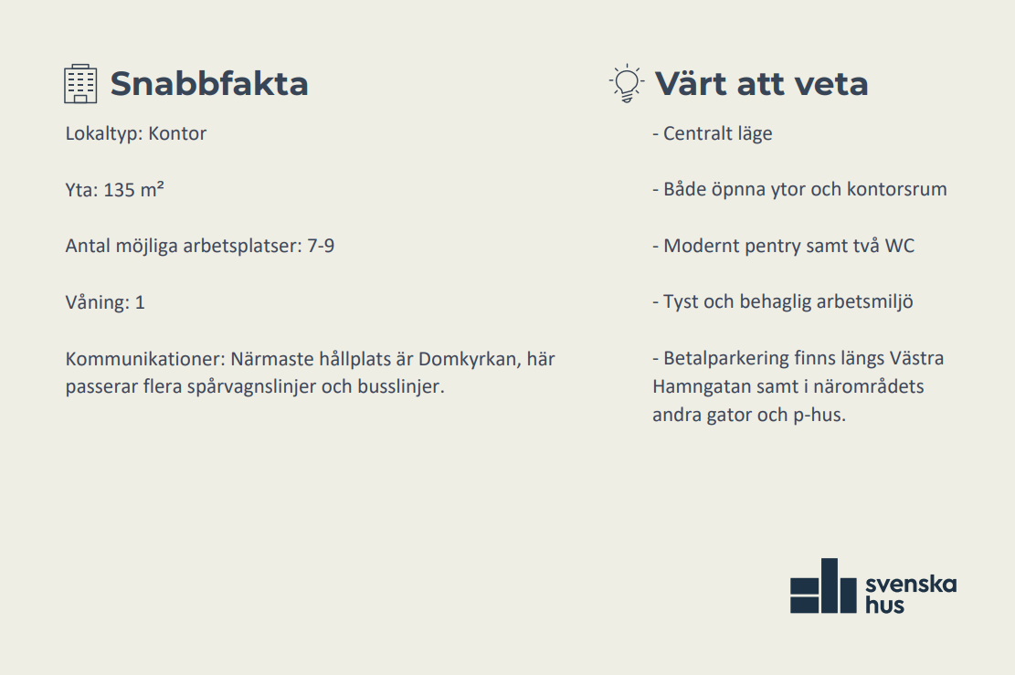 Lokalen erbjuder både öppna ytor och några kontorsrum, konferensrum, ett modernt pentry samt två WC. Här sitter man mitt i stadens puls med det bästa som staden har att erbjuda runt hörnet.