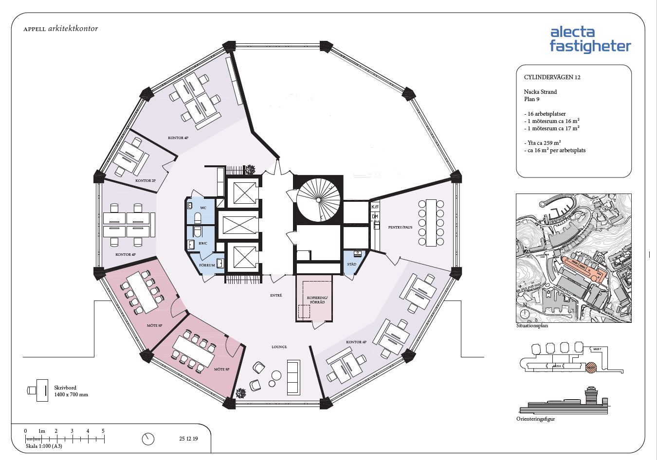 Planlösningen är flexibel och kombinerar storrumskontor, öppet landskap samt mötesrum. Lokalen rymmer cirka 16 arbetsplatser och är belägen på plan 9, med en fantastisk utsikt över Stockholms inlopp som skapar en inspirerande arbetsmiljö.