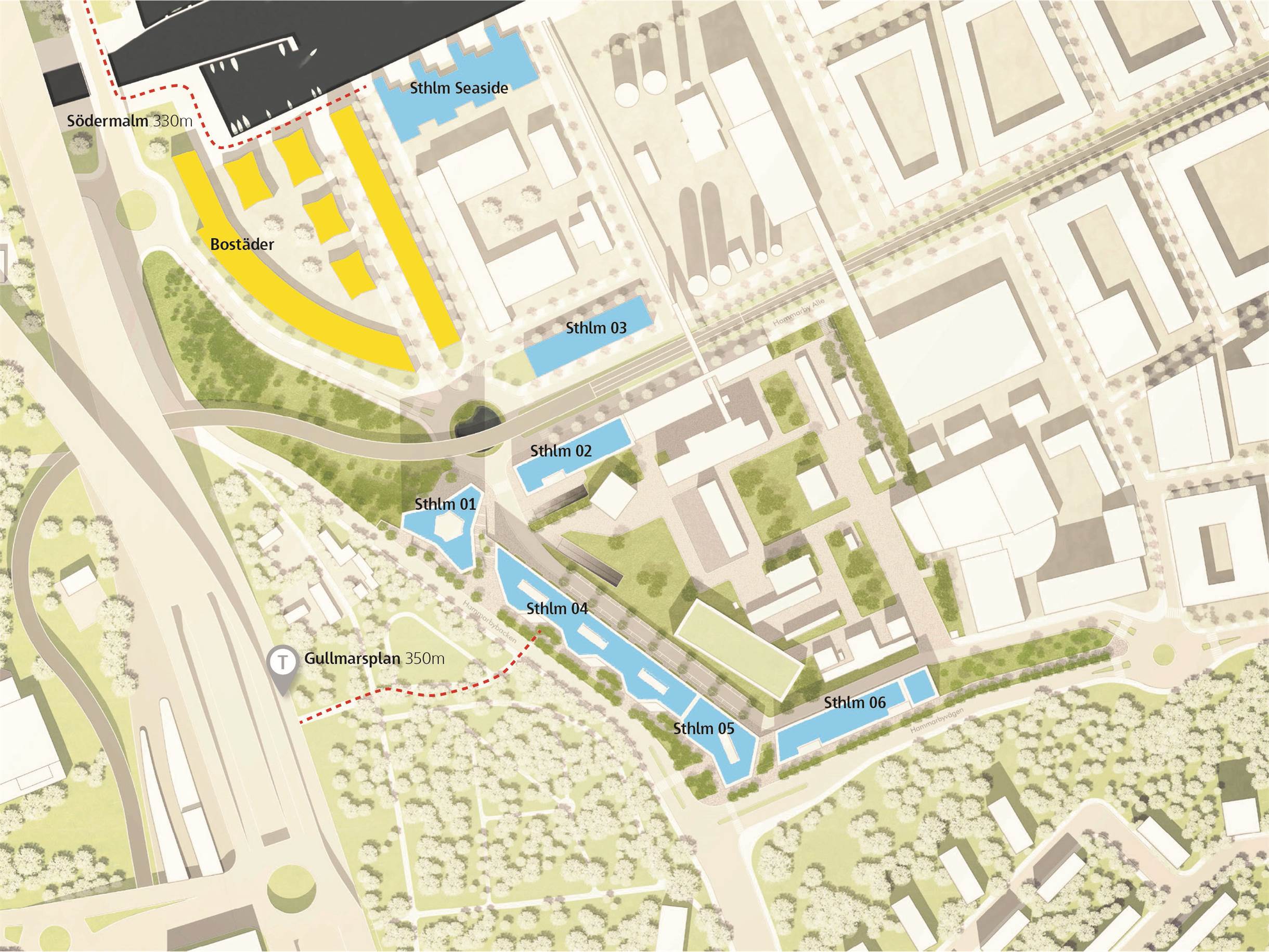 Området har lättillgängliga kommunikationer oavsett färdsätt. Bara minuter bort finns Gullmarsplan med tunnelbanelinjer och en stor bussterminal. Tvärbanan stannar praktiskt taget utanför dörren, och när den nya tunnelbanan är klar blir uppgången i huset bredvid. Du som vill köra bil når oss via Nynäsvägen, och det är nära till Södra Länken. Vill du hellre promenera är det bara sju minuter till Södermalm, och väljer du cykeln har alla hus i Sthlm New cykelgarage och omklädningsrum med handduksservice för att underlätta.