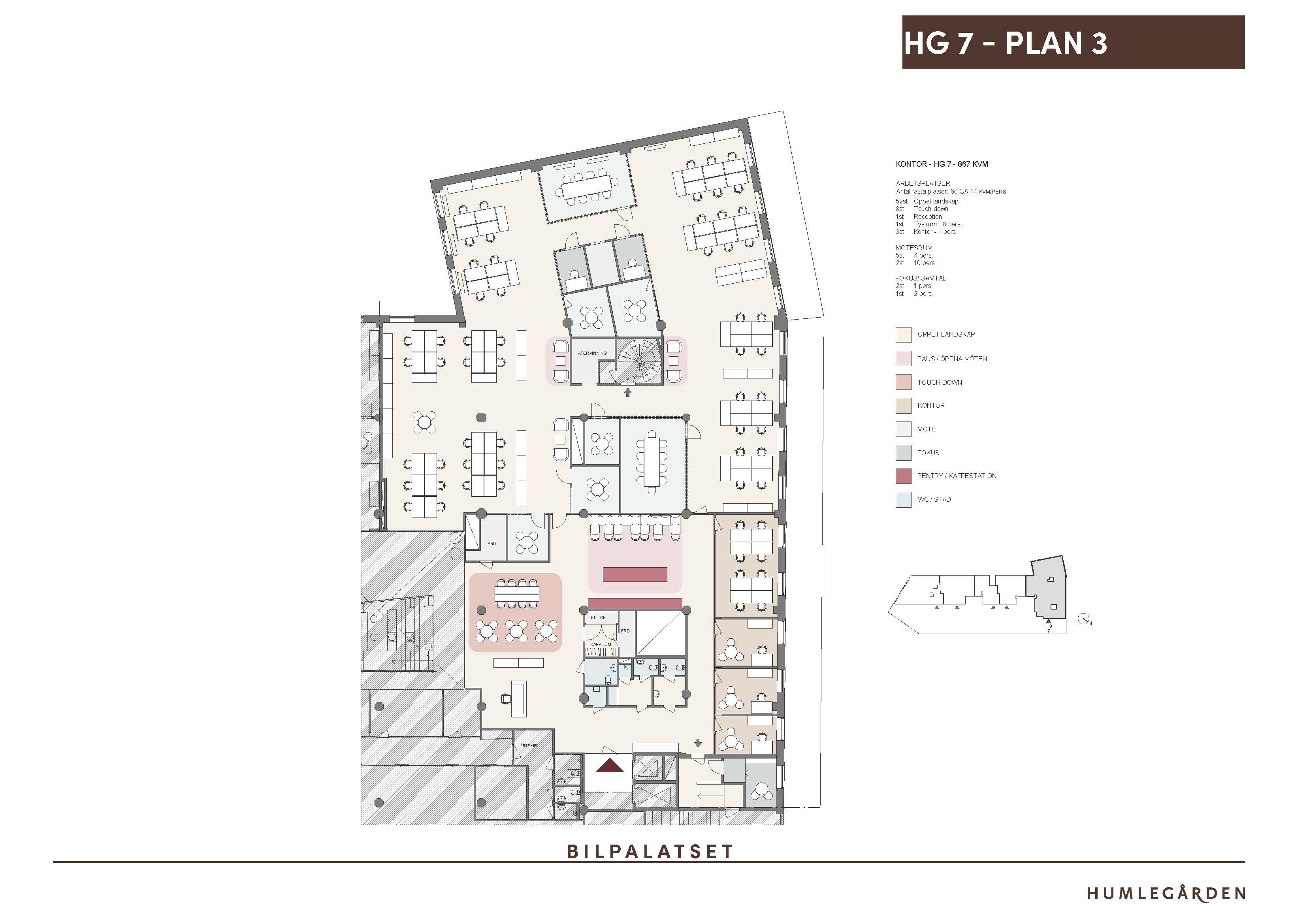 Kliv in i ditt nya kontor på plan 3 i Bilpalatset. Här möts du av en gemensam yta med reception och matsal som kontorets självklara mötesplats. Det öppna landskapet rymmer 52 fasta arbetsplatser och kombineras med flera kontorsrum för 1 8 personer. För spontana möten finns även smarta touchdown-platser där kollegor kan slå sig ned och jobba en stund tillsammans. I övrigt bjuder lokalen på en bra mix av mötesrum i olika storlekar och mindre samtalsrum för digitala möten. Lokalen är färdigbyggd, men viss anpassning kan göras i samråd med ny hyresgäst.
