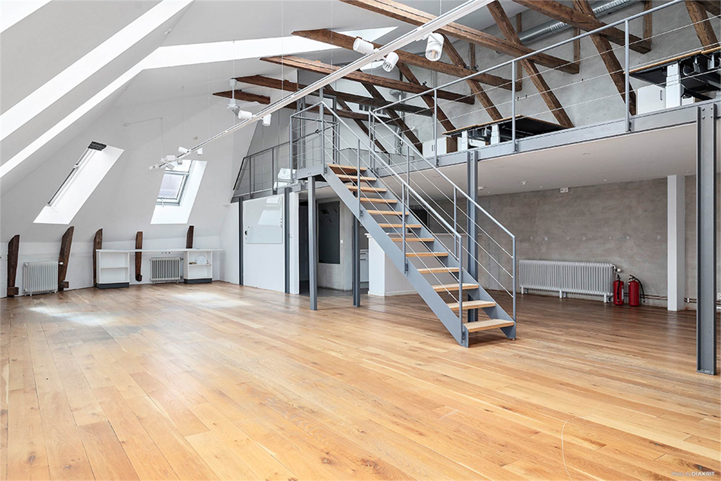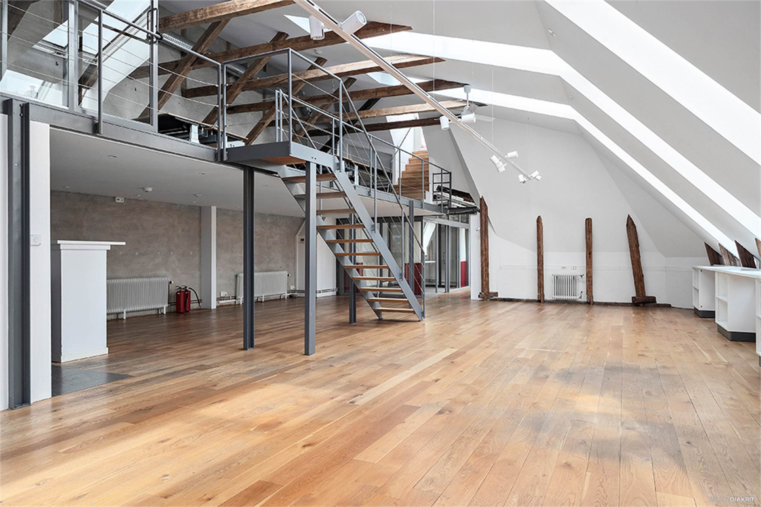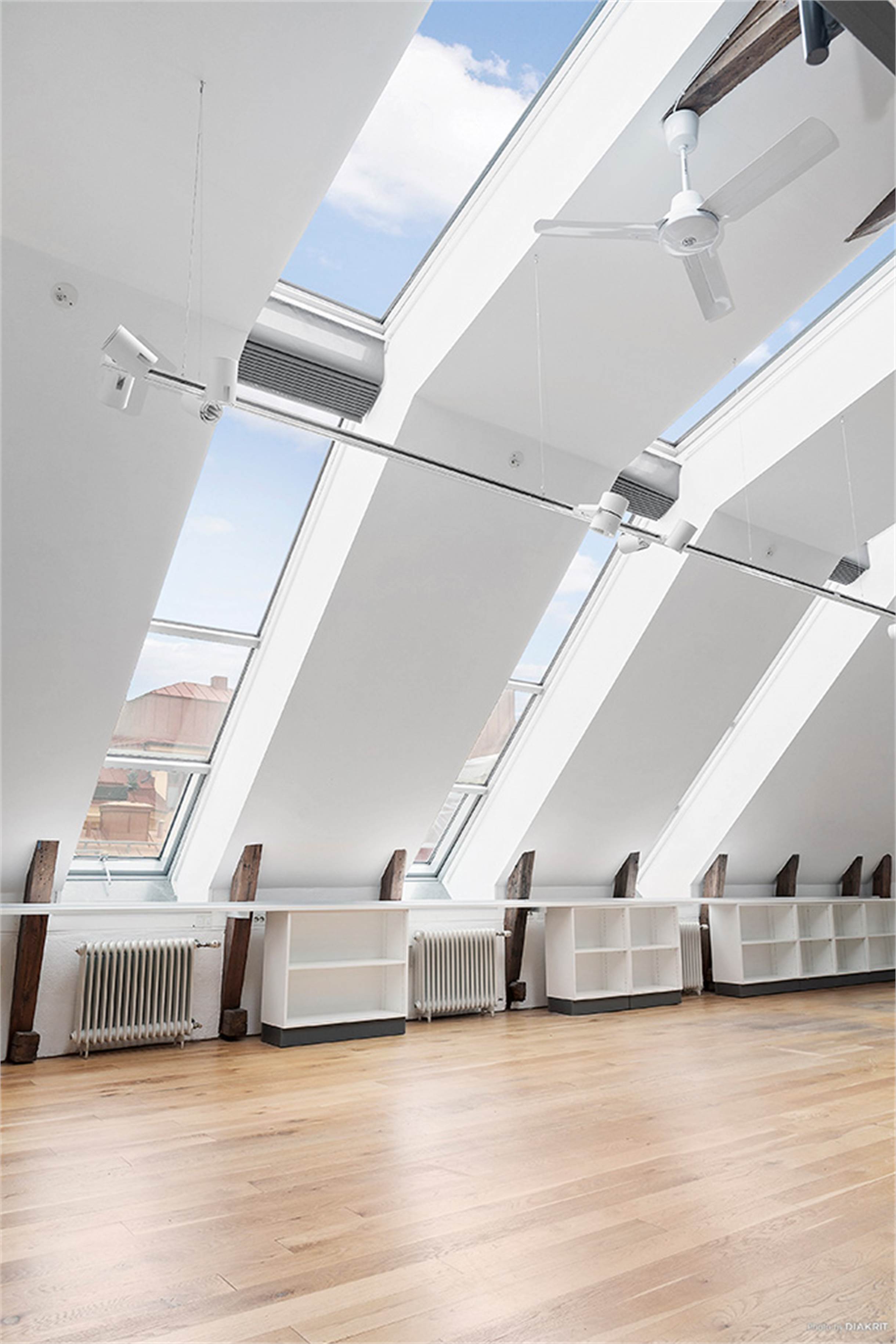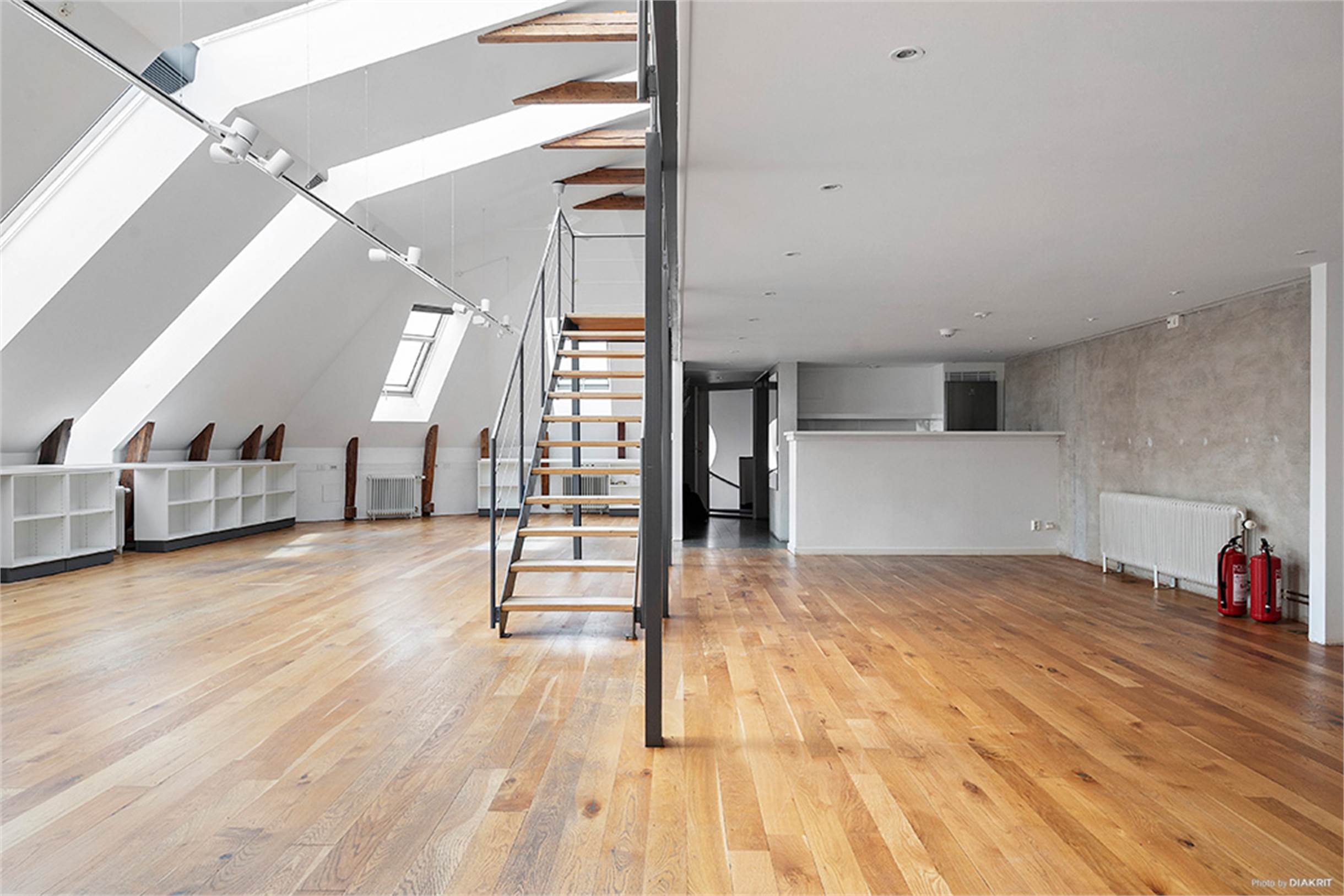 Strålande ljus och välplanerad vindsvåning med öppen planlösning och stora trevliga arbetssytor. Lokalen har högt till tak, ljusa väggar och synliga takbjälkar. Stora fönsterpartier från golv till tak ger ett fantastiskt ljusinsläpp.