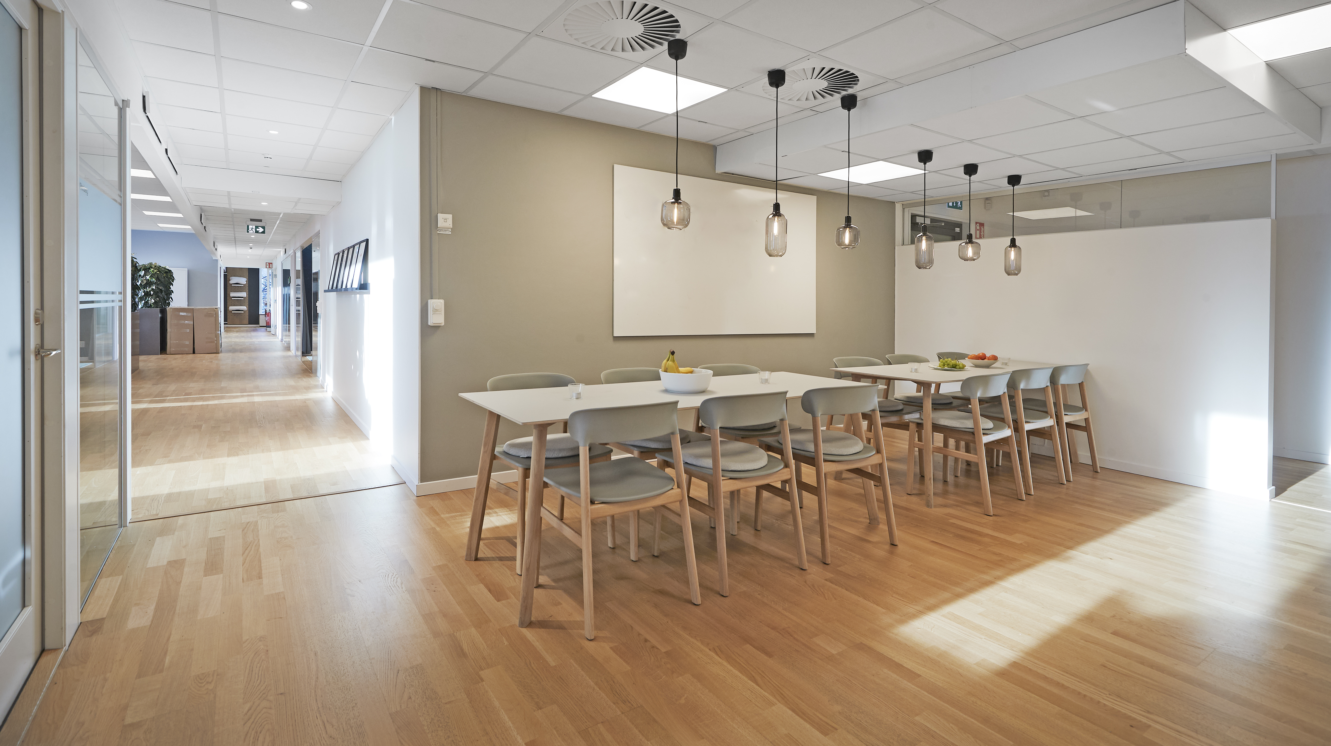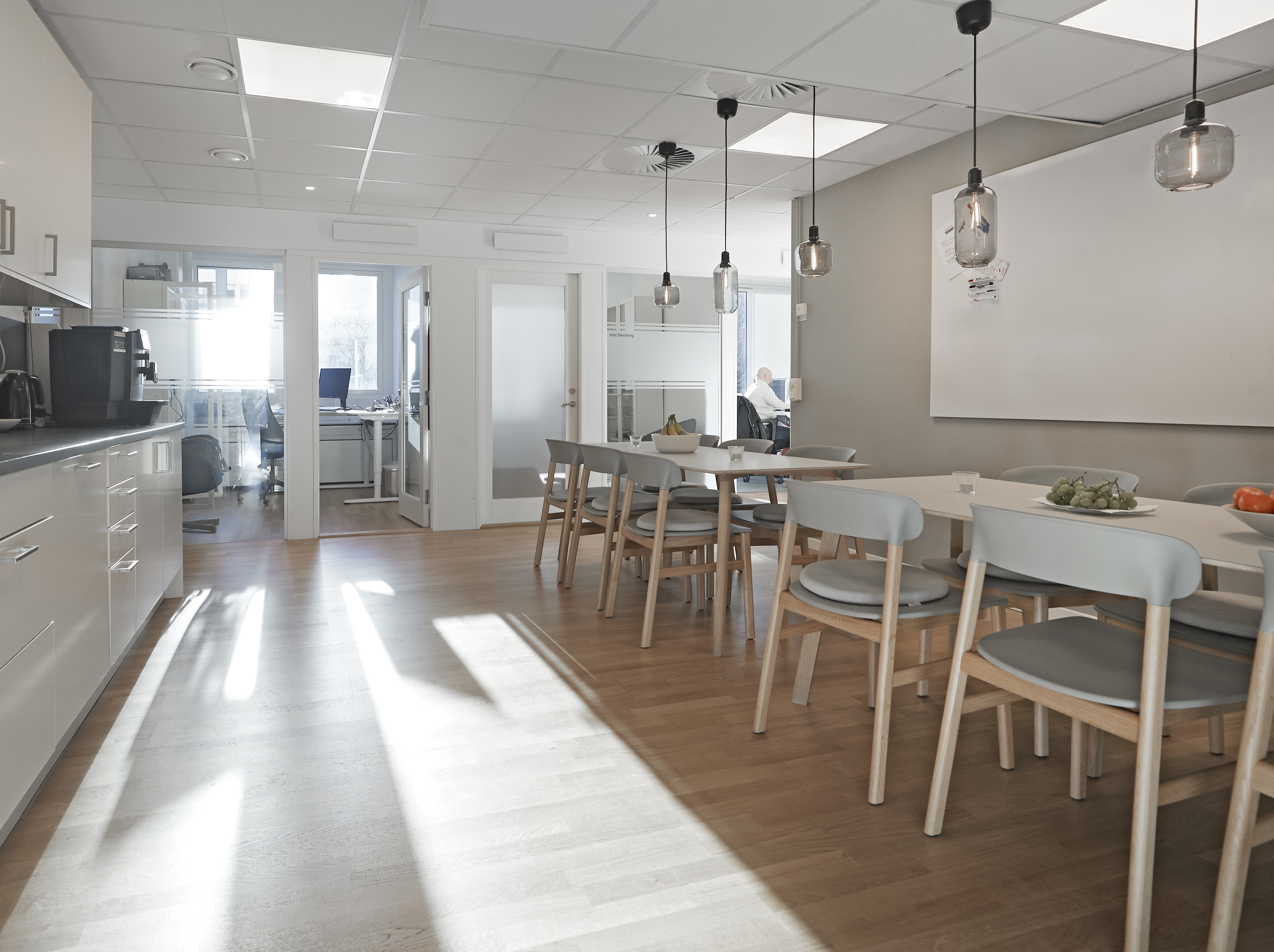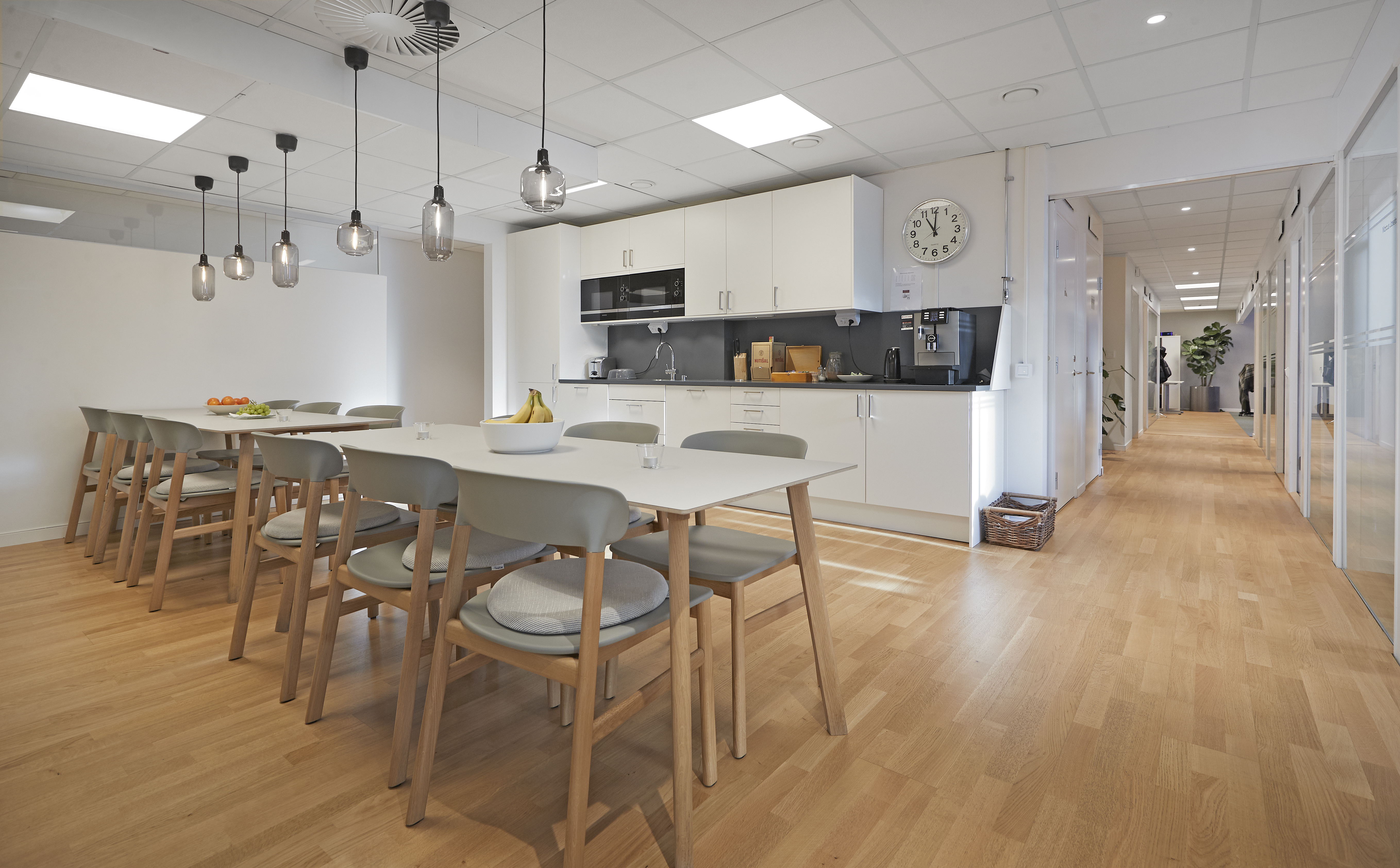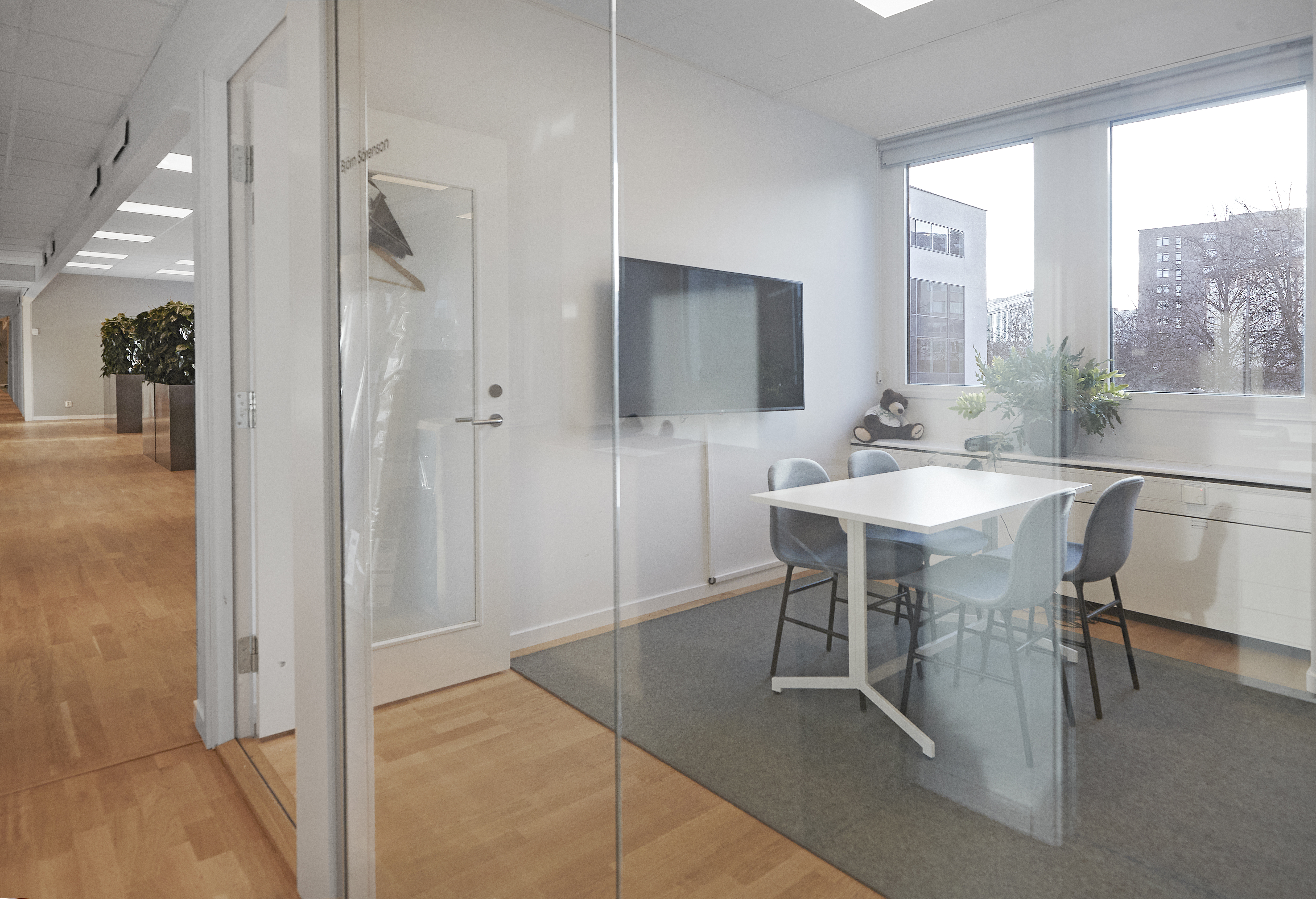 Kontoret är 413 kvm och har 26 arbetsplatser, 3 mötesrum, 3 toaletter och ett rymligt kök.