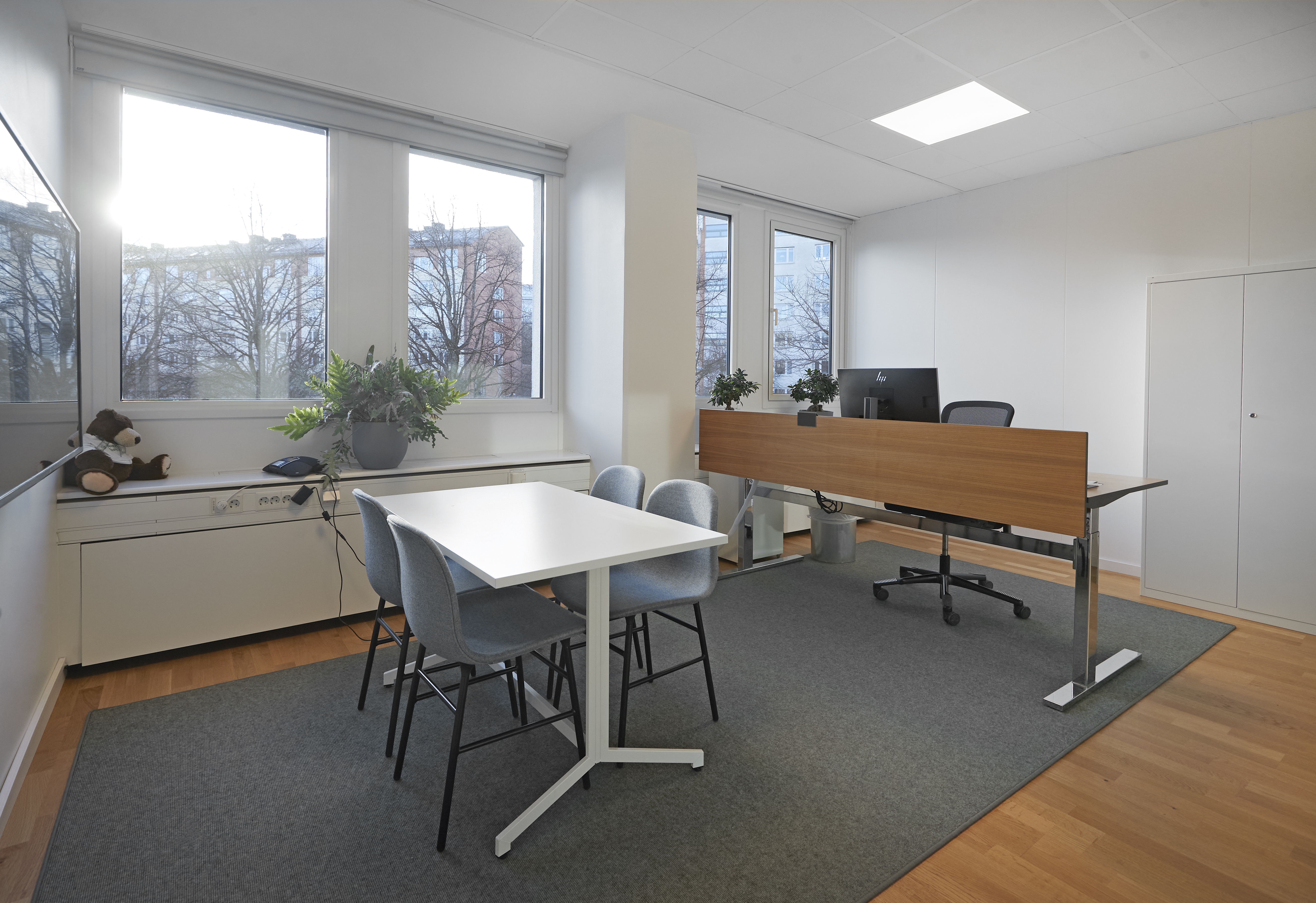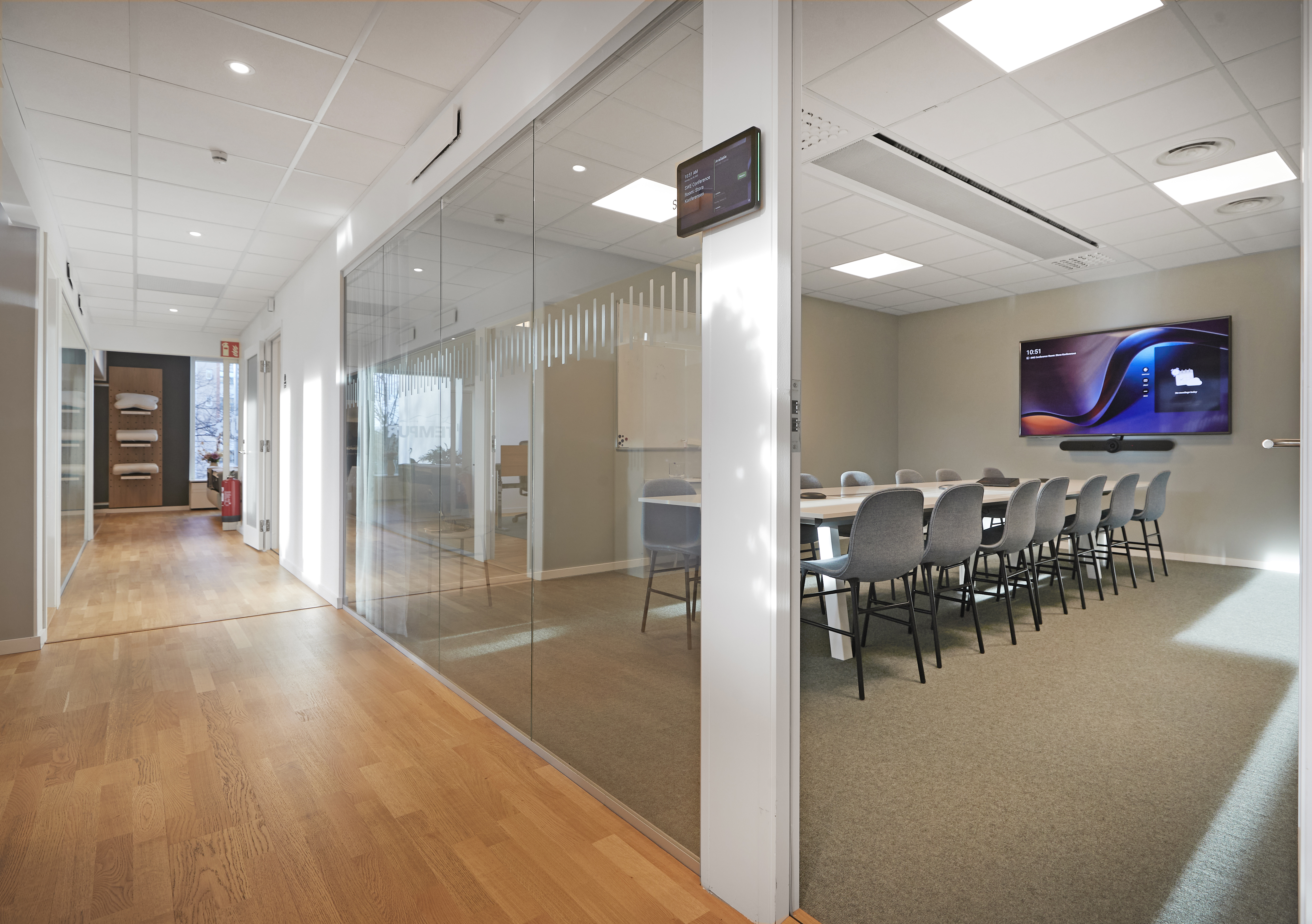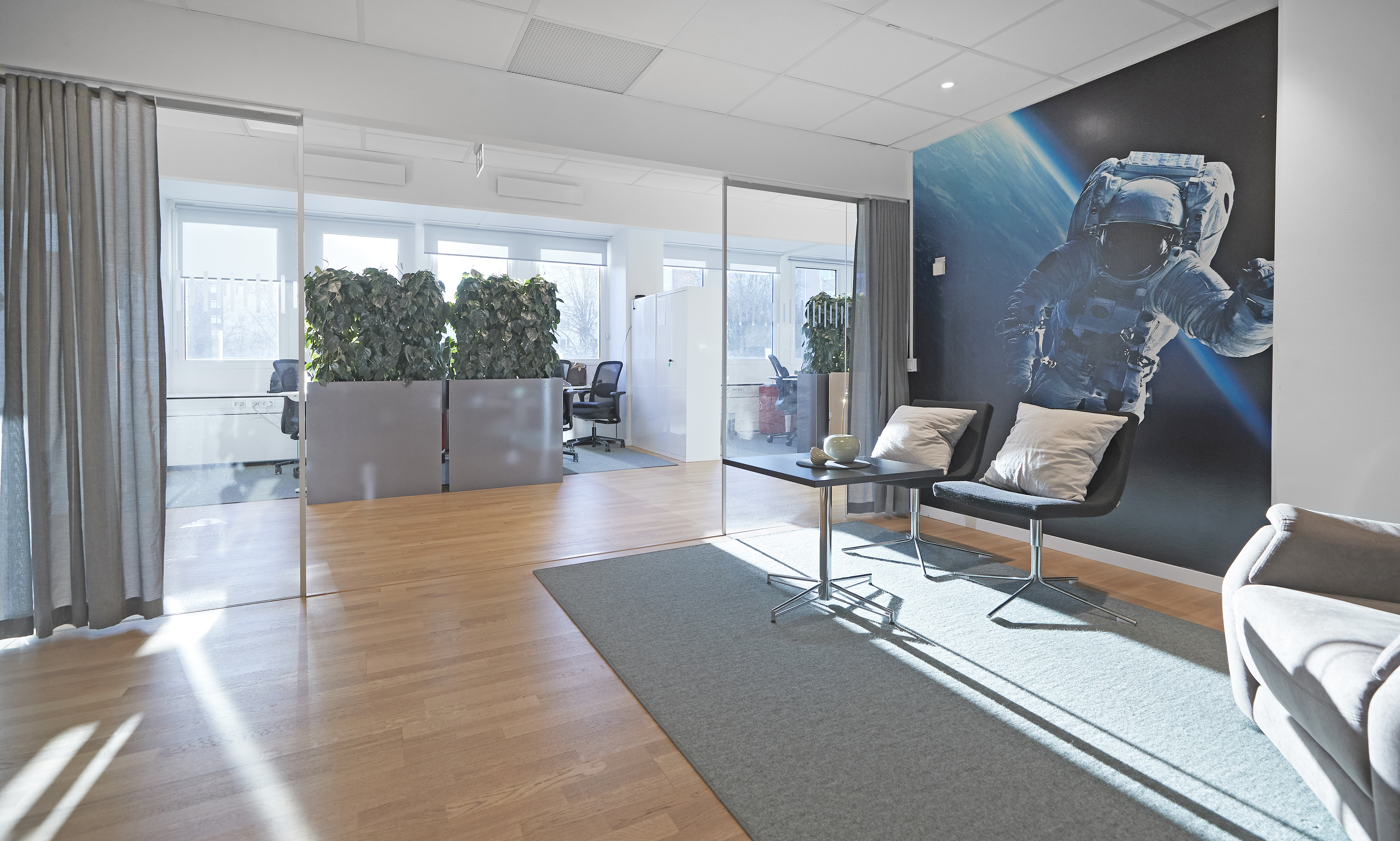 Kontoret är 413 kvm och har 26 arbetsplatser, 3 mötesrum, 3 toaletter och ett rymligt kök.