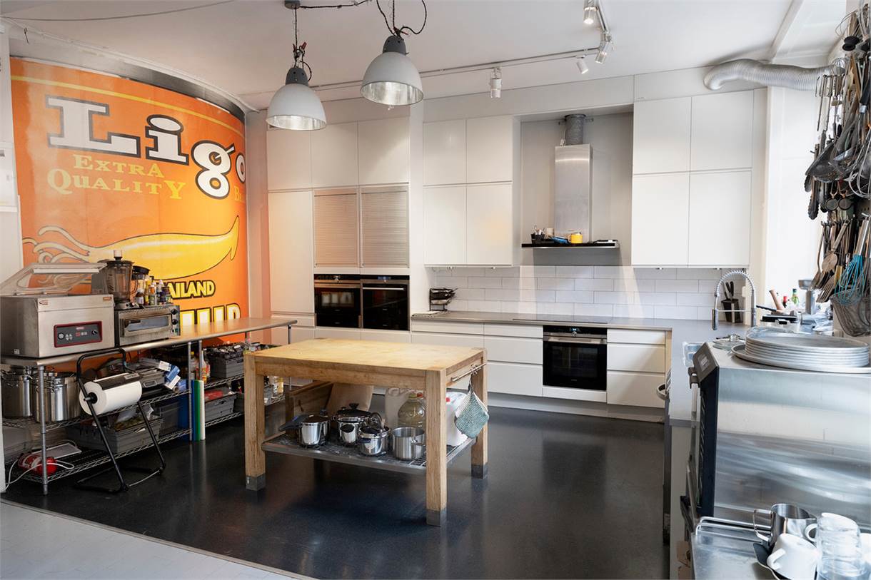 Det rymliga, öppna köket är utrustat med moderna maskiner: tre varmluftsugnar, induktionsspis med fem plattor, restaurangdiskmaskin (ny 2024) samt flera kylar.
