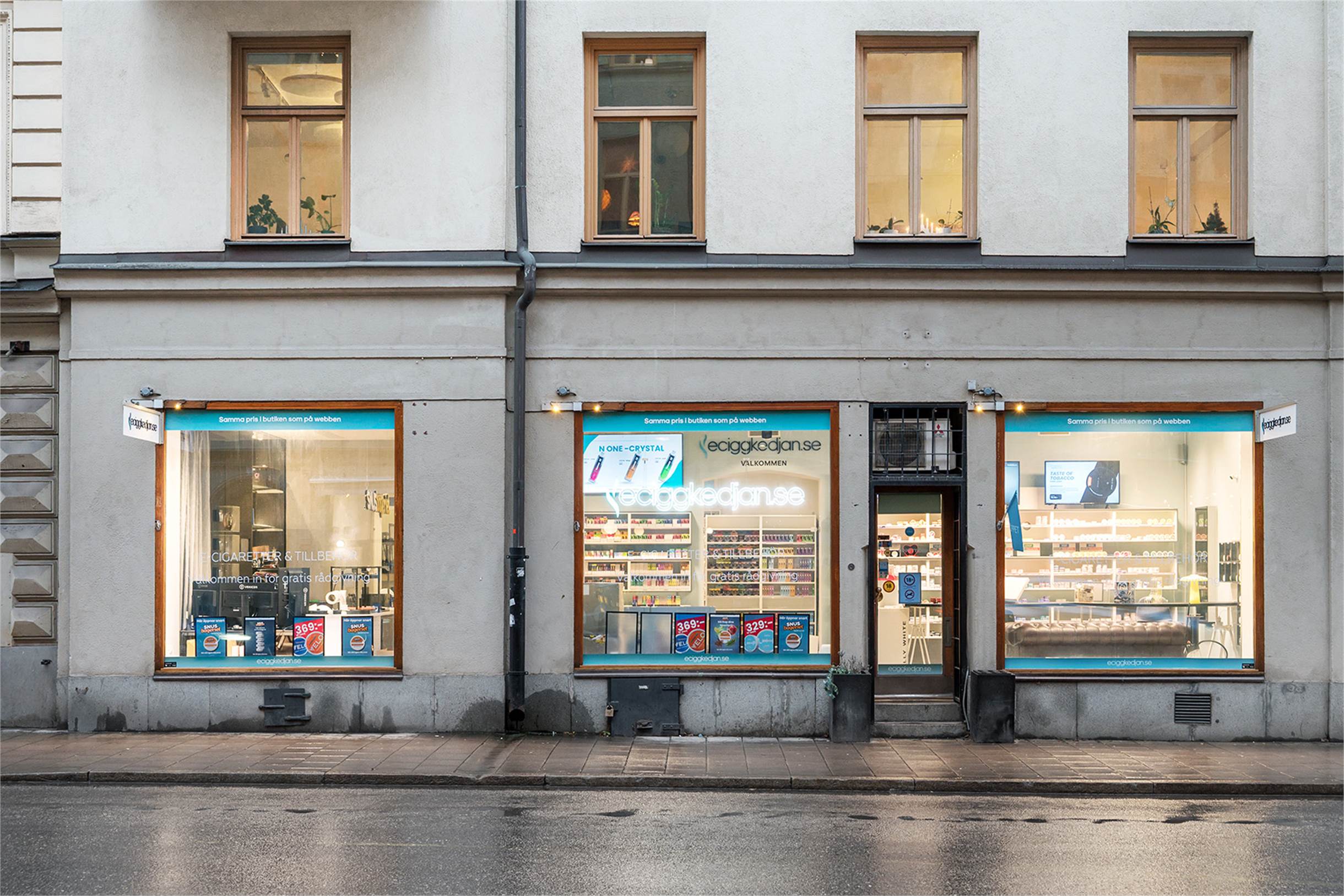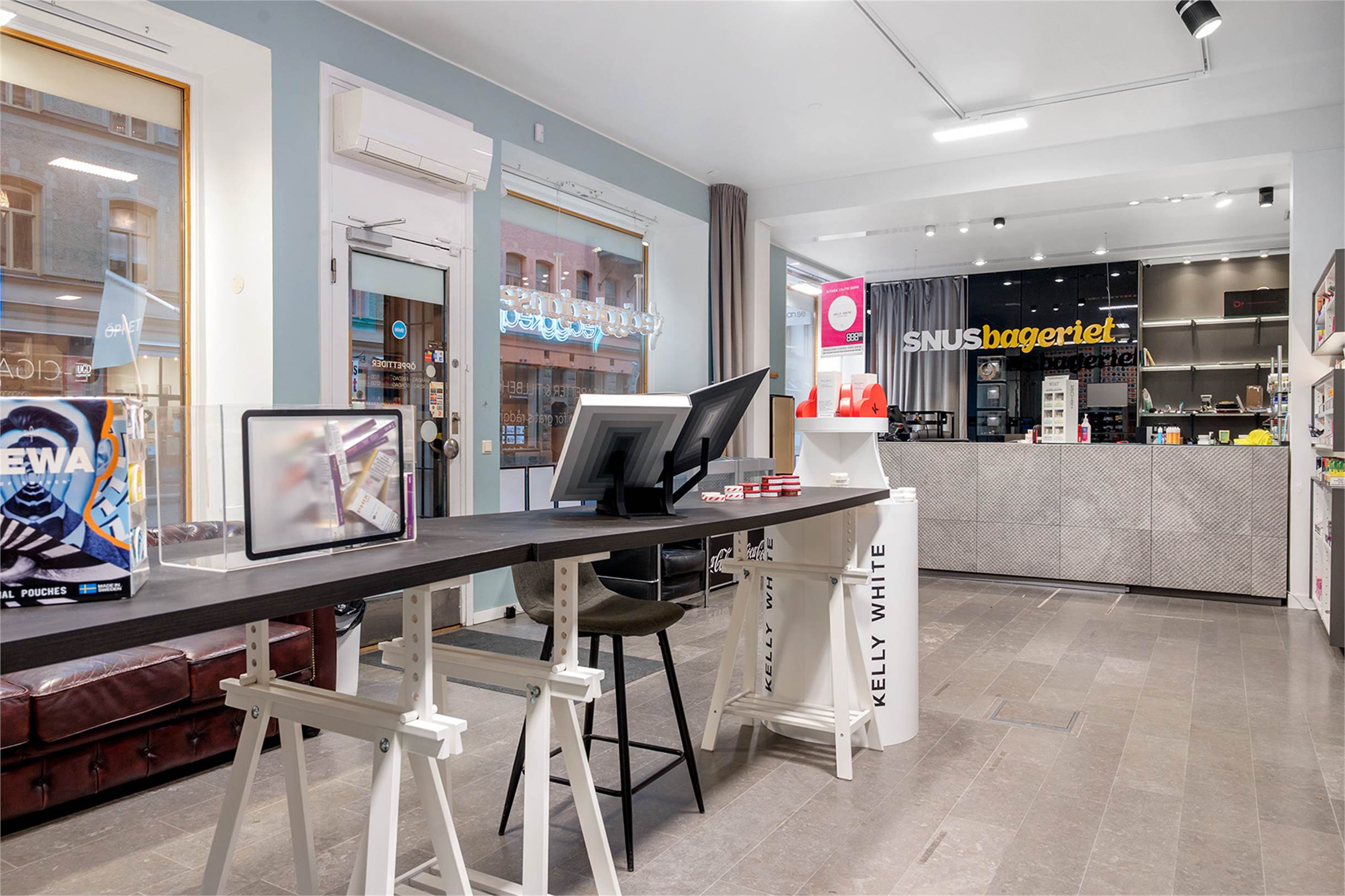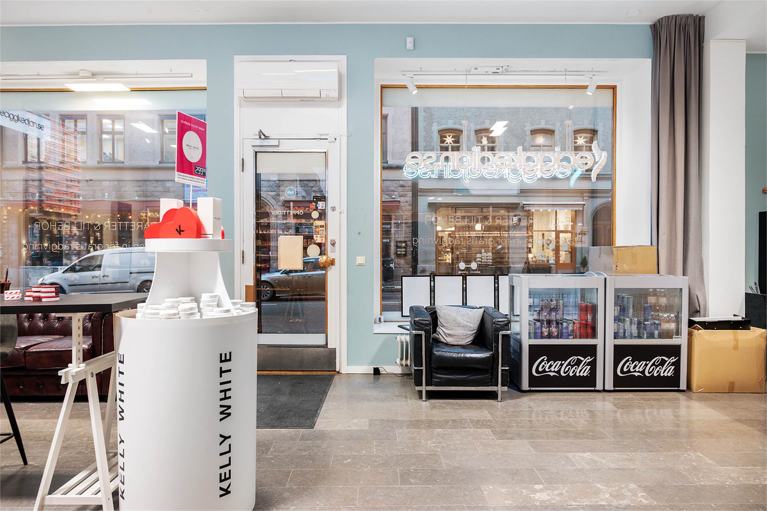 Stora skyltfönster med möjlighet att hänga upp skylt eller foliera fönstren.