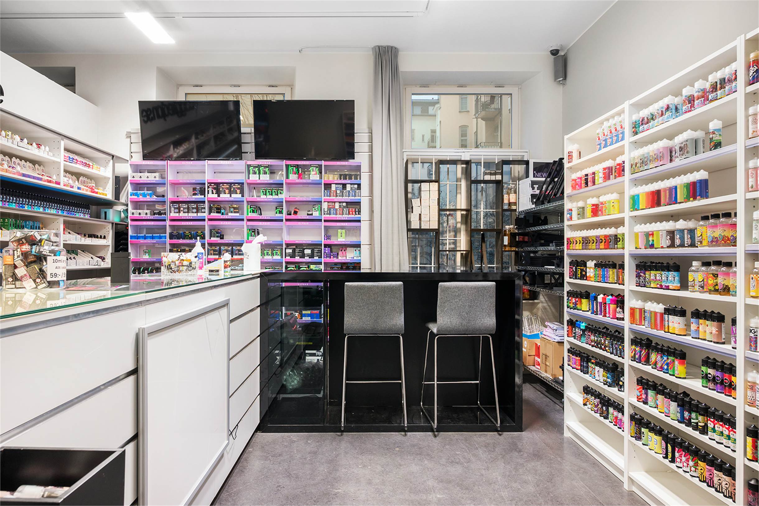 Butikslokal i sekelskifteshus med högt i tak och stora fönster.