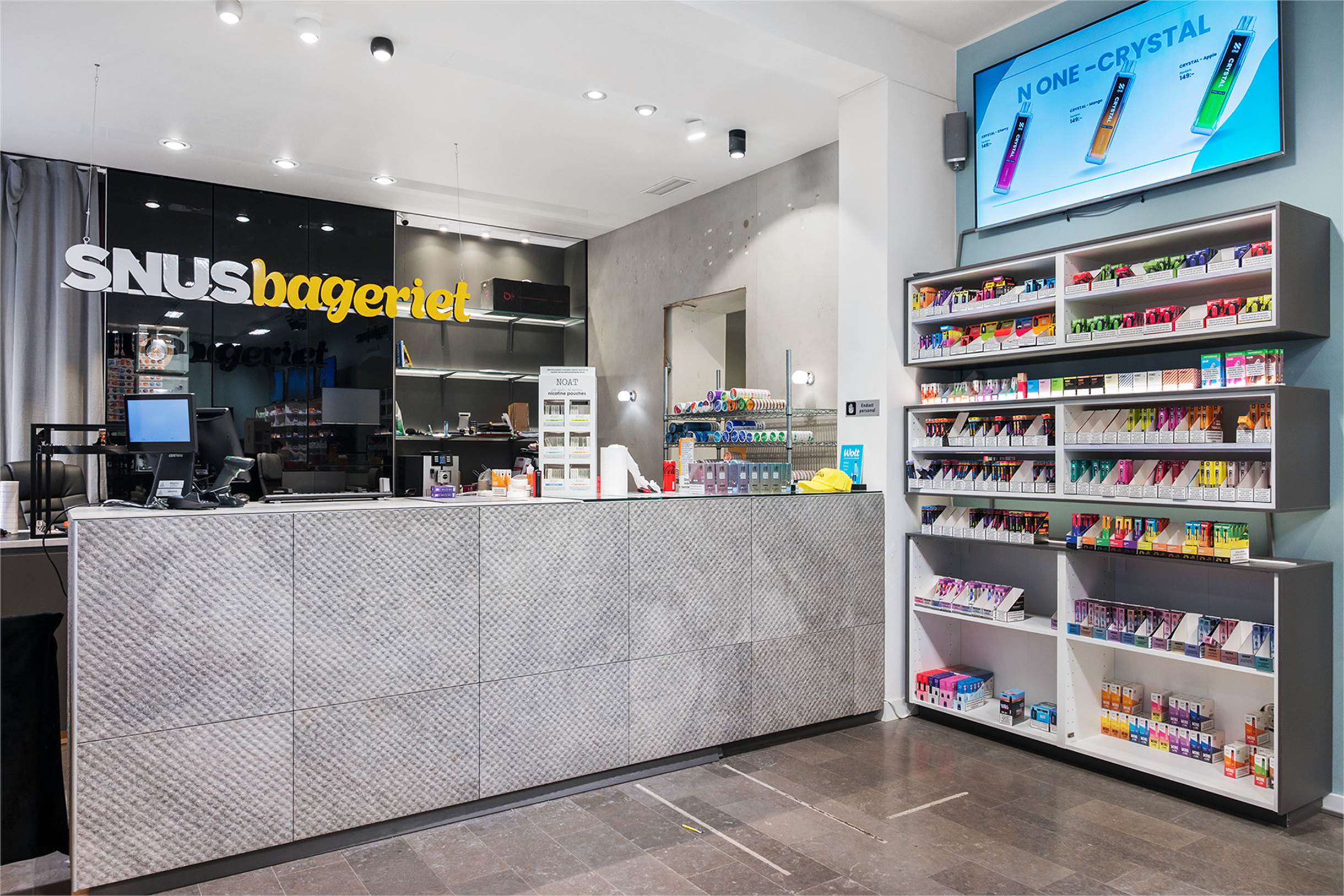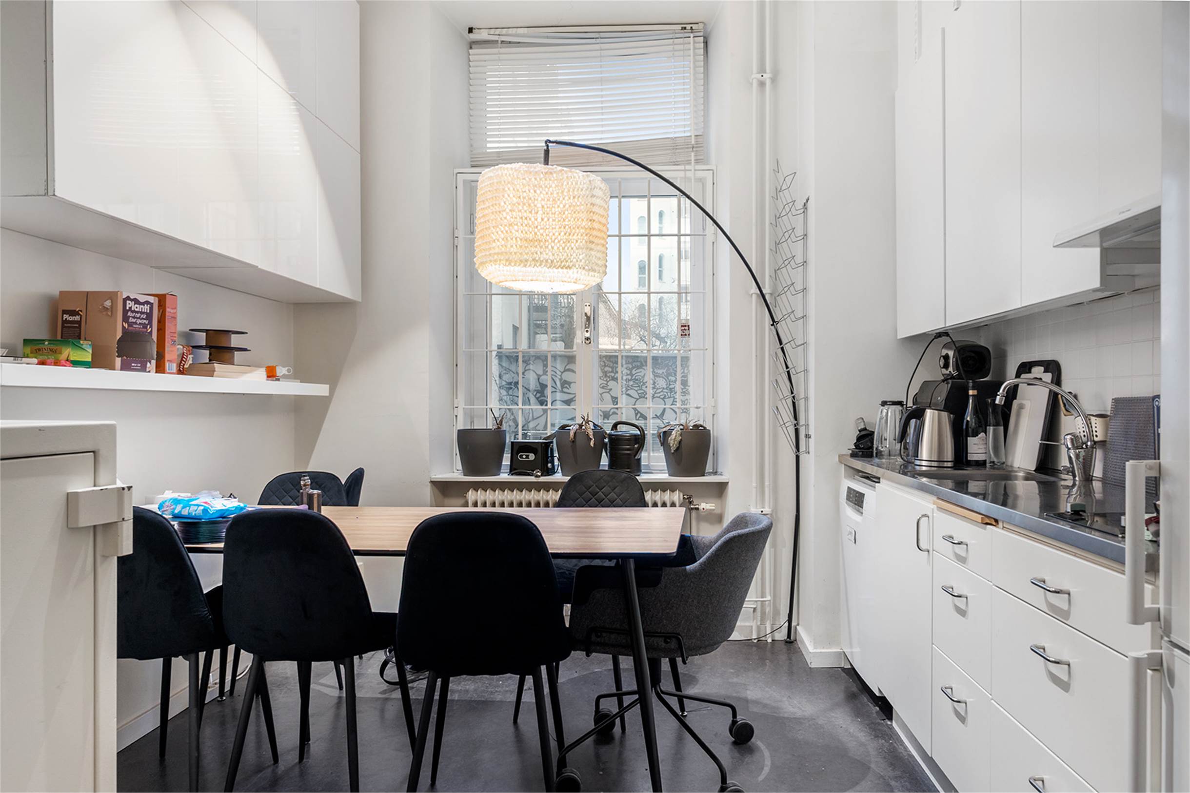 Butiksdelen har två stora rum med fönster både mot gatan och innergården på baksidan. Generösa ytor för exponering av varor samt kassa i rummen. Personalutrymme med ett rymligt kök som har matplats och pentry i anslutning till det bakre rummet. Pentryt är utrustat med diskmaskin, fullstor kyl och frys, två spisplattor och diskho. Gott om fövaringsmöjligheter finns i pentryts skåp. I anslutning till köket finns ett badrum med toalett och dusch i anslutning.