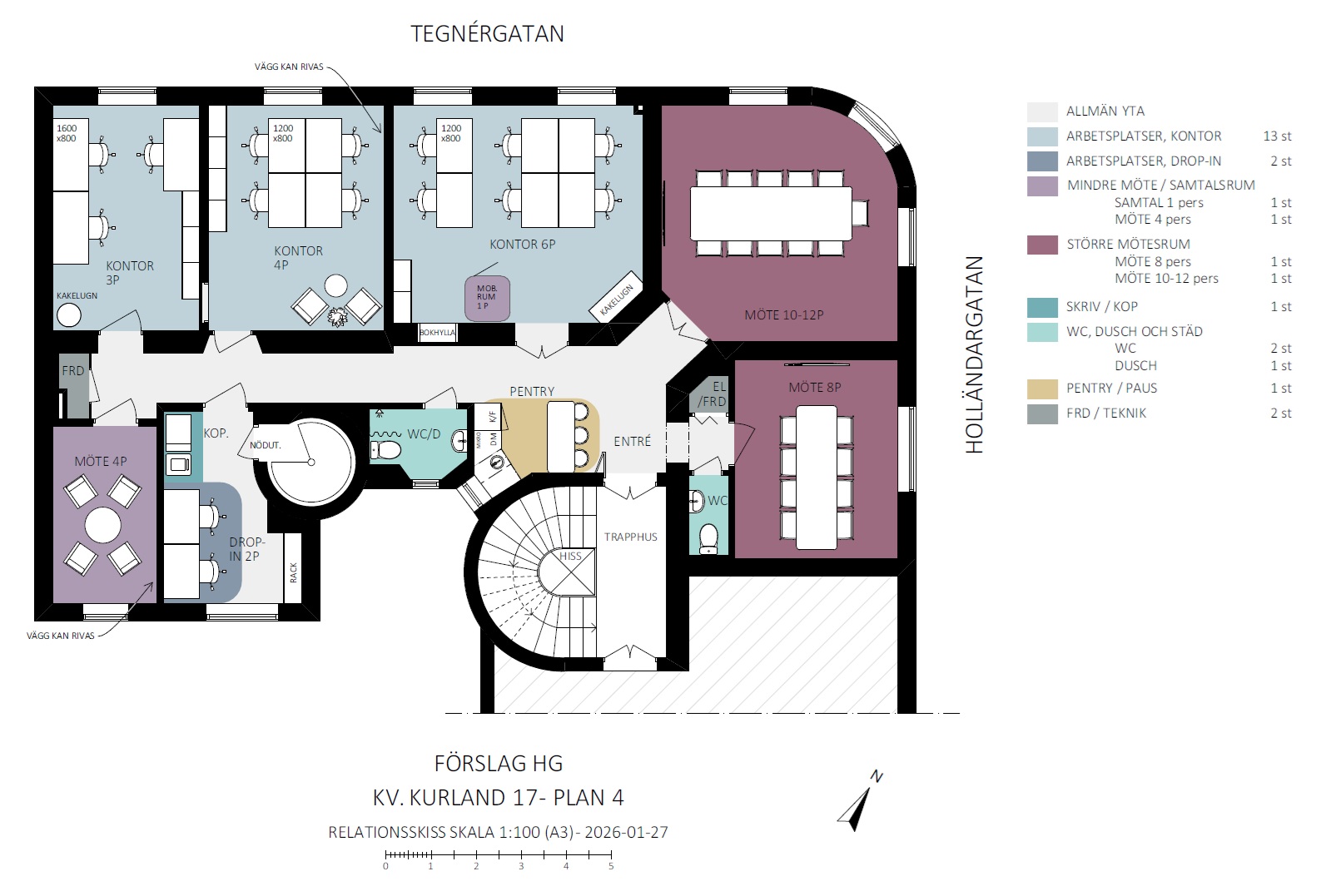 Lokalens planlösning är rumsindelad och fördelas på sju rum i varierande storlek varav ett med en vacker öppen spis. Hörnrummet är mycket representativt och det nyttjas idag som konferensrum. Övrig lokalarea fördelas på ett pentry i anslutning till entrén samt två wc varav en med dusch. Om ett rymligare pentry önskas eller en större besöksyta vid entrén så har lokalen på 2 trappor som även finn tillgänglig den planlösningen.
