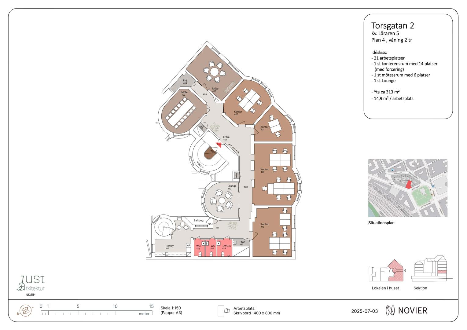 Större kontorsrum och mötesrum i lokalen, 3 st toaletter varav 1 med dusch. Ritning visar nuvarande planlösning.