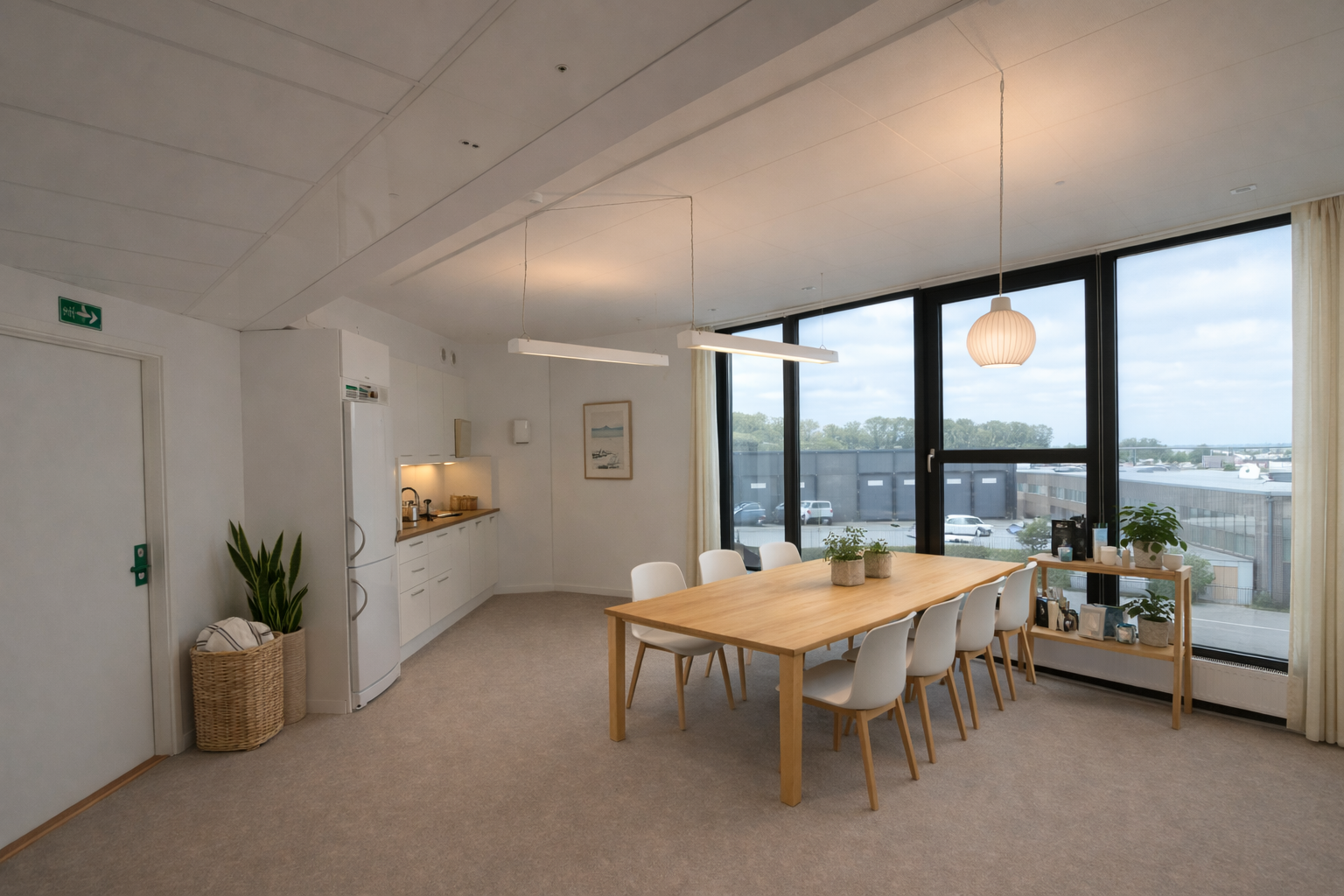 Köket/pausrummet är rymligt och har ett härligt ljusinsläpp med stora fönsterytor. I mittpartiet av lokalen finns funktioner som WC/dusch, WC, förråd och kapprum.