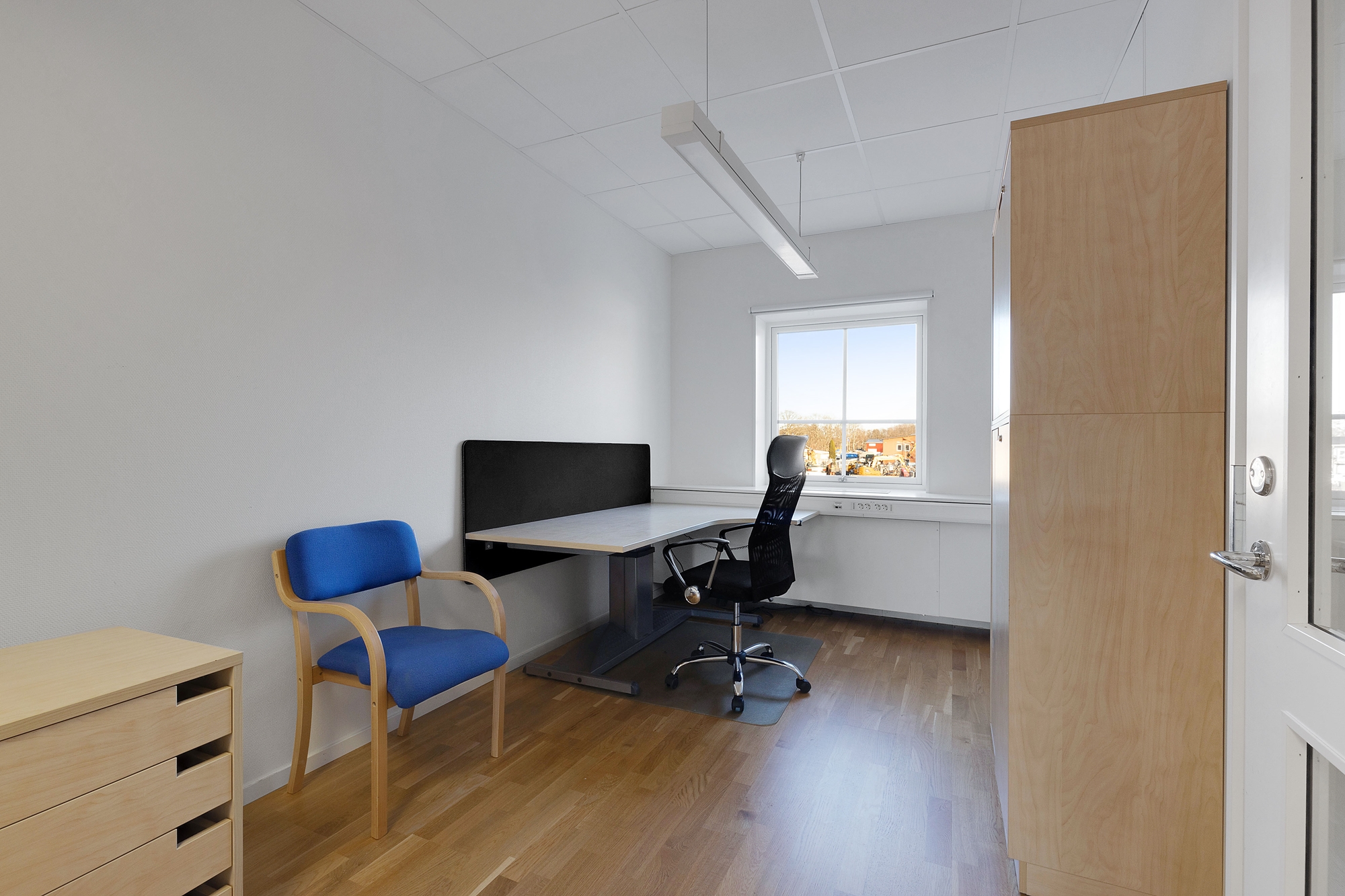 Kontorsrummet är möblerat med höj/sänkbart skrivbord, en hylla, besöksstol och besöksbord.