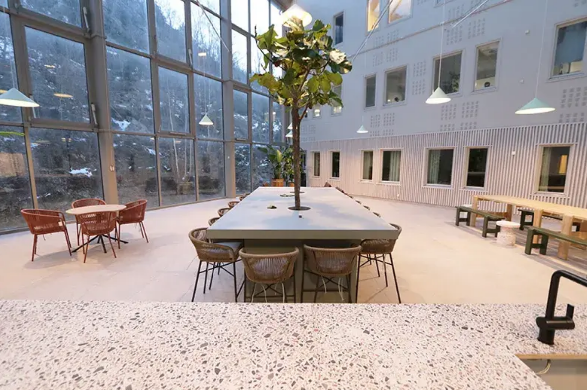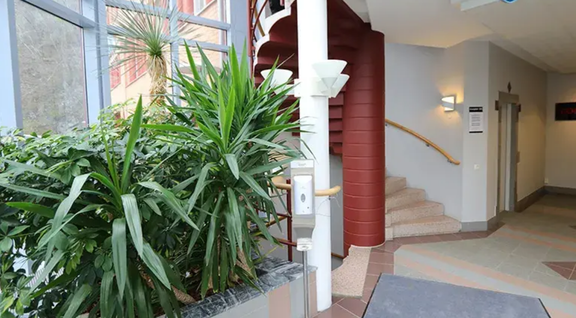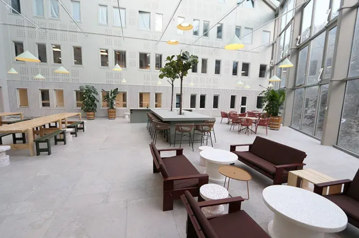 Kontoret nås via trapphus med hiss som även går direkt ner till fastighetens varmgarage i källarplan. I byggnaden finns dessutom en gemensam ljusgård som kan användas för utställningar och events för hyresgästerna.