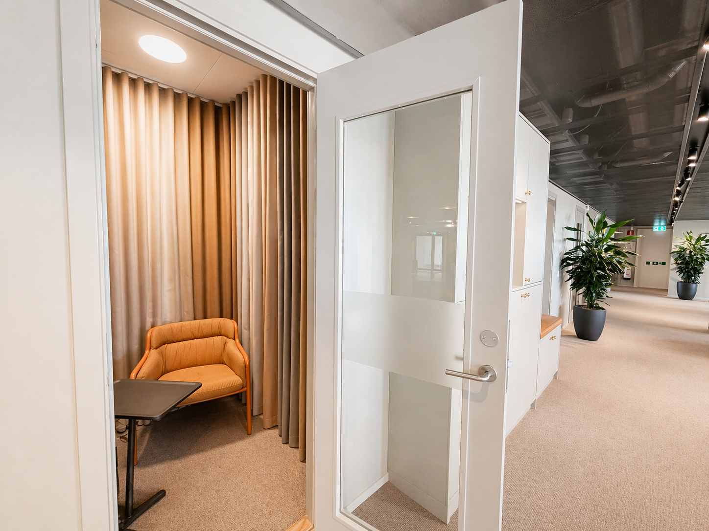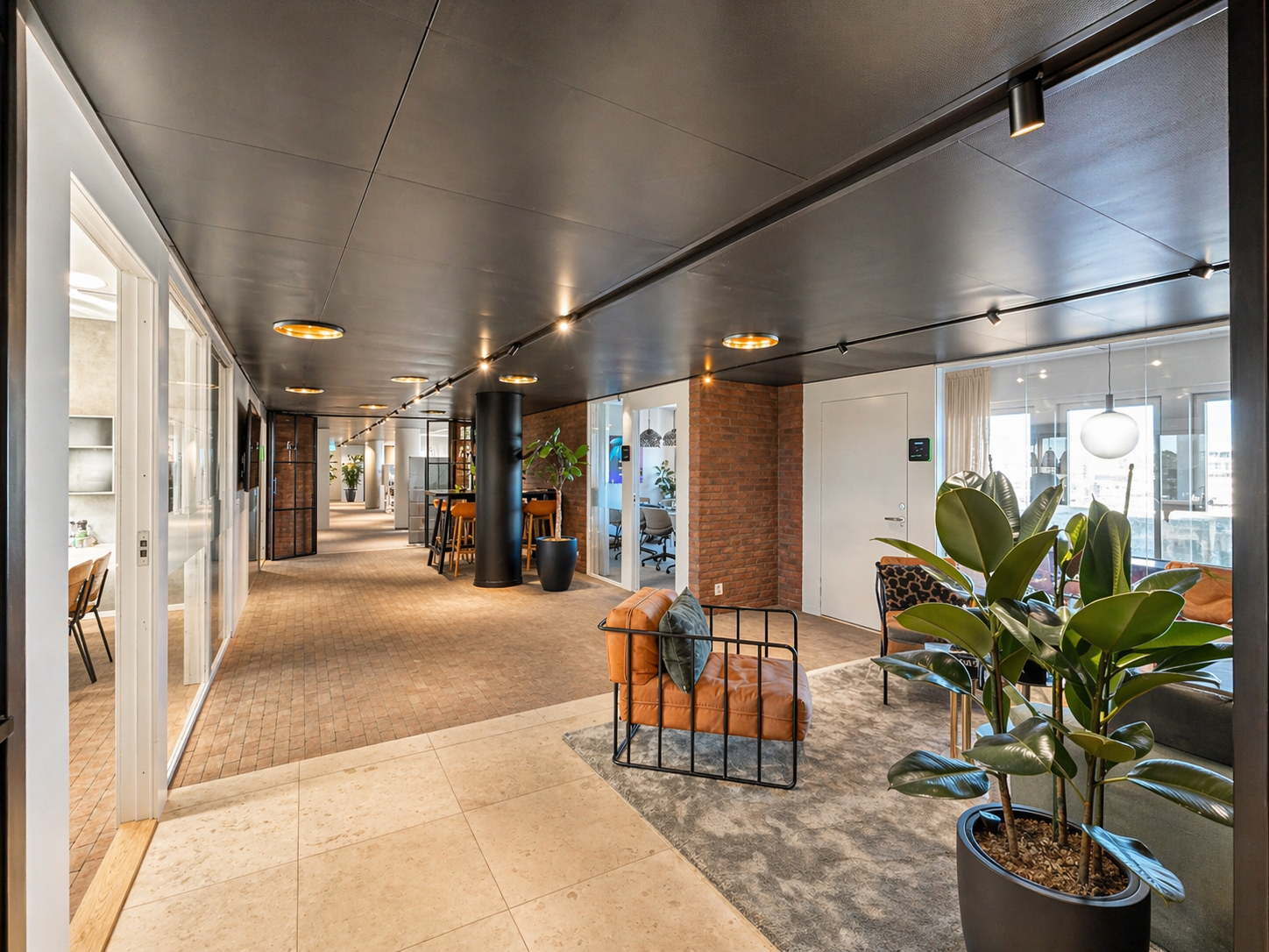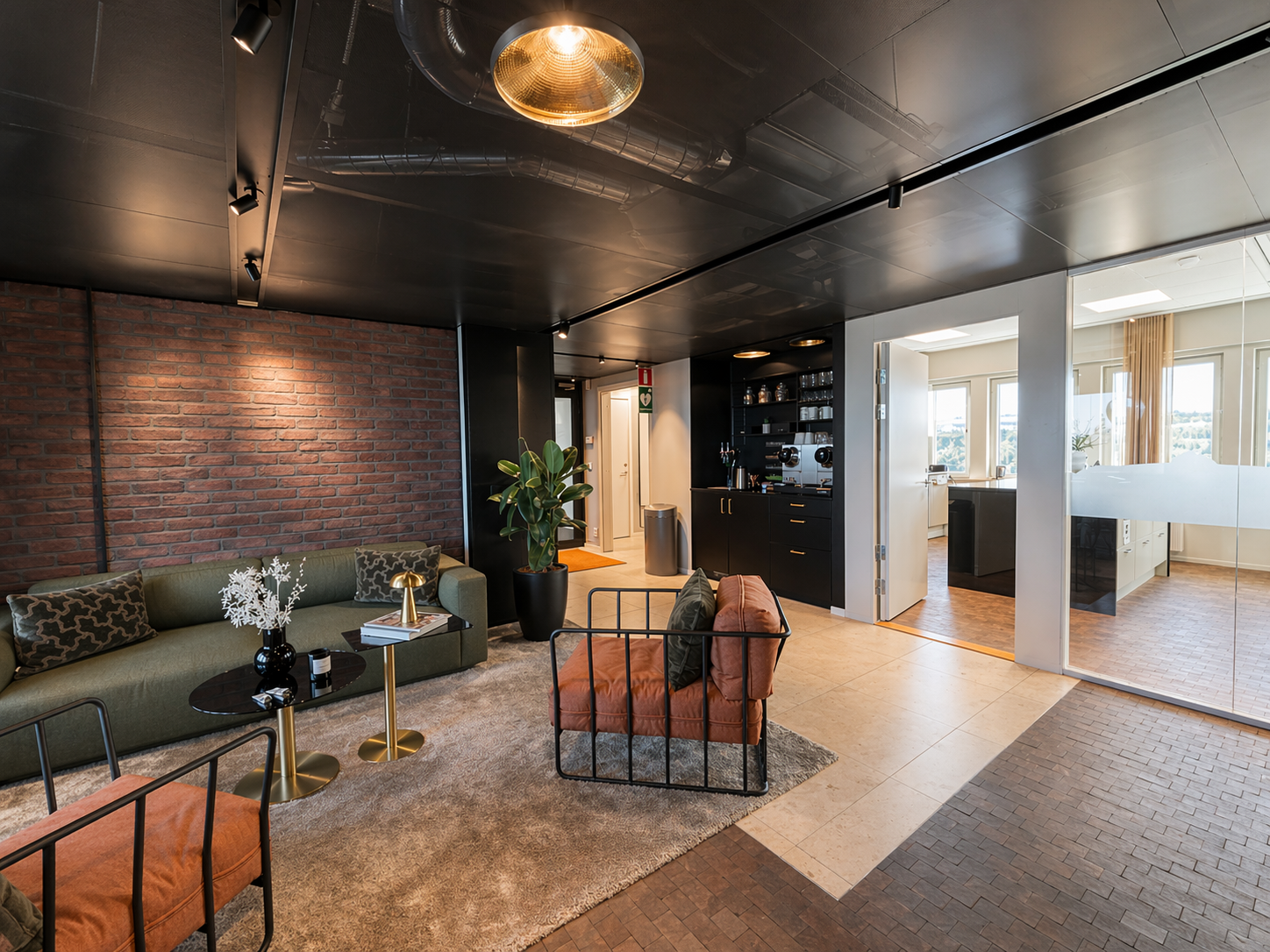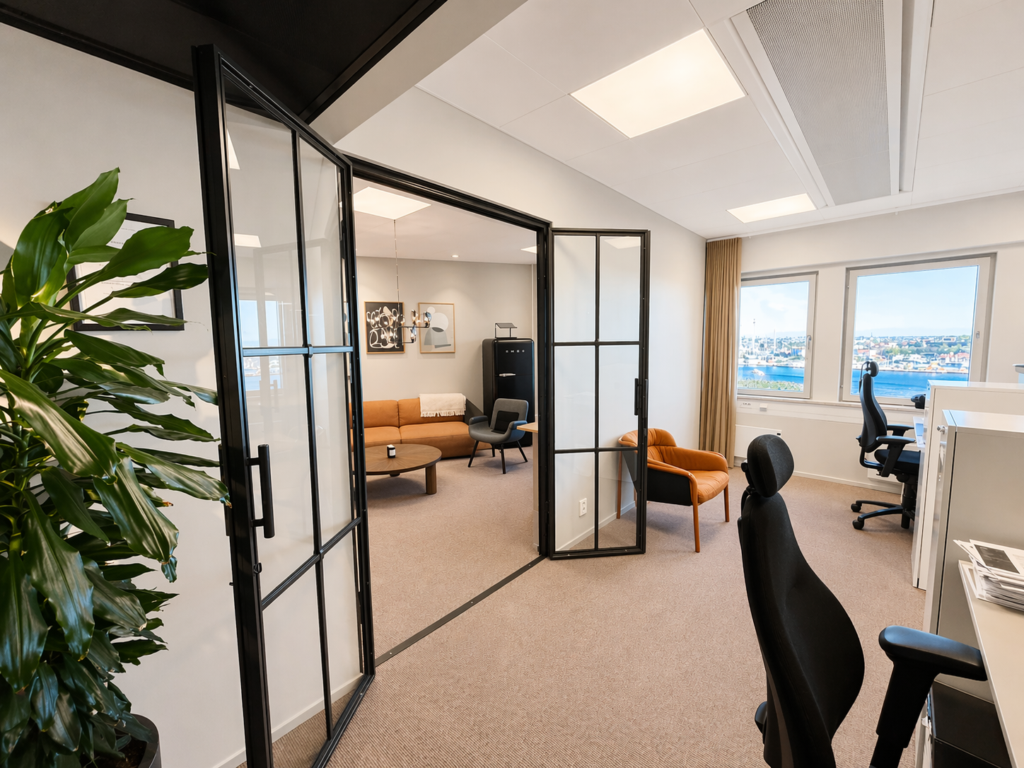 Den genomtänkta planlösningen erbjuder en optimal balans mellan öppna ytor och mer avskilda arbetsrum, vilket gör lokalen lika lämpad för representativa möten som för fokuserat arbete.