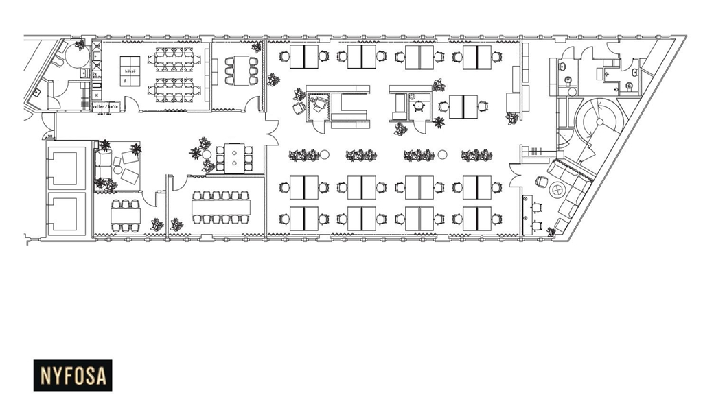 Lokalen är optimal för ett bolag om cirka 25 30 personer och erbjuder en välbalanserad mix av mindre samtalsrum och mötesrum för 6 14 personer perfekt för både spontana avstämningar och större presentationer. Utöver detta finns generösa ytor som lämpar sig väl för loungemiljöer och projektbord, vilket skapar goda förutsättningar för kreativa arbetsformer och nära samarbete mellan team. Det rymliga köket, med plats för flera sittande sällskap, utgör en naturlig samlingspunkt i lokalen en plats för både informella möten och gemenskap i vardagen. Lokalen är även välutrustad med tre WC, varav en RWC, två duschar, vilrum, städrum samt praktiska utrymmen för personlig förvaring. Det finns dessutom goda möjligheter att vara med och påverka lokalens utformning för att anpassa den efter just er verksamhets behov.