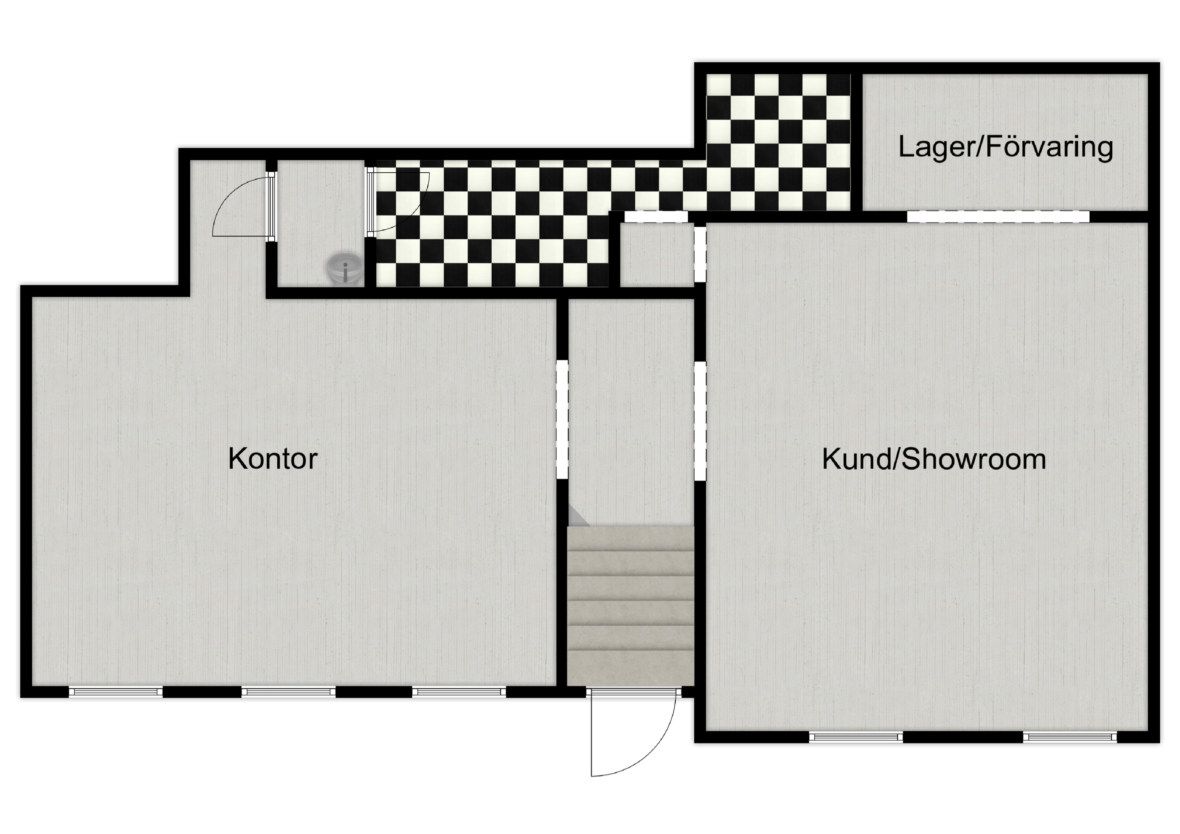 Om totalt 95 kvadratmeter disponeras ytan över två generösa rum i nästintill identisk storlek – en planlösning som lämpar sig utmärkt för showroom, butik eller ett representativt kontor. Här finns även WC samt pentry/personalyta, vilket skapar god funktionalitet för den dagliga verksamheten.