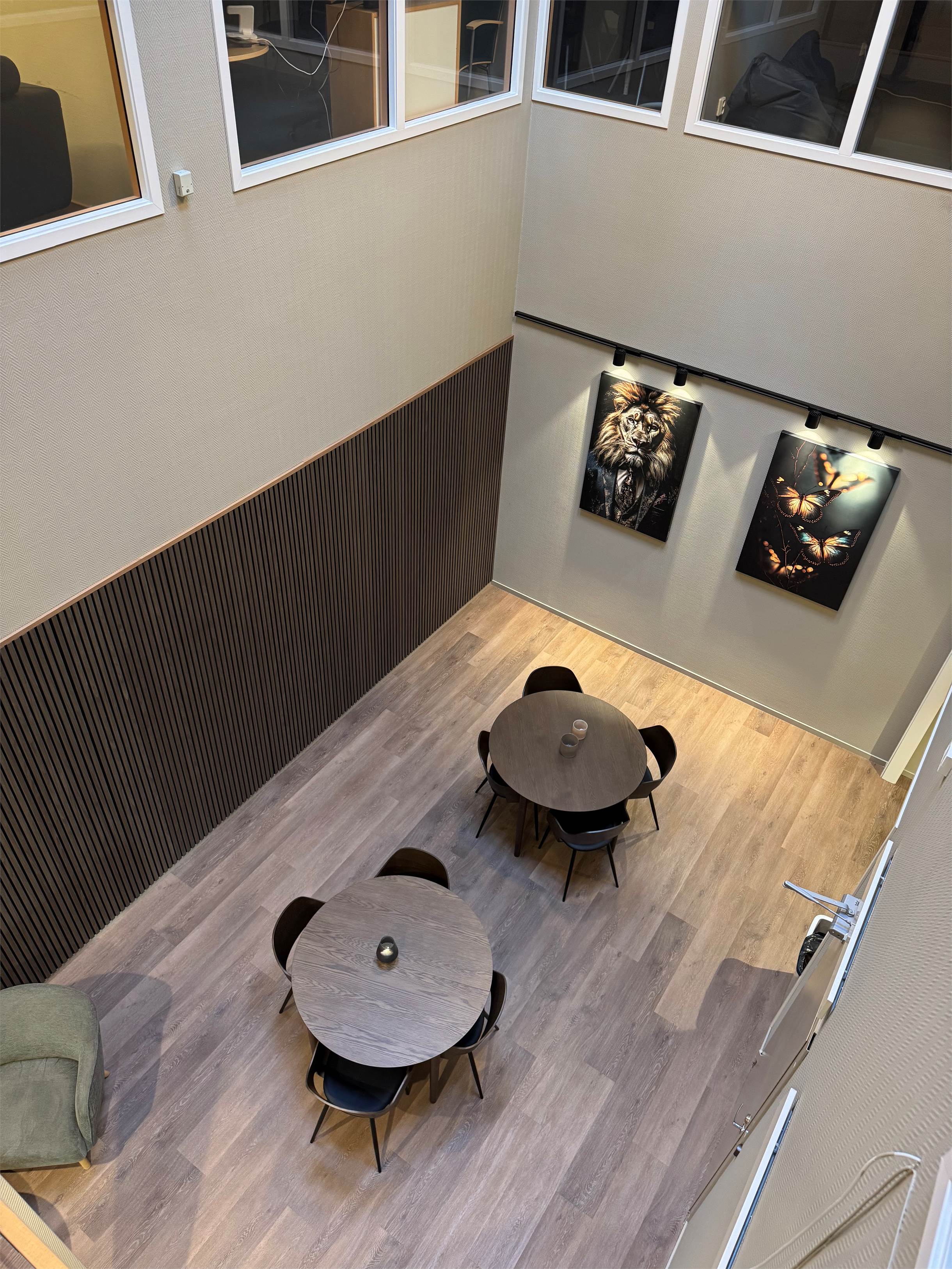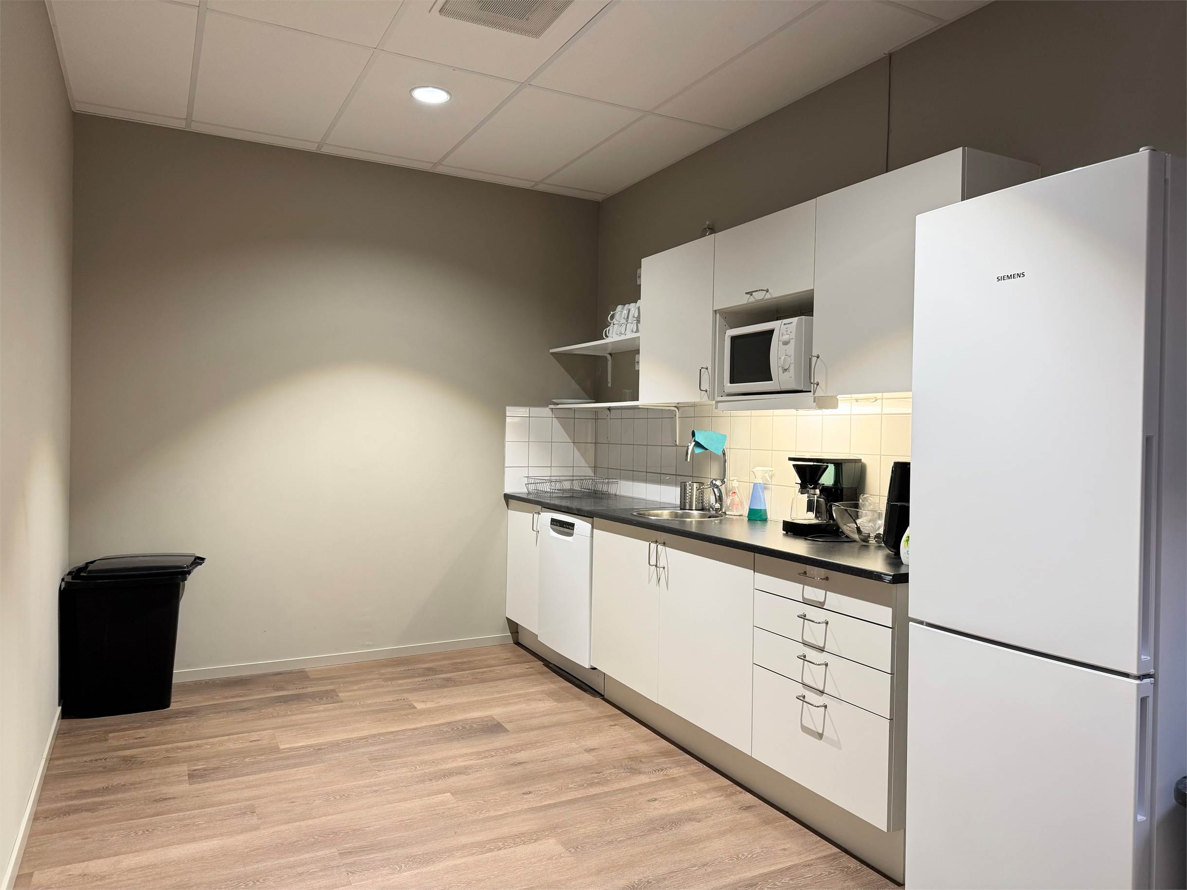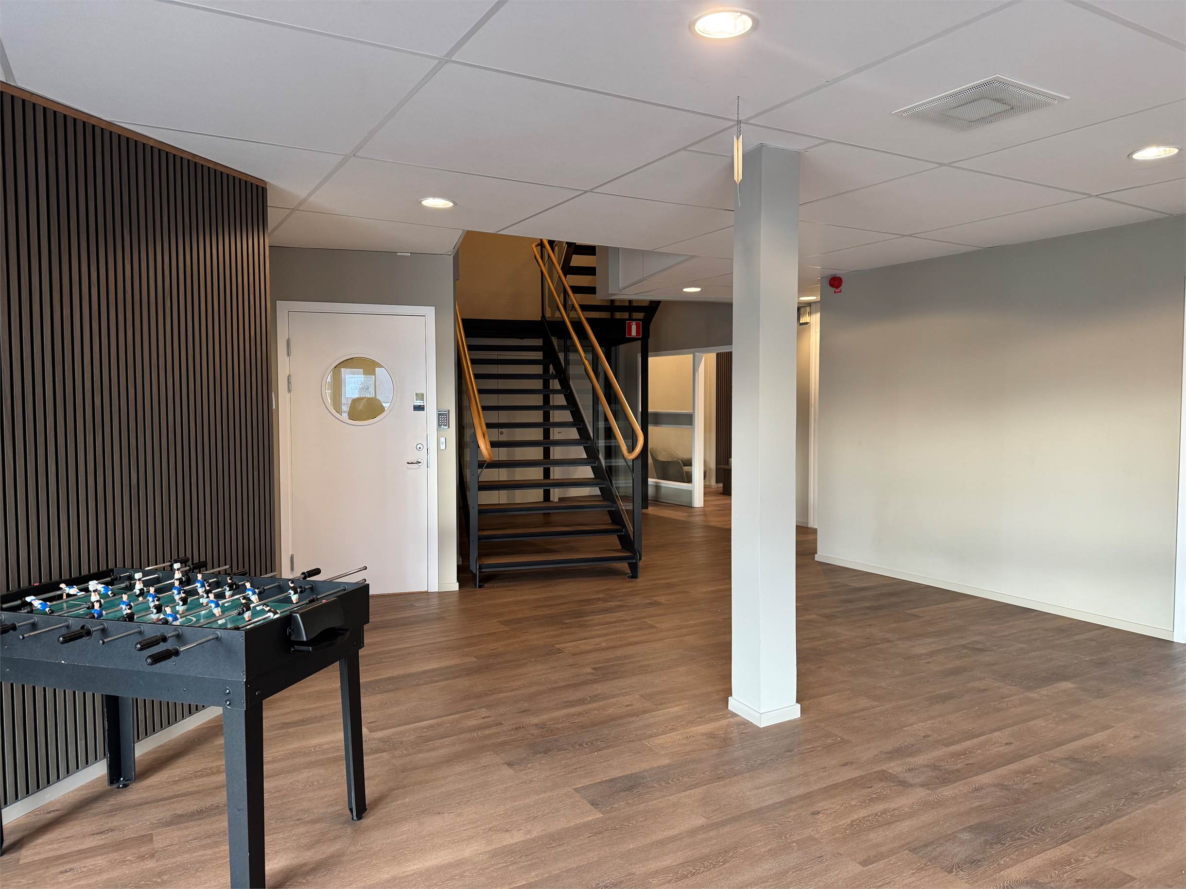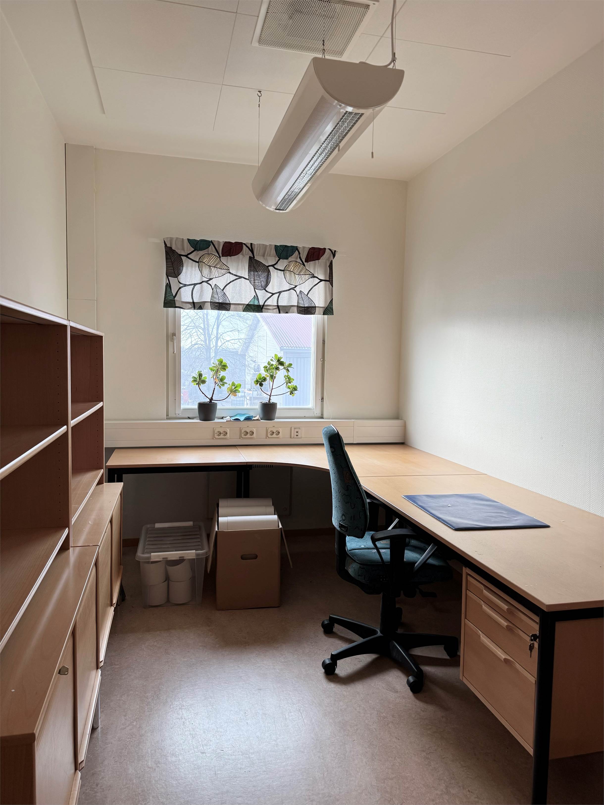 Kontoret är rumsindelat med 8 kontor och ett mötesrum. Hyresgästerna delar på gemensamma ytor med kök och WC på bottenvåningen. Det finns även WC på samma våningsplan som lokalen.