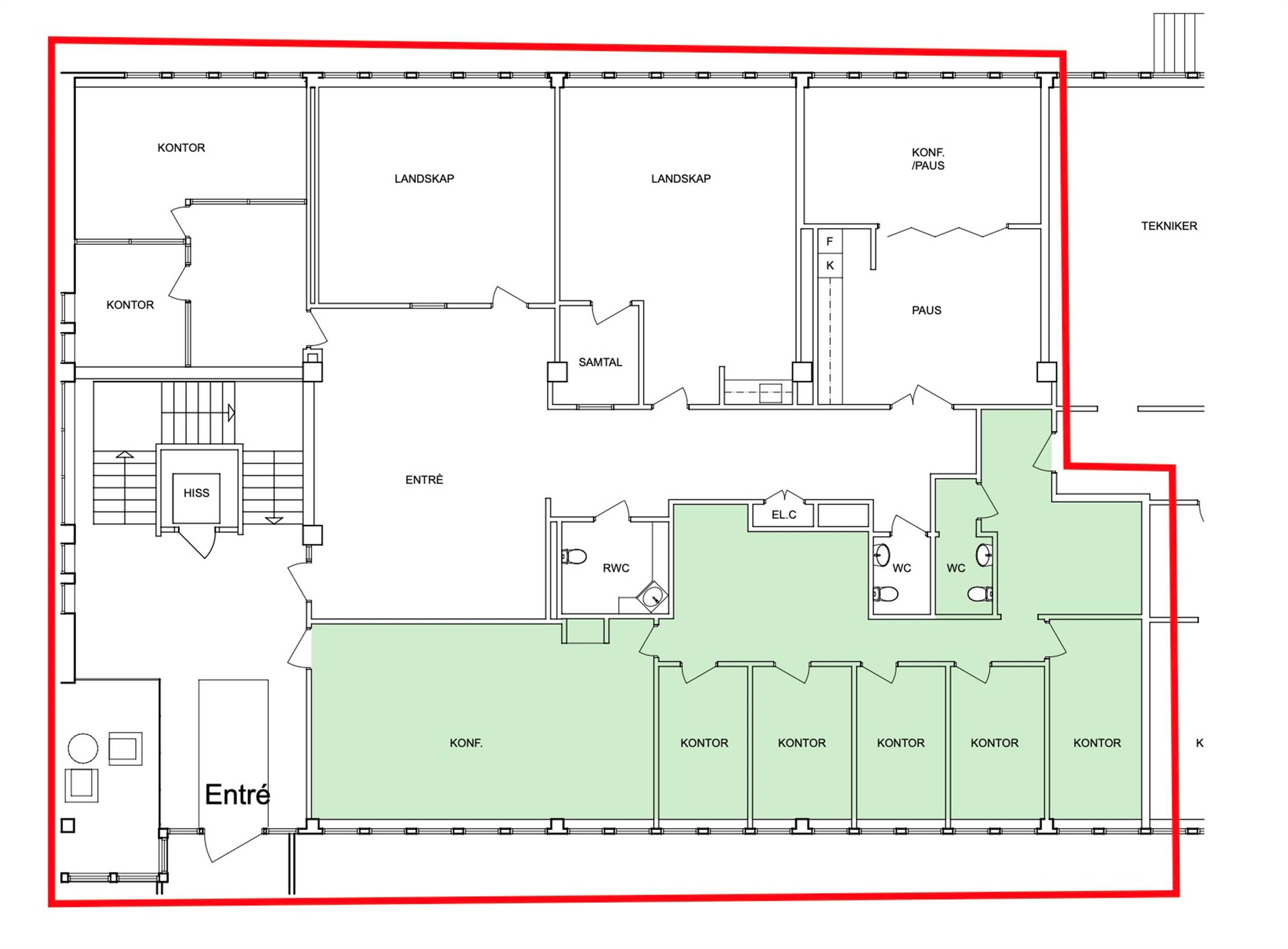 Kontoret kan hyras ut som ett större kontor om 378kvm eller som två mindre kontor om 248 samt 130 kvm.