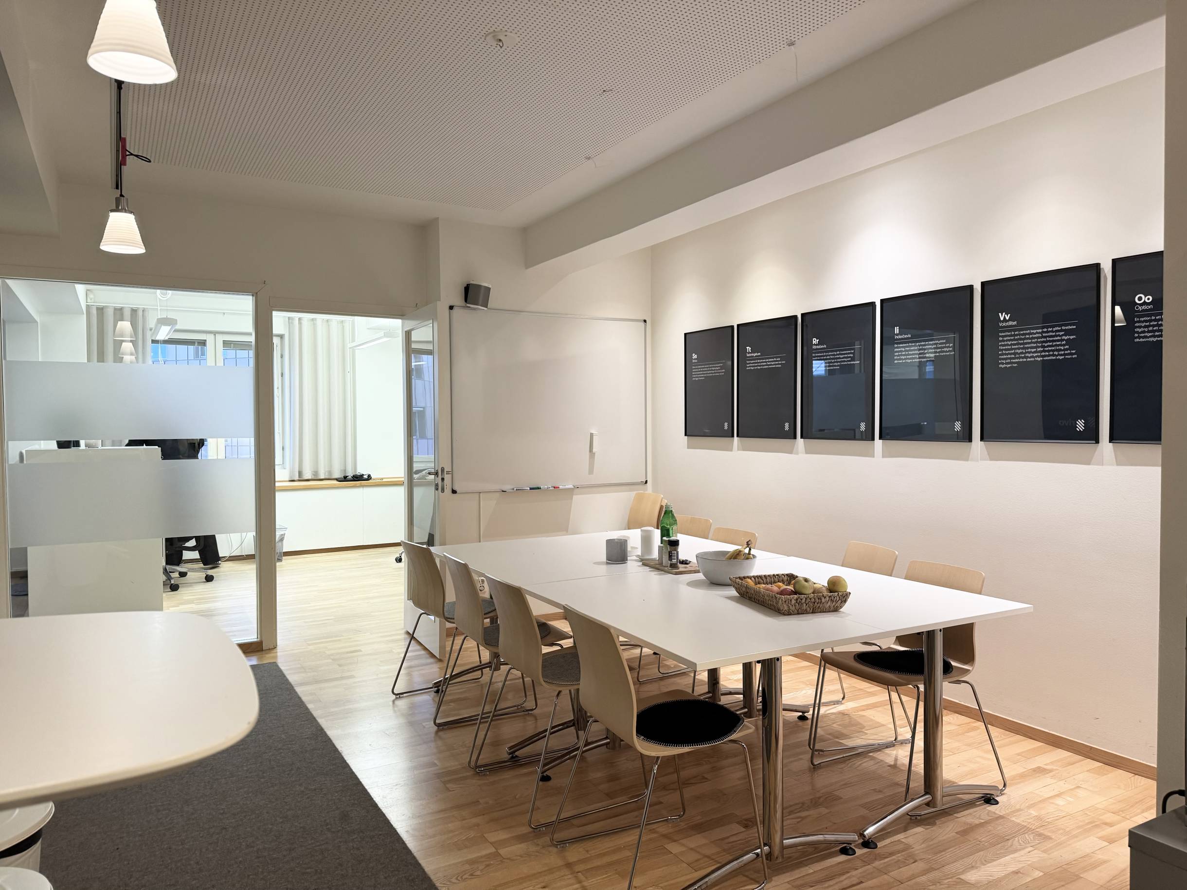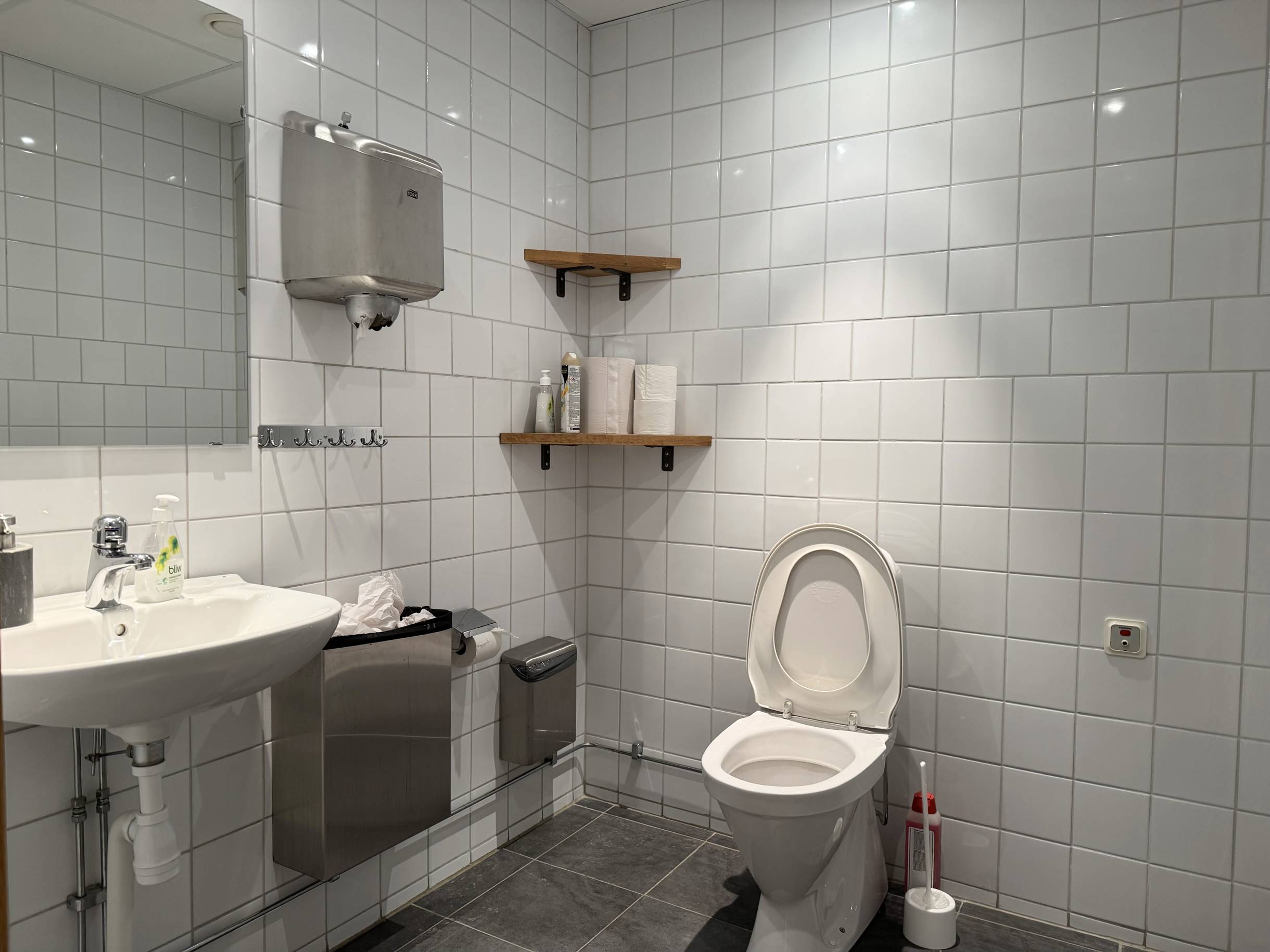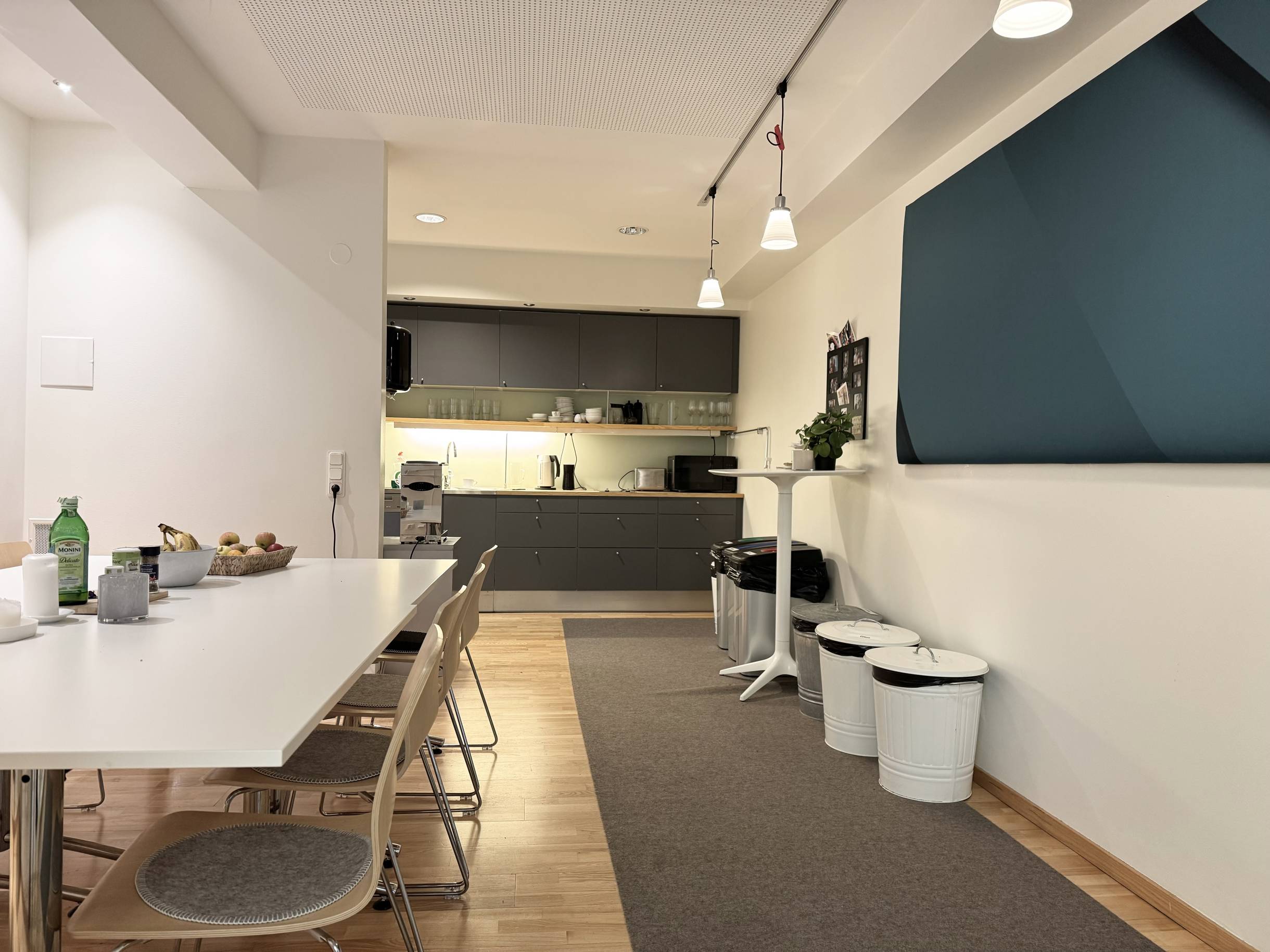 Köket med matplatser blir en naturlig samlingspunkt för medarbetarna och bidrar till en trivsam arbetsmiljö. Lokalen erbjuder hög flexibilitet och kan delas upp i två separata kontor.