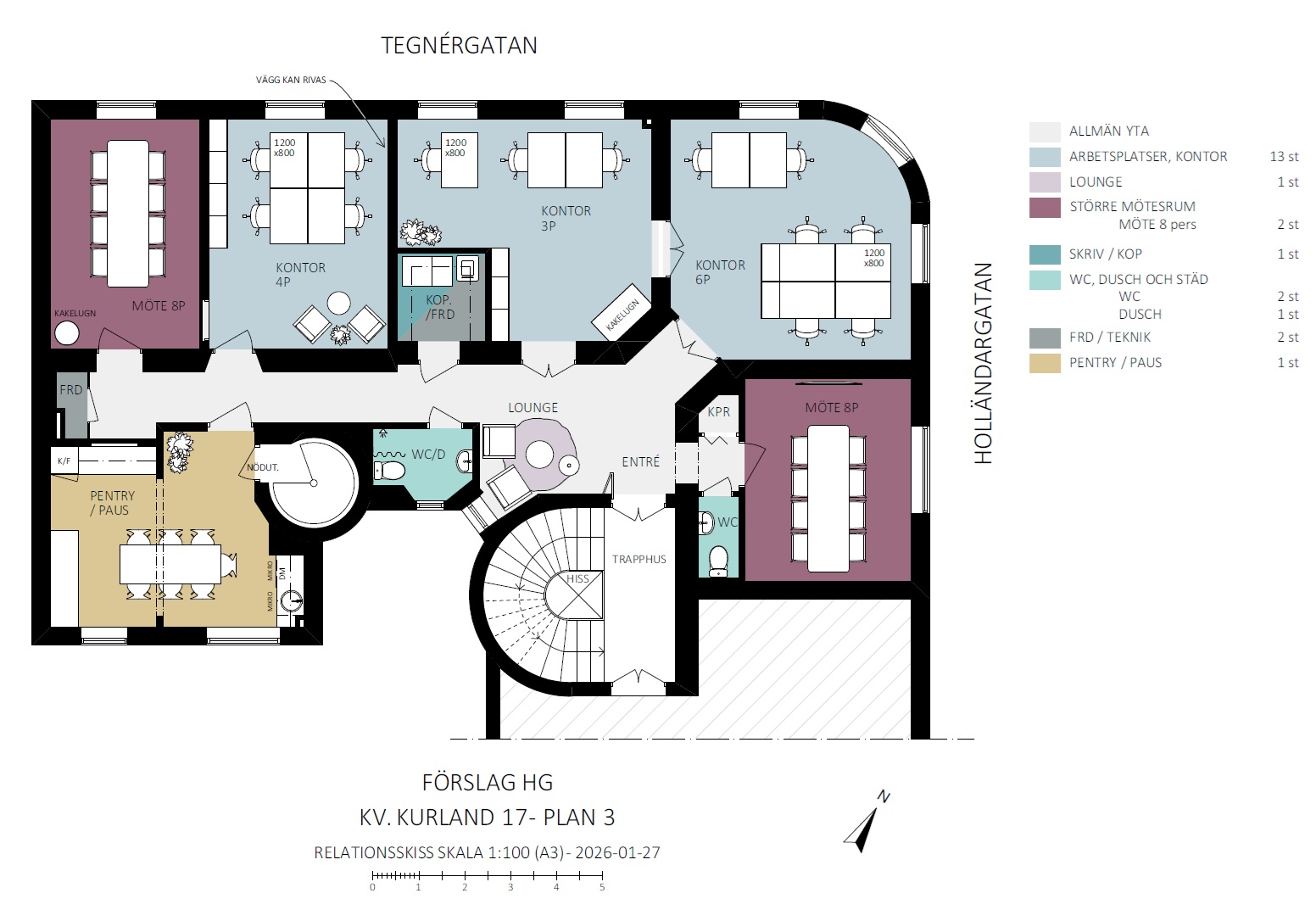 Lokalens planlösning är rumsindelad fördelat på fem rum i varierande storlek varav ett med en vacker kakelugn. Hörnrummet är mycket representativt och kan nyttjas som konferensrum såväl som arbetsrum. Övrig lokalarea fördelas på ett rymligt pentry med matplats, en välkomnande entréyta, med plats för väntande besökare samt två fräscha WC varav en med dusch.
