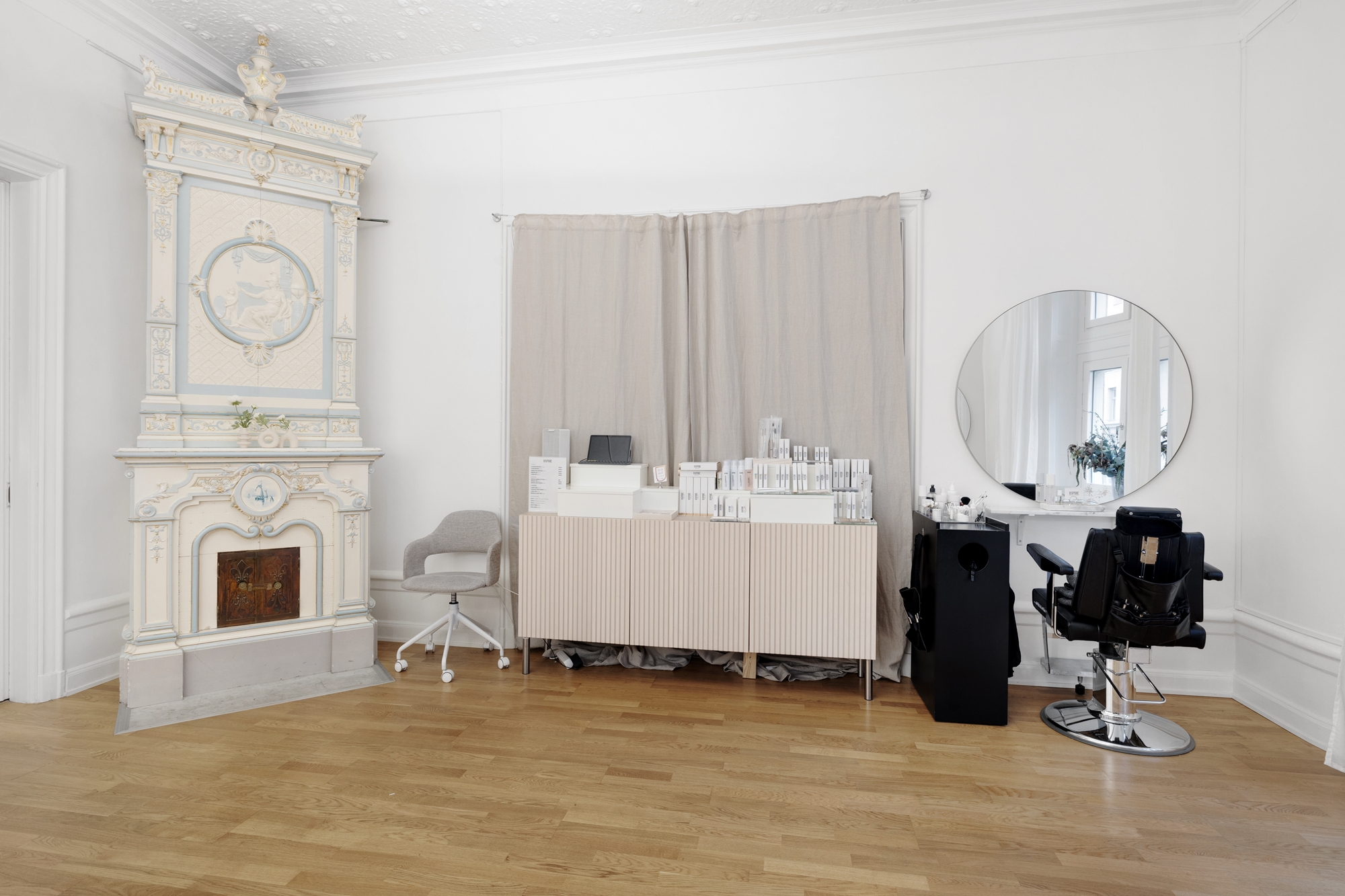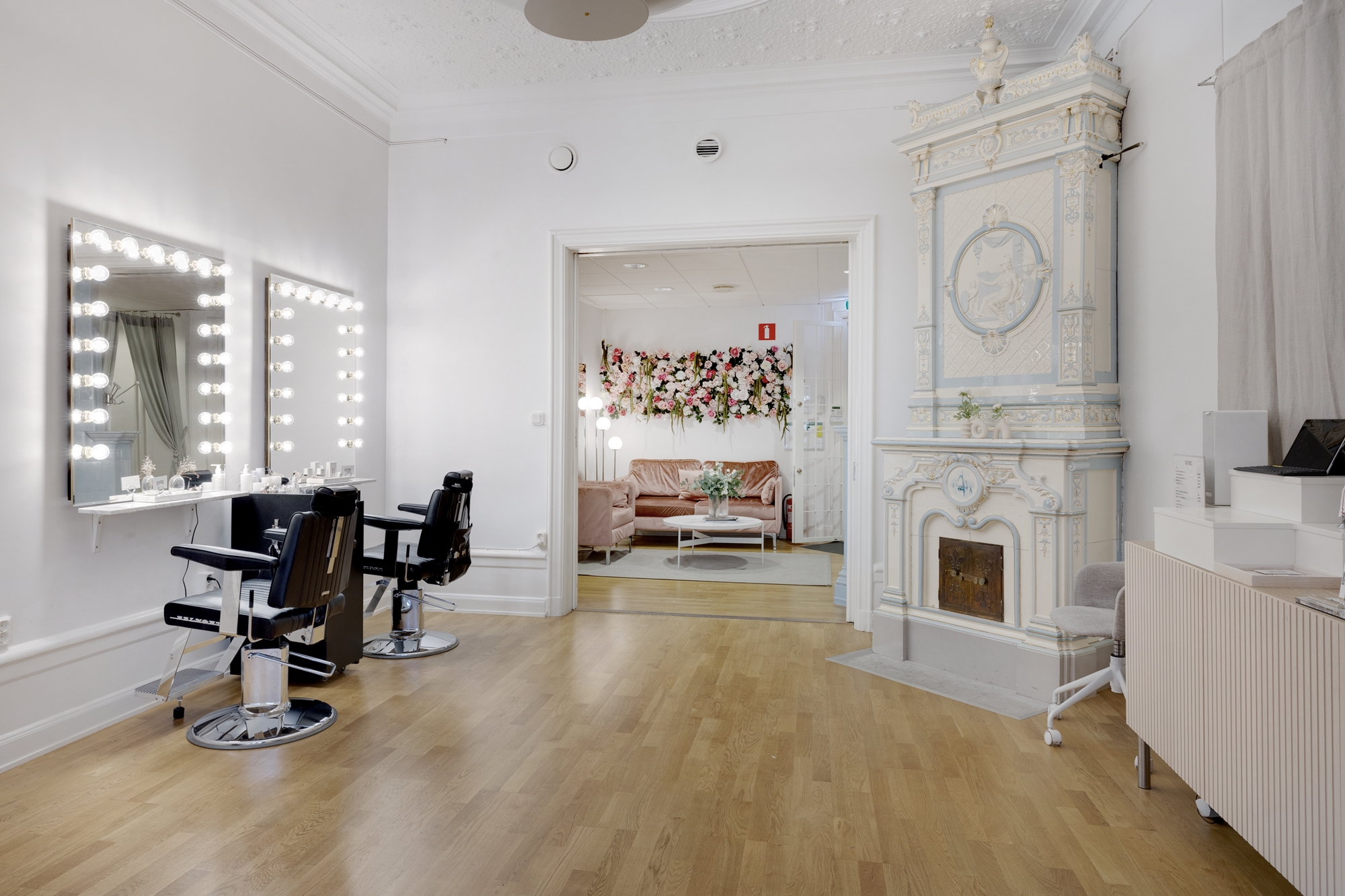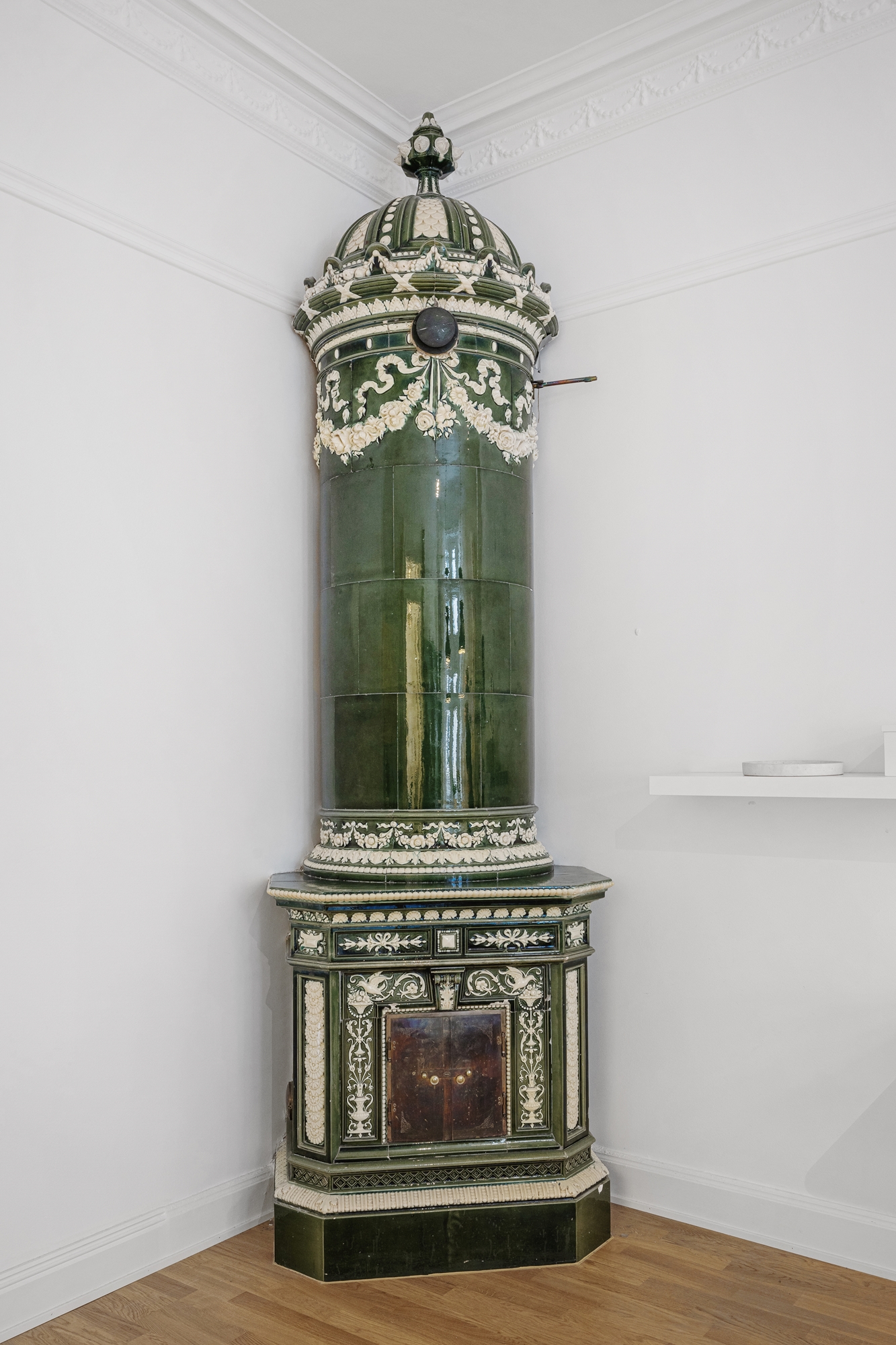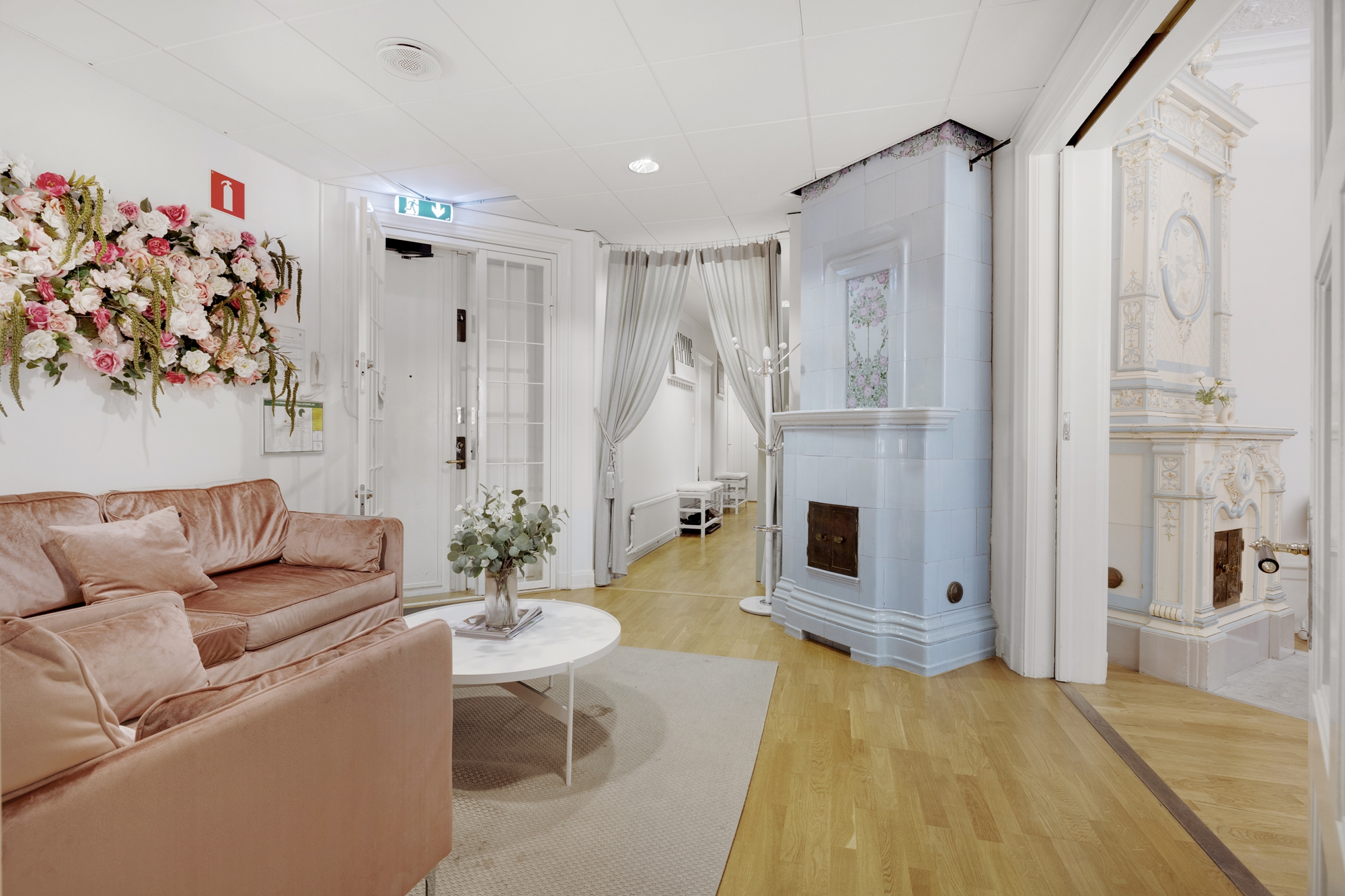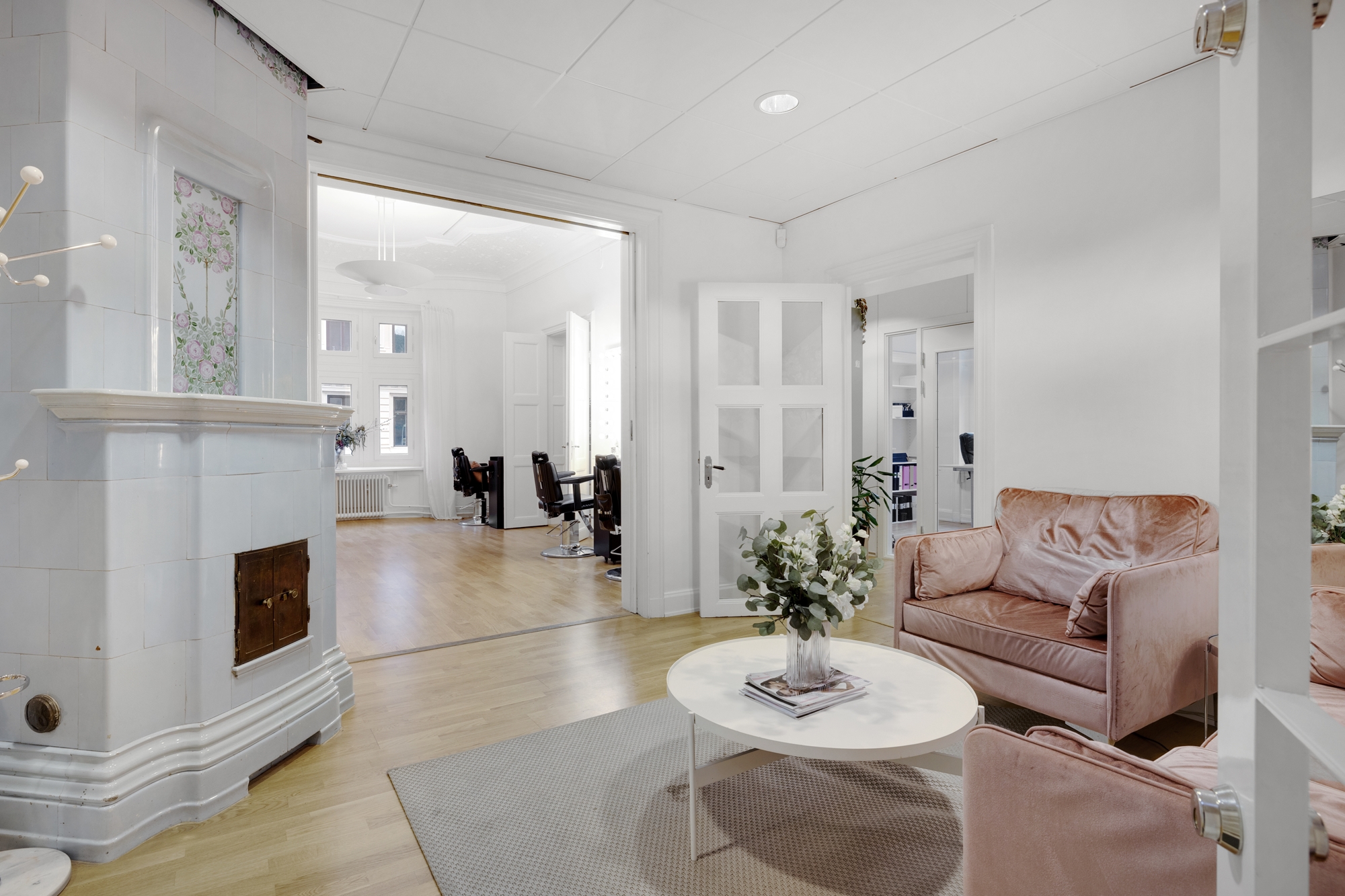 - Välbevarade detaljer med kakelugnar och högt i tak