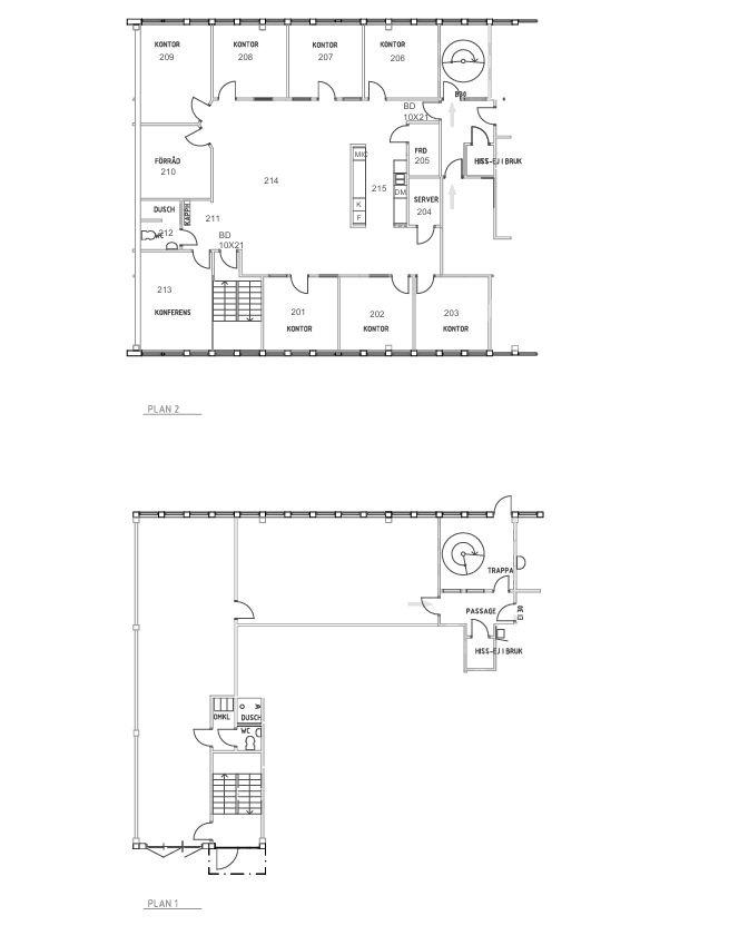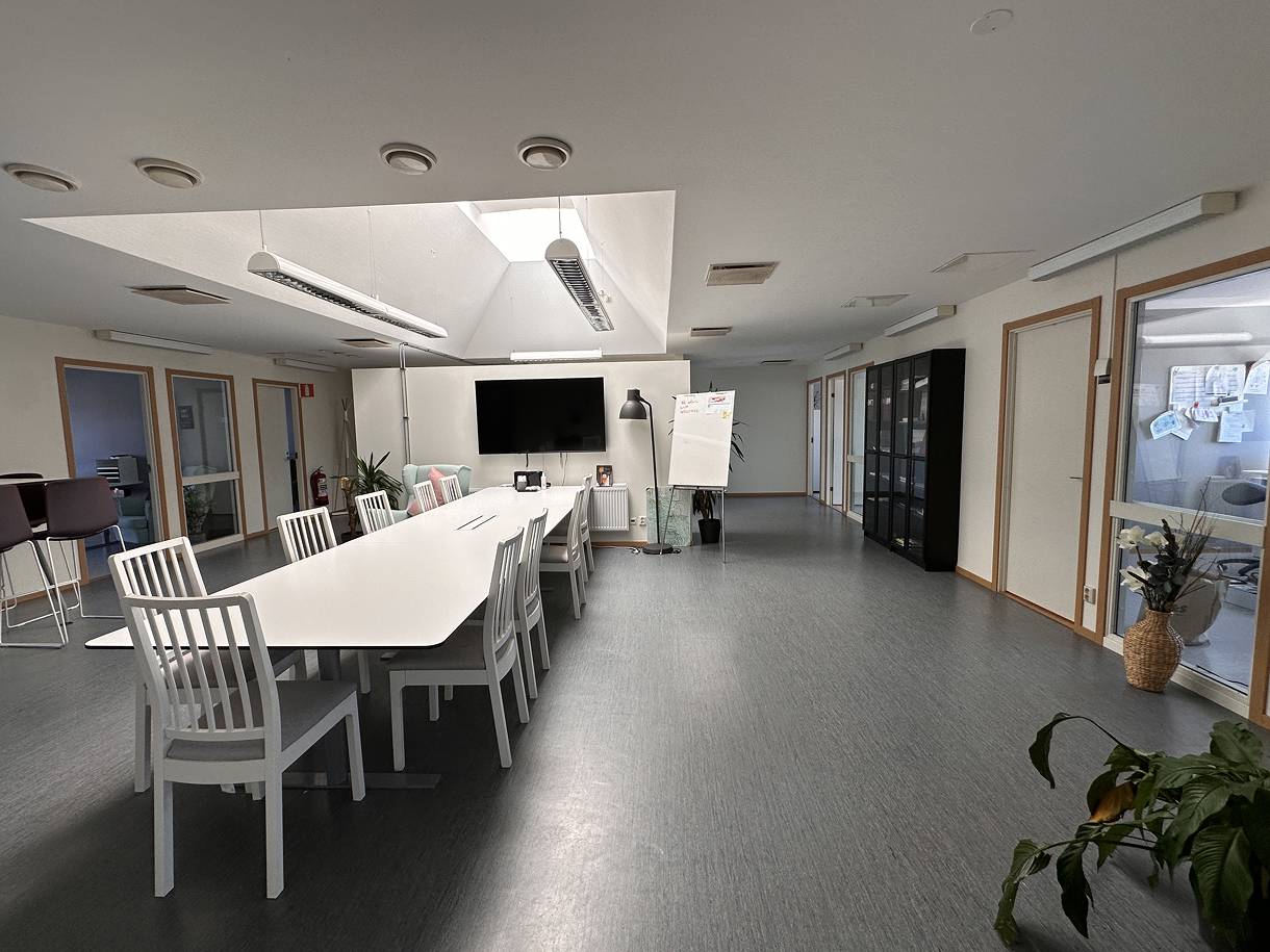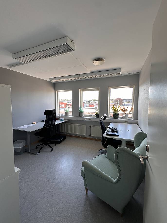 Kontoret på plan 2 erbjuder en ljus och trivsam arbetsmiljö med hela 9 kontorsrum i varierande storlek. Flera av rummen kan användas som grupprum eller för flera arbetsplatser, vilket ger stor flexibilitet. Här finns även en större gemensam yta med kök/pentry som lämpar sig väl för pauser och samarbete.