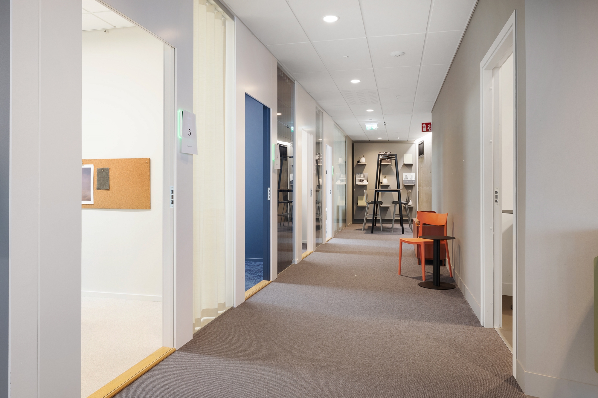 Överlag en öppen planlösning. Tre stycken mindre mötesrum och tre stycken större mötes/konferensrum.