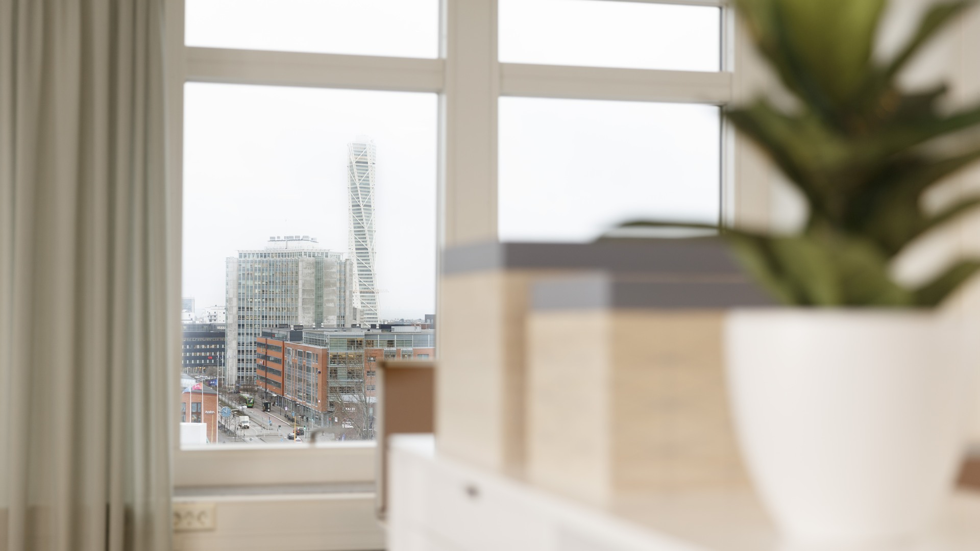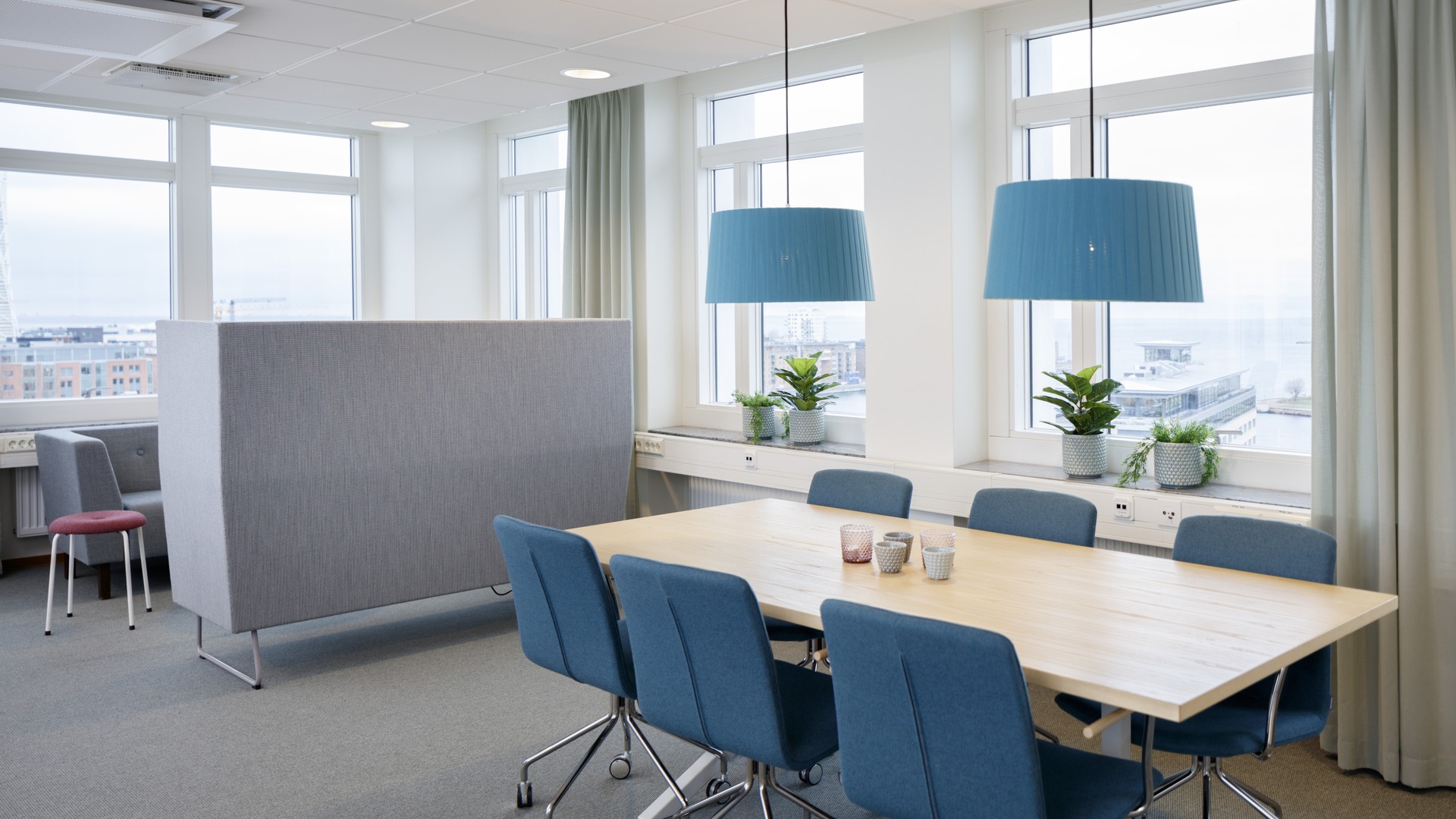 Öppen arbetsyta med möblerad sittgrupp och generöst ljusinsläpp. Arbetsplatser i ljus miljö med plats för samarbete och fokus. Fastigheten i Nyhamnen – centralt läge nära city och stationen. Loungeyta för pauser, samtal och informella möten.. Möblerade arbetsplatser med flexibel planering. Pentry med förvaring och plats för kaffe och pauser. Detaljbild med utsikt över Malmö och Sundet. Utsikt över Nyhamnen och Malmös stadskärna. Vidsträckt vy över Malmö med stad och vatten i blickfånget.