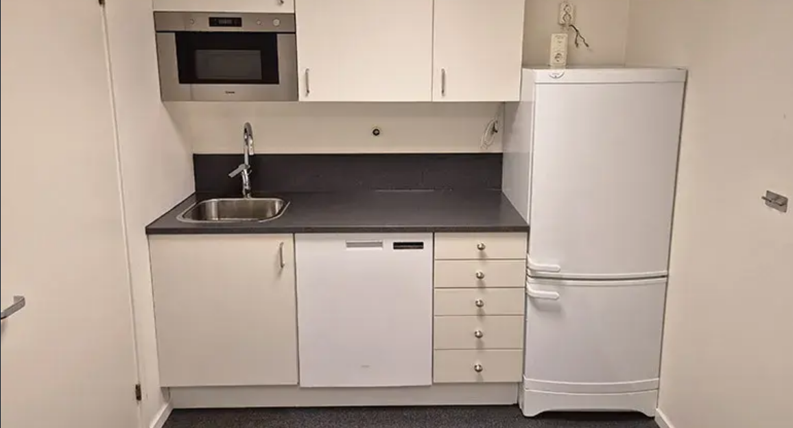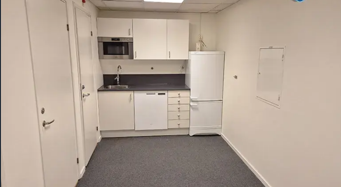 Här finns pentry, två WC, separat dusch samt förråd – en praktisk lösning som passar både det mindre företaget och den växande verksamheten. Generöst med fönster ger ett fint ljusinsläpp och de genomgående textilgolven bidrar till en behaglig ljudmiljö.