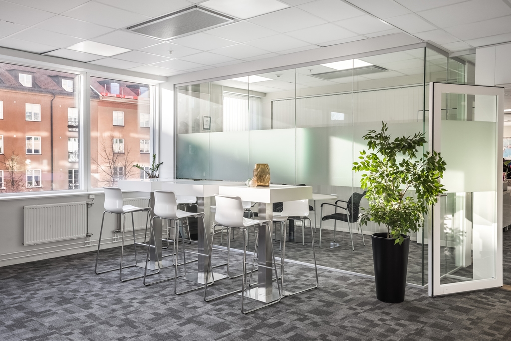 Konferensrum av varierande storlek ligger bekvämt disponerade över ytan. Flexibla och rymliga kontorsytor för att kunna sitta tillsammans i landskap eller i projektteam. Den öppna känslan förstärks av glaspartier in mot mötesrummen, och mot det stora pentryt som är lokalens hjärta.