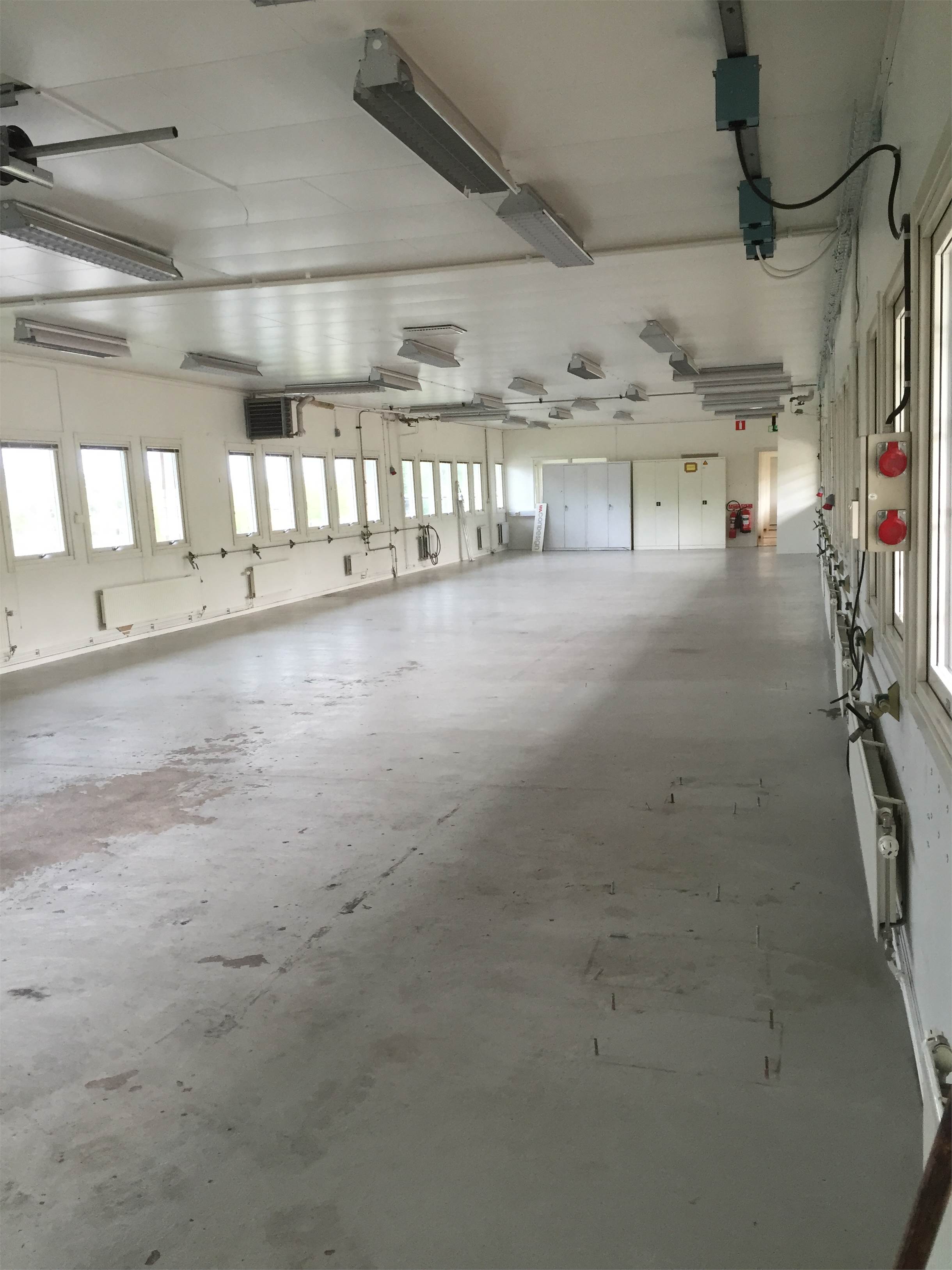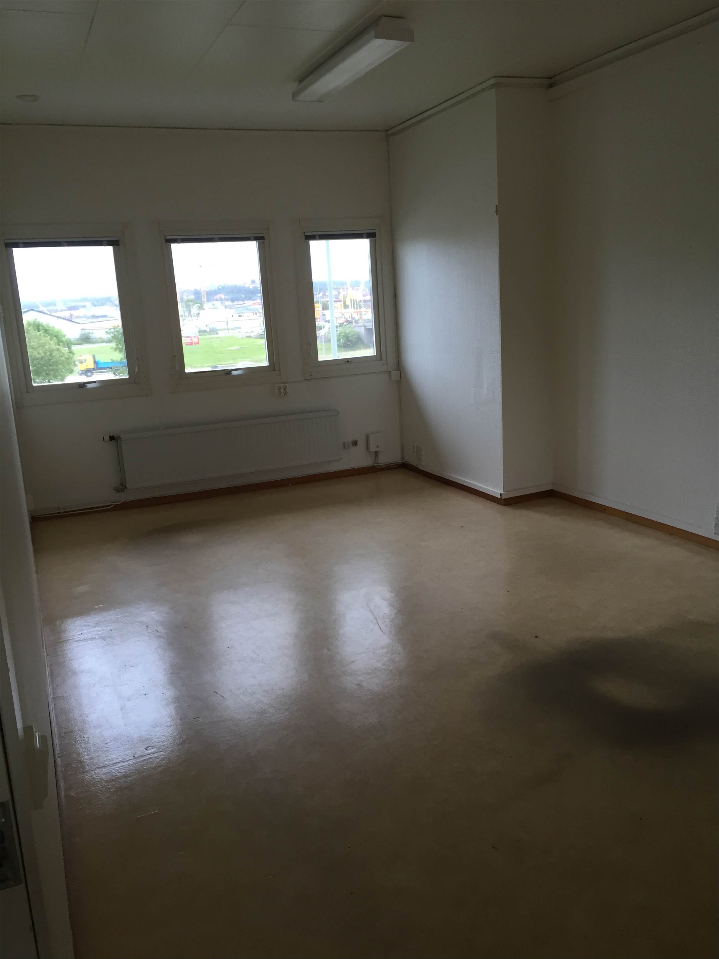 Kontorsdelen om ca 77 kvm erbjuder två separata kontor – ett större och ett mindre – samt två duschar med omklädningsrum, WC, och ett kök med pentry och matplats.