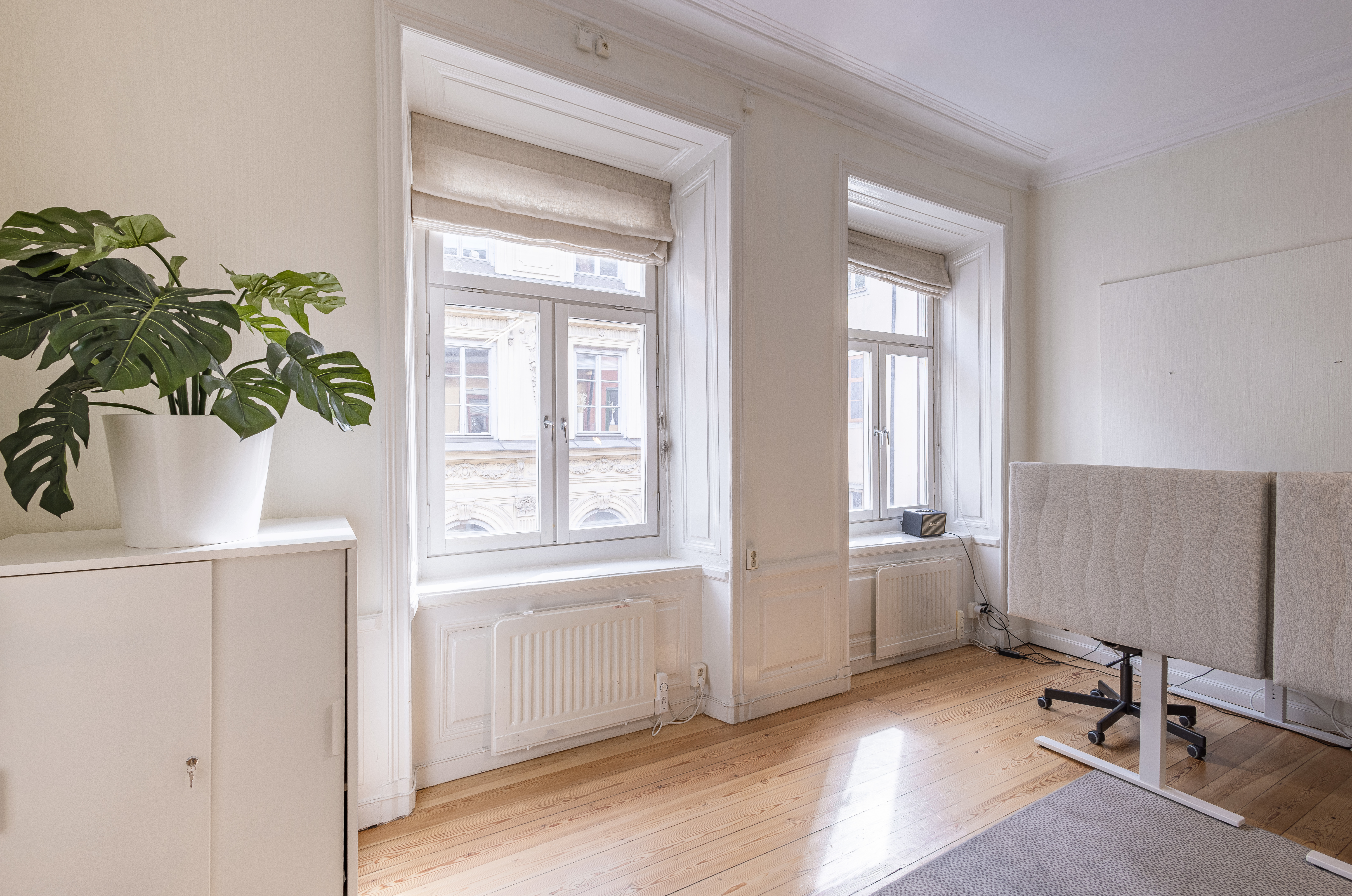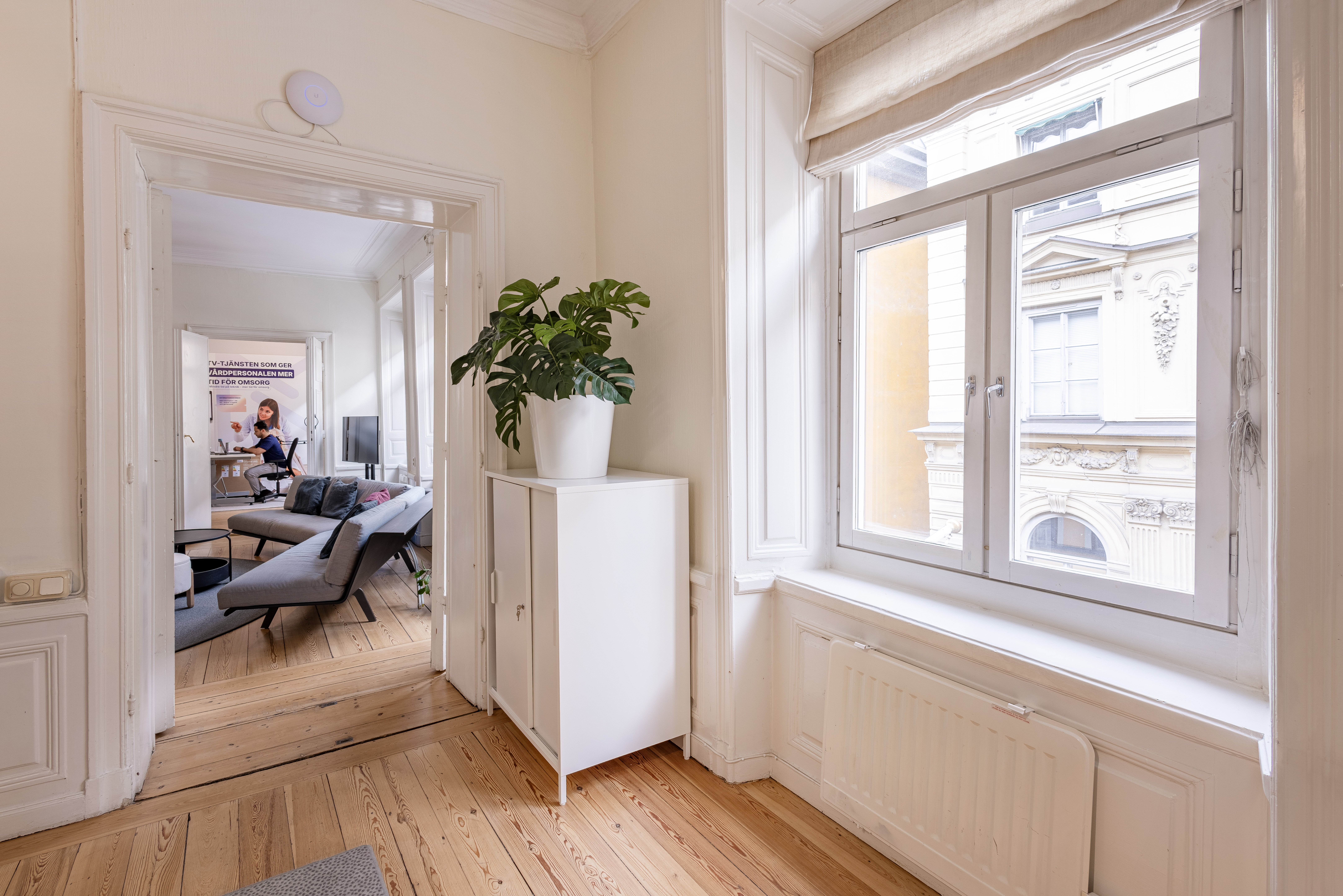 Lokalen är belägen på våning 2 i huset, och nås via fastighetens huvudentré. Väl inne i lokalen består den utav en öppen foajé med plats för ytterkläder och väntande kunder. Vidare in finner vi fem stycken separata rum, varav två större rum. Tre utav rummen har ett fantastiskt ljusinsläpp med utsikt över Stora Nygatan nedanför. I lokalen finns ett pentry, med utrymme för ca 4 personer att äta lunch.