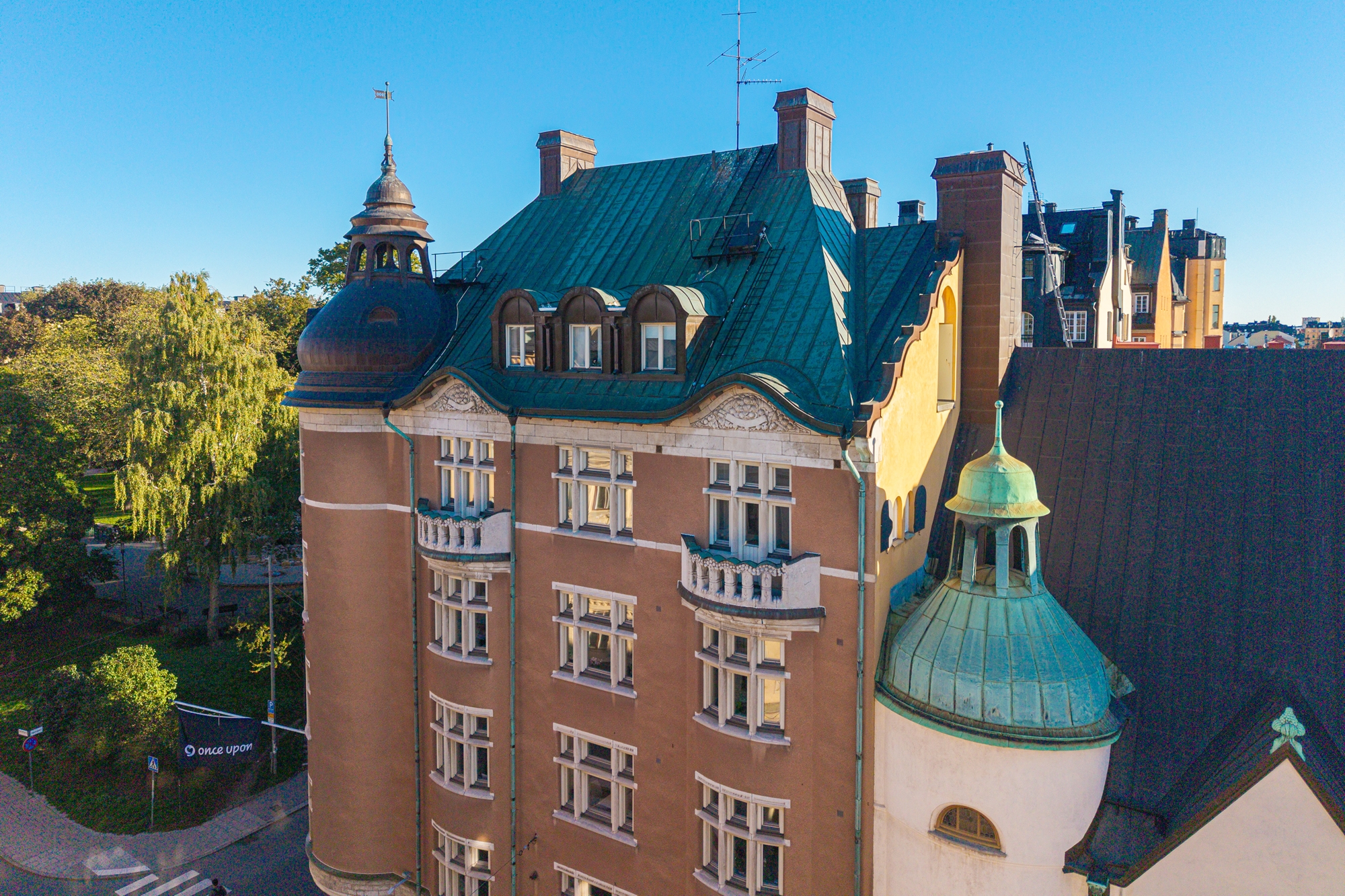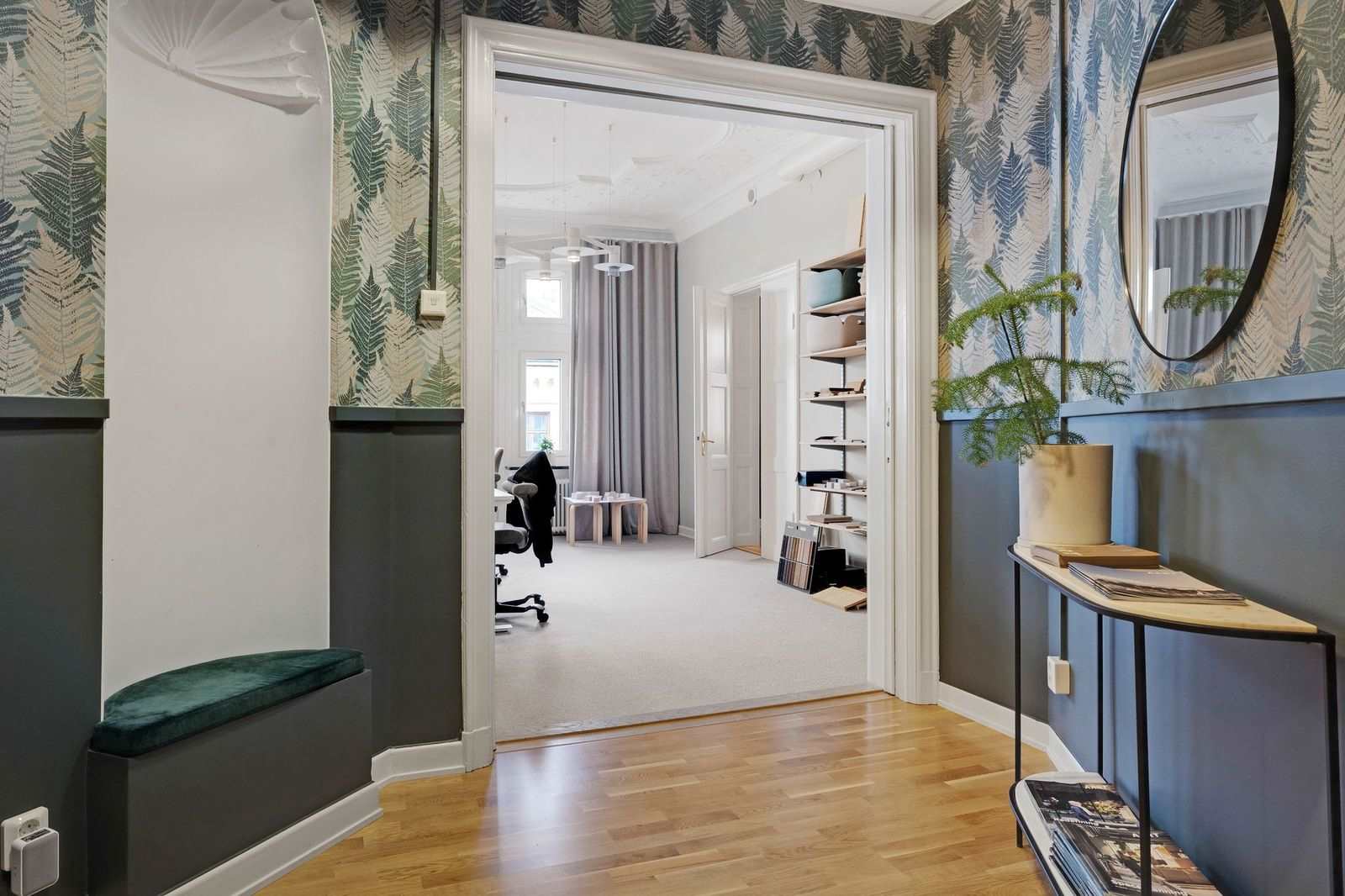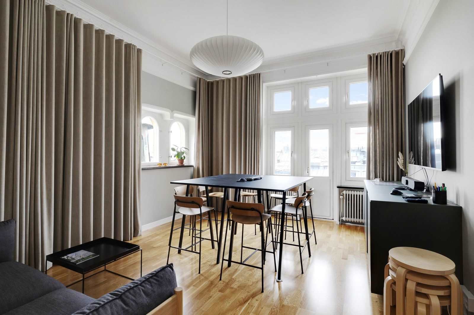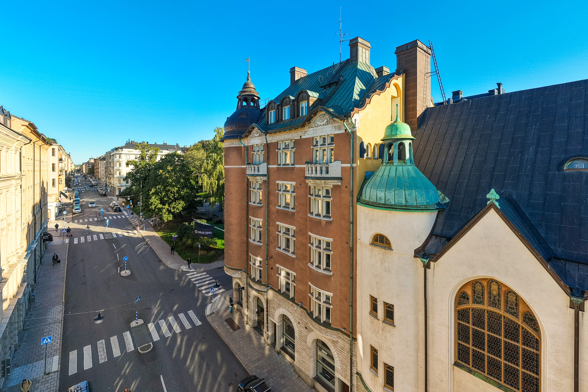 Genom de stora vackra fönstren mot Upplandsgatan och Tegnérlunden erbjuds ett generös ljusinsläpp och utsikt över takåsarna!