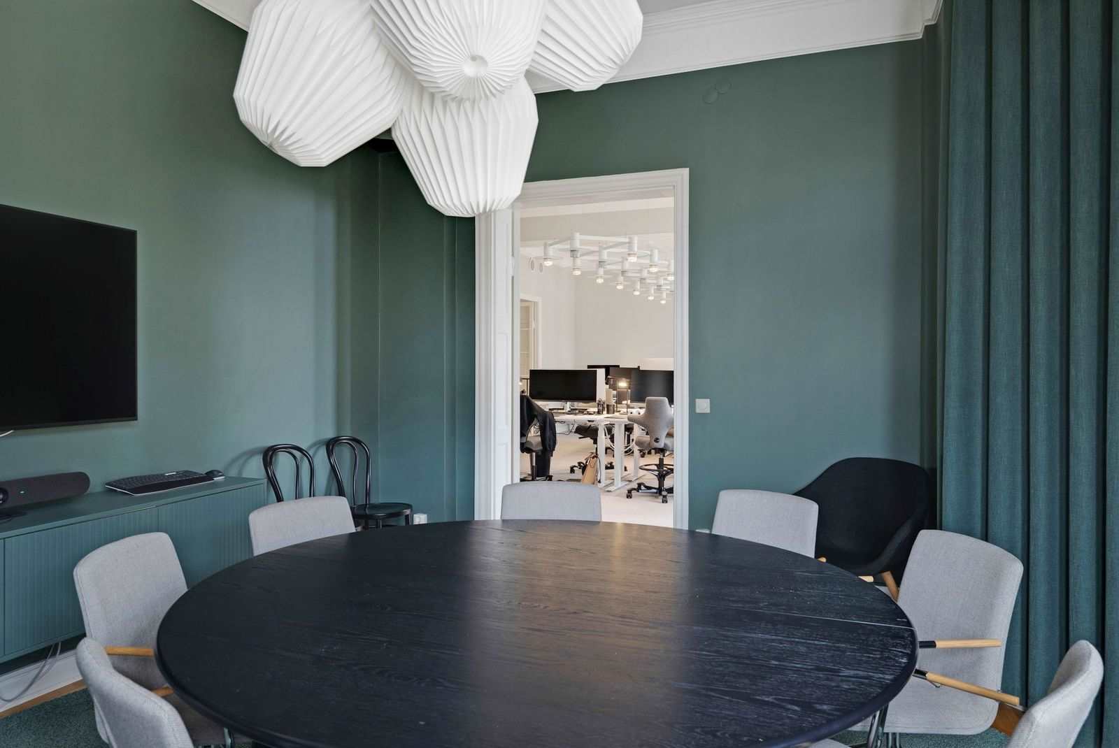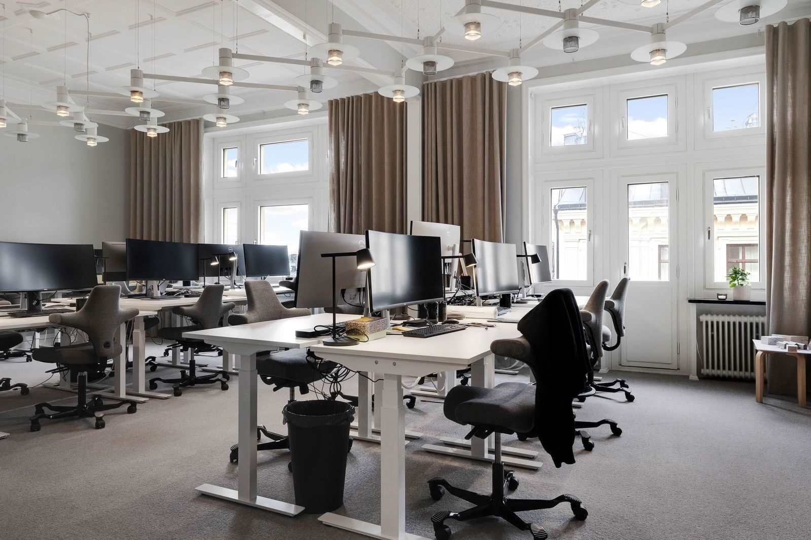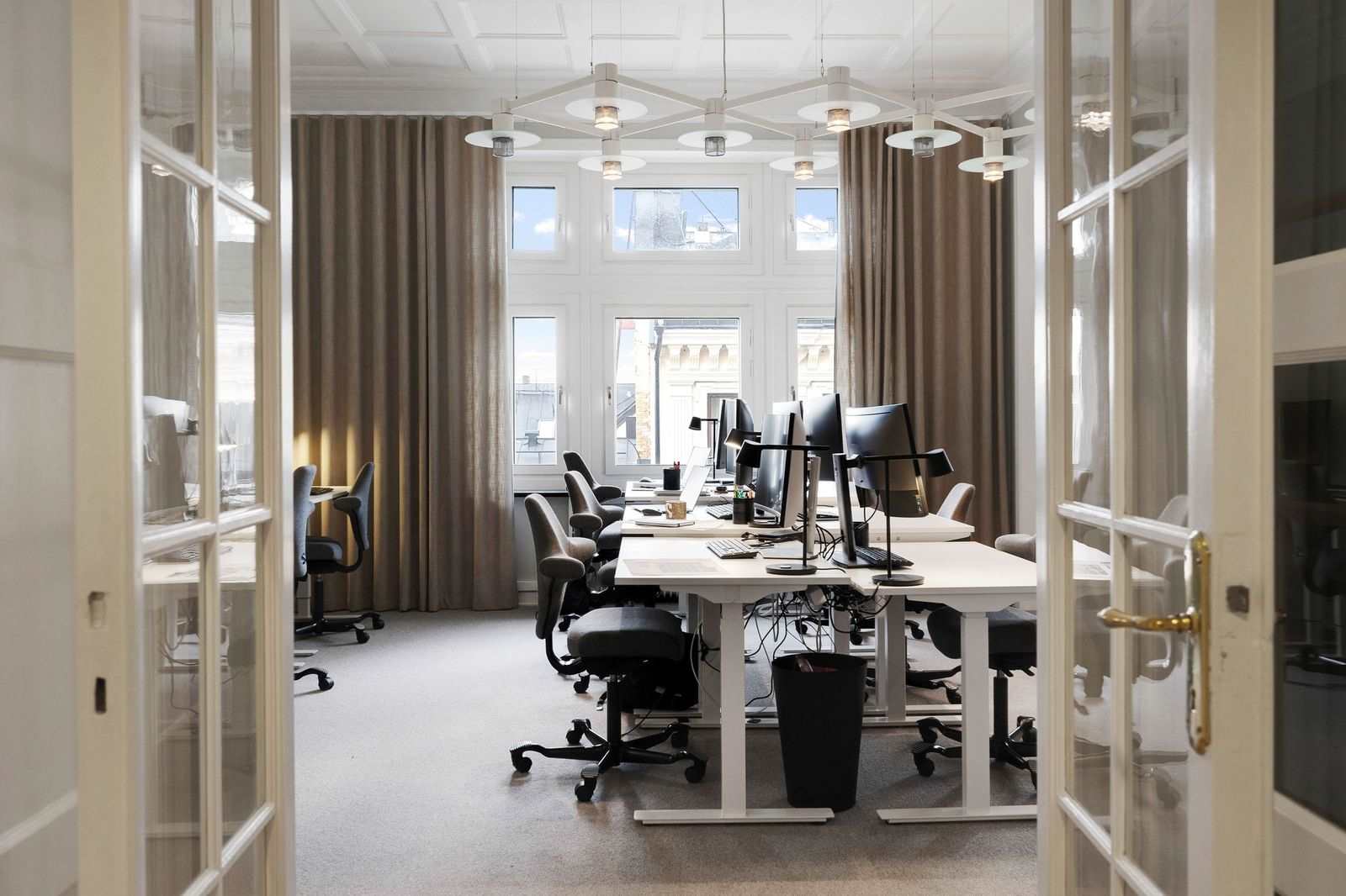 Stor öppen arbetsyta i kombination med två ytterligare rum, utmärkta möjligheter att kombinera yteffeffektiva arbetsytor med generösa mötesrum.