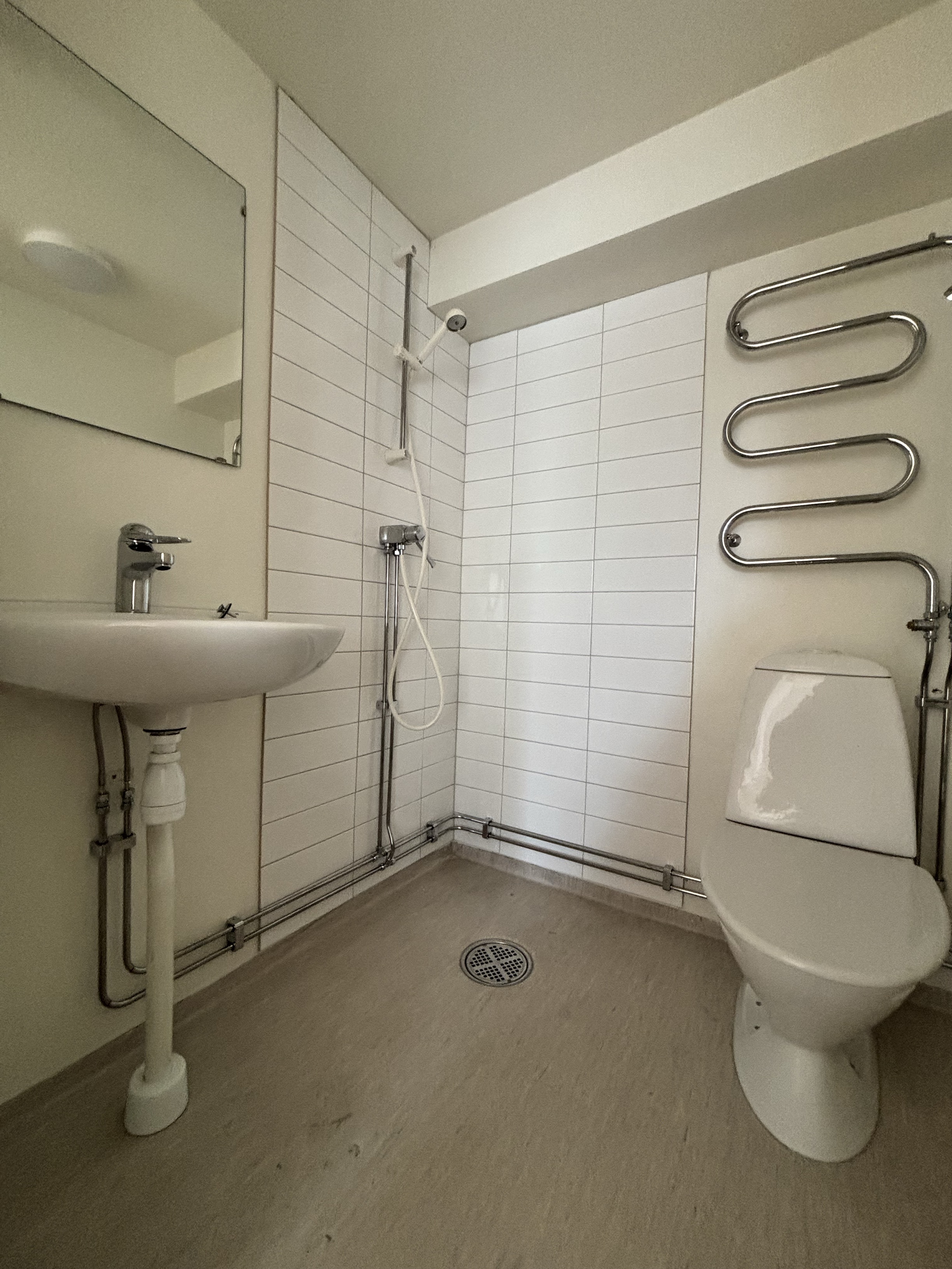 Effektiv planlösning med pentry, WC och en öppen yta som kan anpassas efter behov.