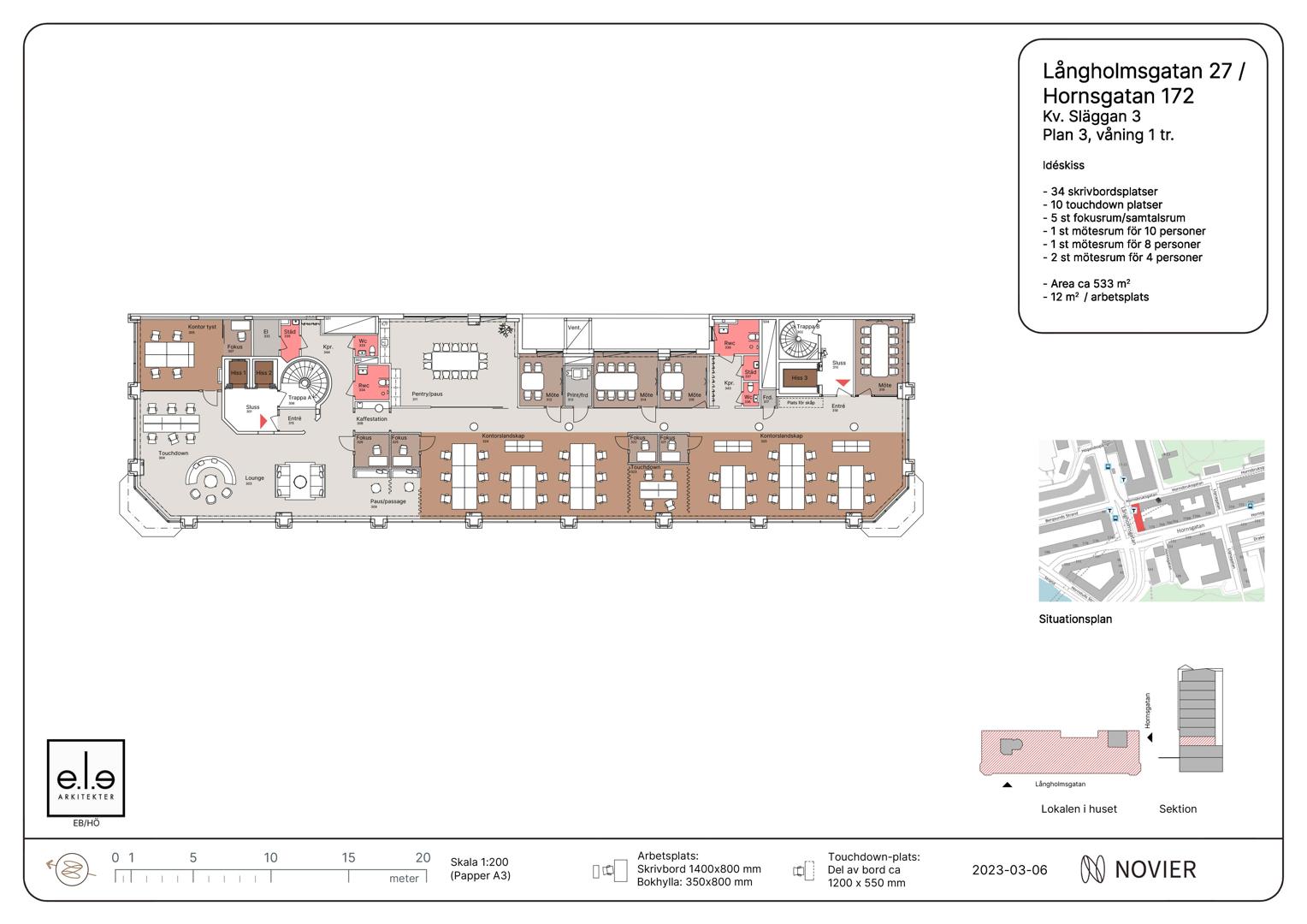 Mestadels öppen planlösning i kombination med mötes och konferensrum. Stora fönster med trevligt ljusinsläpp. Flertalet mindre mötes och samtalsrum samt ett större konferensrum för 10 personer. Fem WC varav 2 RWC.