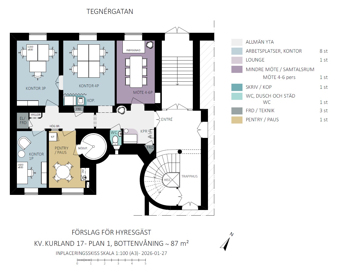 Förutom Drottninggatans myllrande folkliv runt hörnet finns stillheten i parkerna Tegnérlunden och Observatorielunden alldeles inpå knuten. Närområdet berikas även av ett brett kulturutbud. En etablering på Tegnergatan 35 innebär inte bara en attraktiv arbetsplats utan också en adress som signalerar kvalitet och tillgänglighet i Stockholms innerstad.