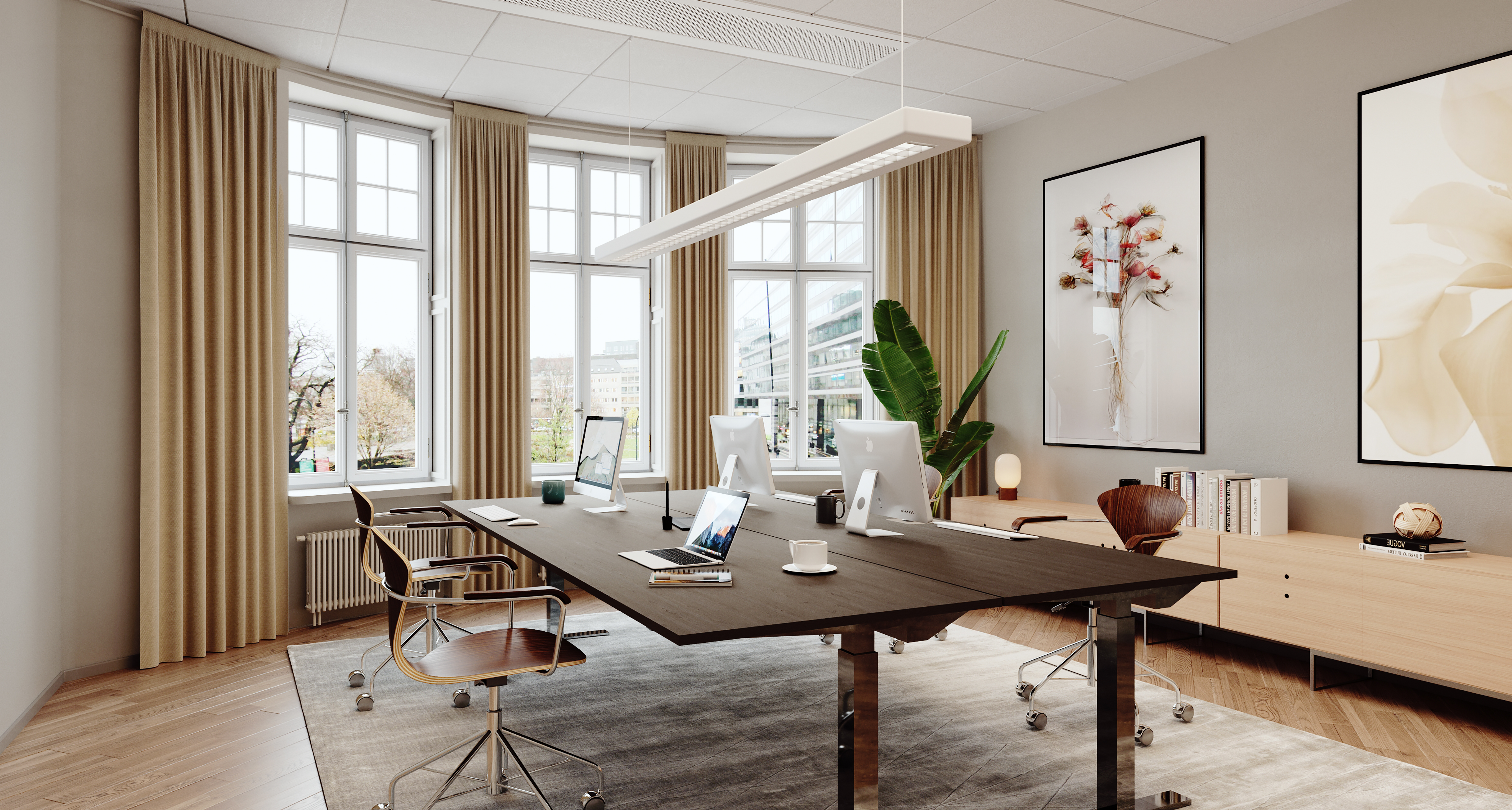 Trevlig kontorslokal i bra läge med större kontorsrum och mötesrum i lokalen, 3 st toaletter varav 1 med dusch. Stora fönster och högt i tak med utsikt över parken. Ritning visar nuvarande planlösning. Visionsbilderna i annonsen visar på hur kontoret kan se ut efter renovering.