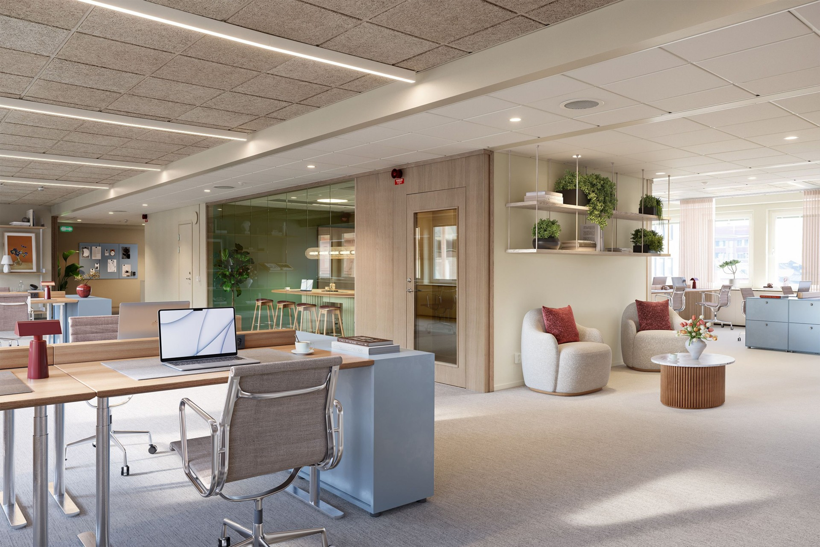 Ni är självklart med och påverkar när lokalerna anpassas efter er verksamhet och dess skiftande behov, med en bas av ytskikt och installationer av hög standard. I köket finner ni ett nytt Marbodal-kök och mötesrummen är omringade av högkvalitativa glaspartier.