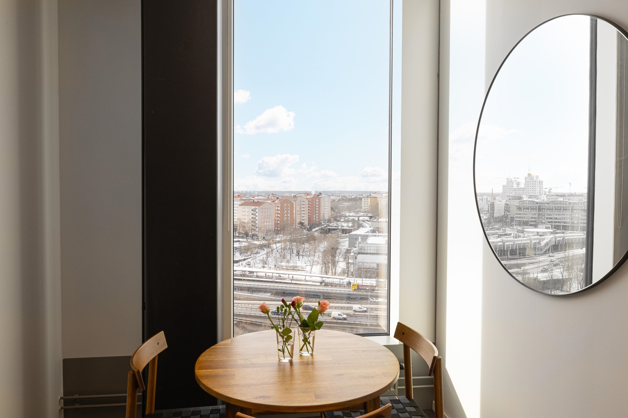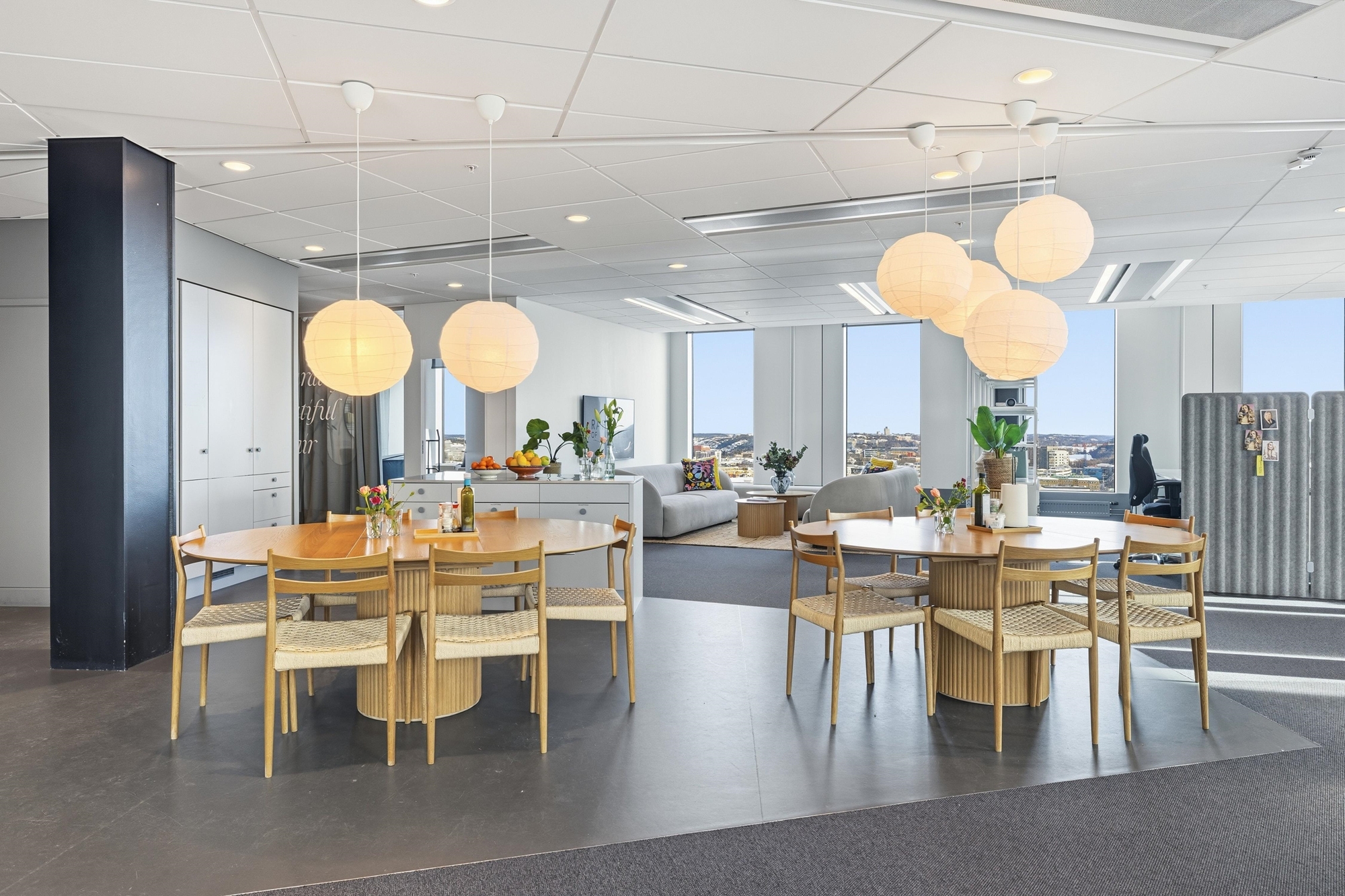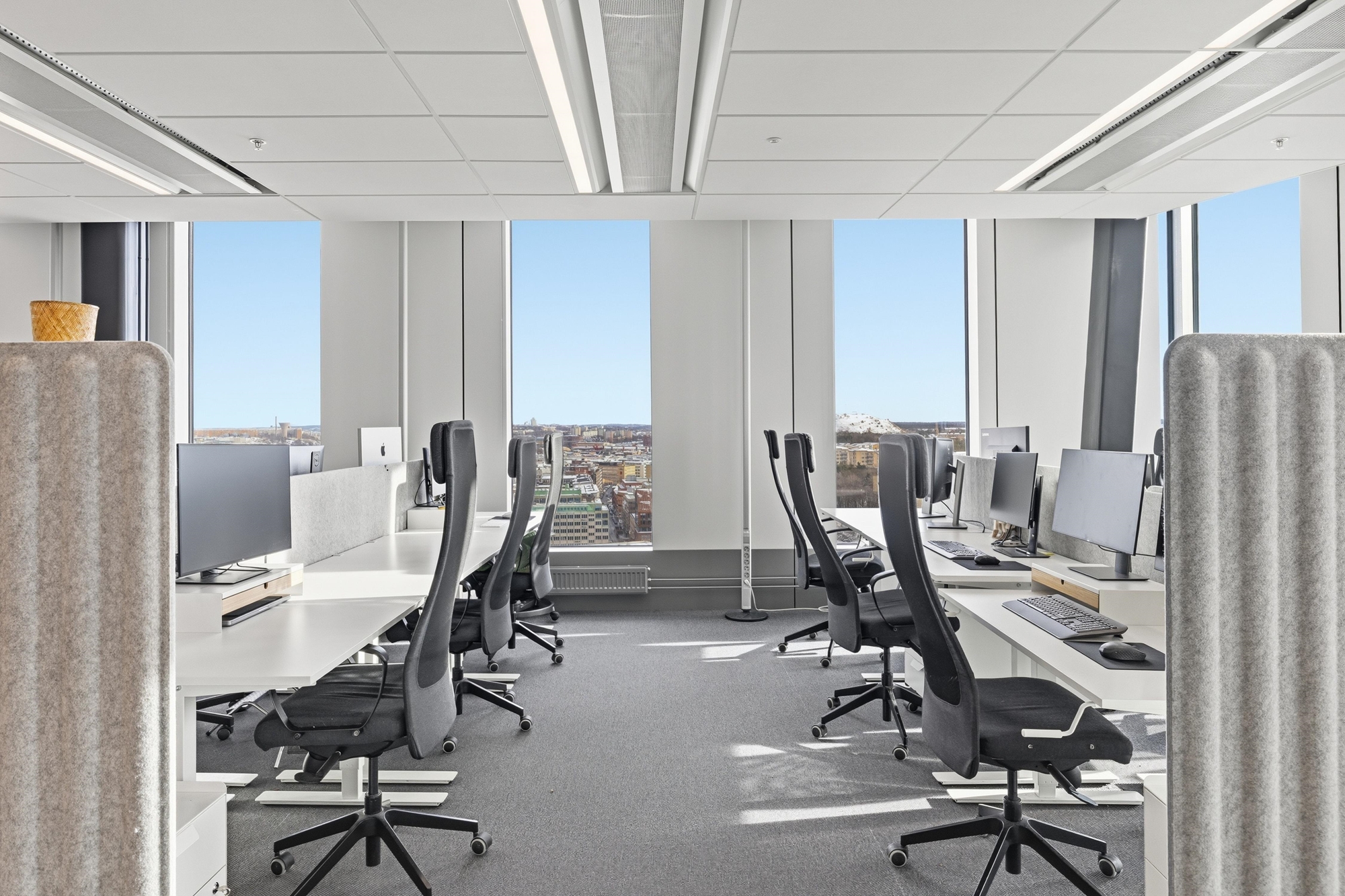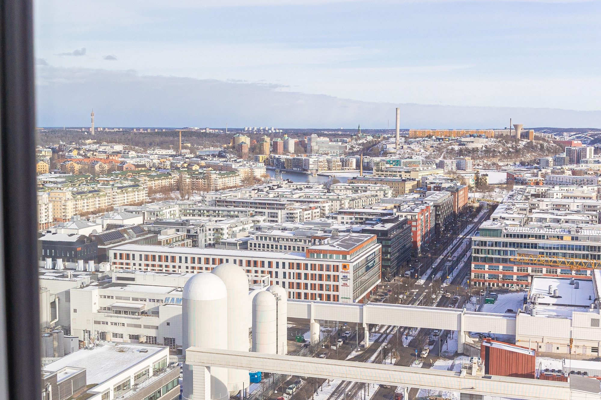 Lokalen befinner sig på våning 21, vilket genast märks när vi kliver in i lokalen. Milsvid utsikt över Stockholm med ett underbart ljusinsläpp!