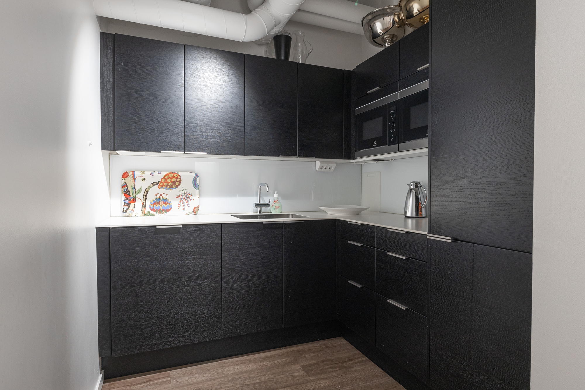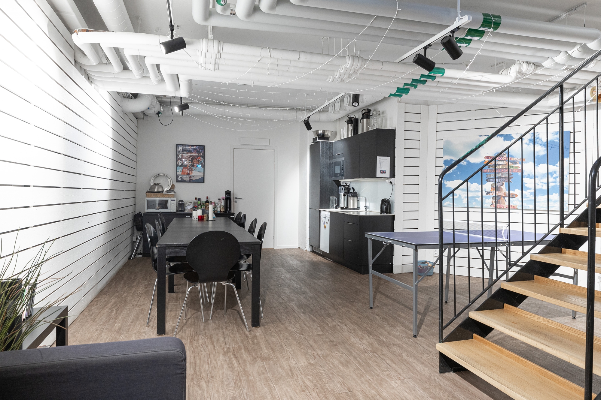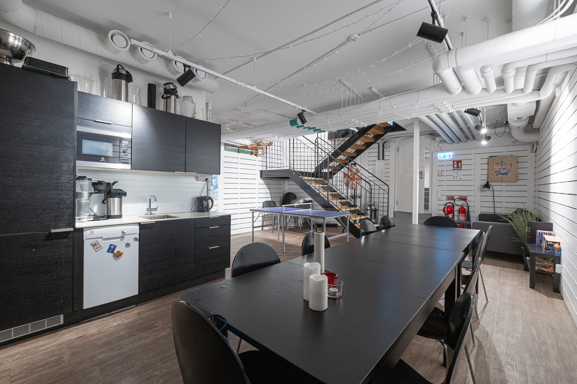 -Genom att gå ner för spiraltrappan som förbinder våningsplanen når du pentryt som är rymligt nog för att samla medarbetarna för internmöten och trivamma luncher