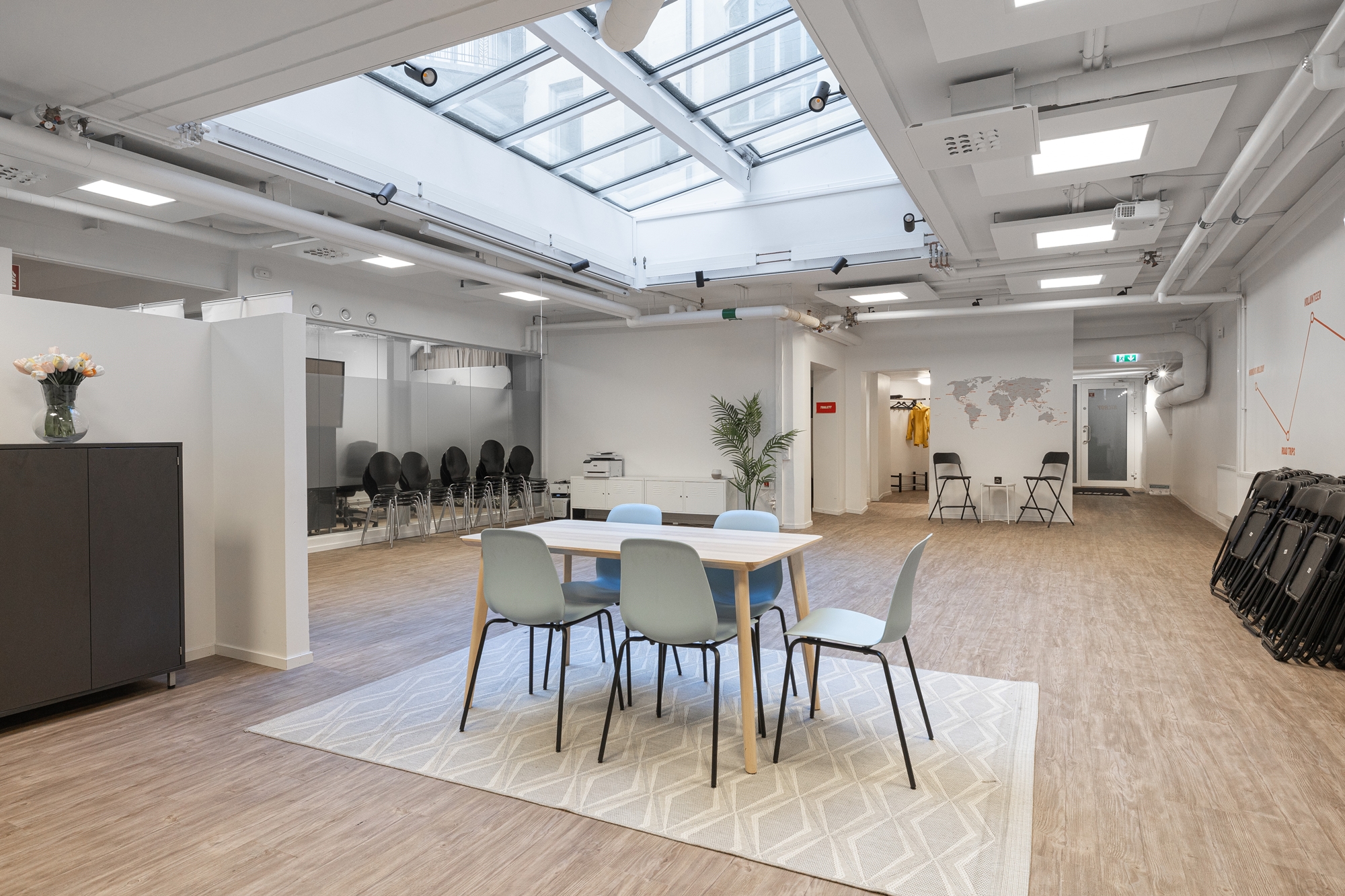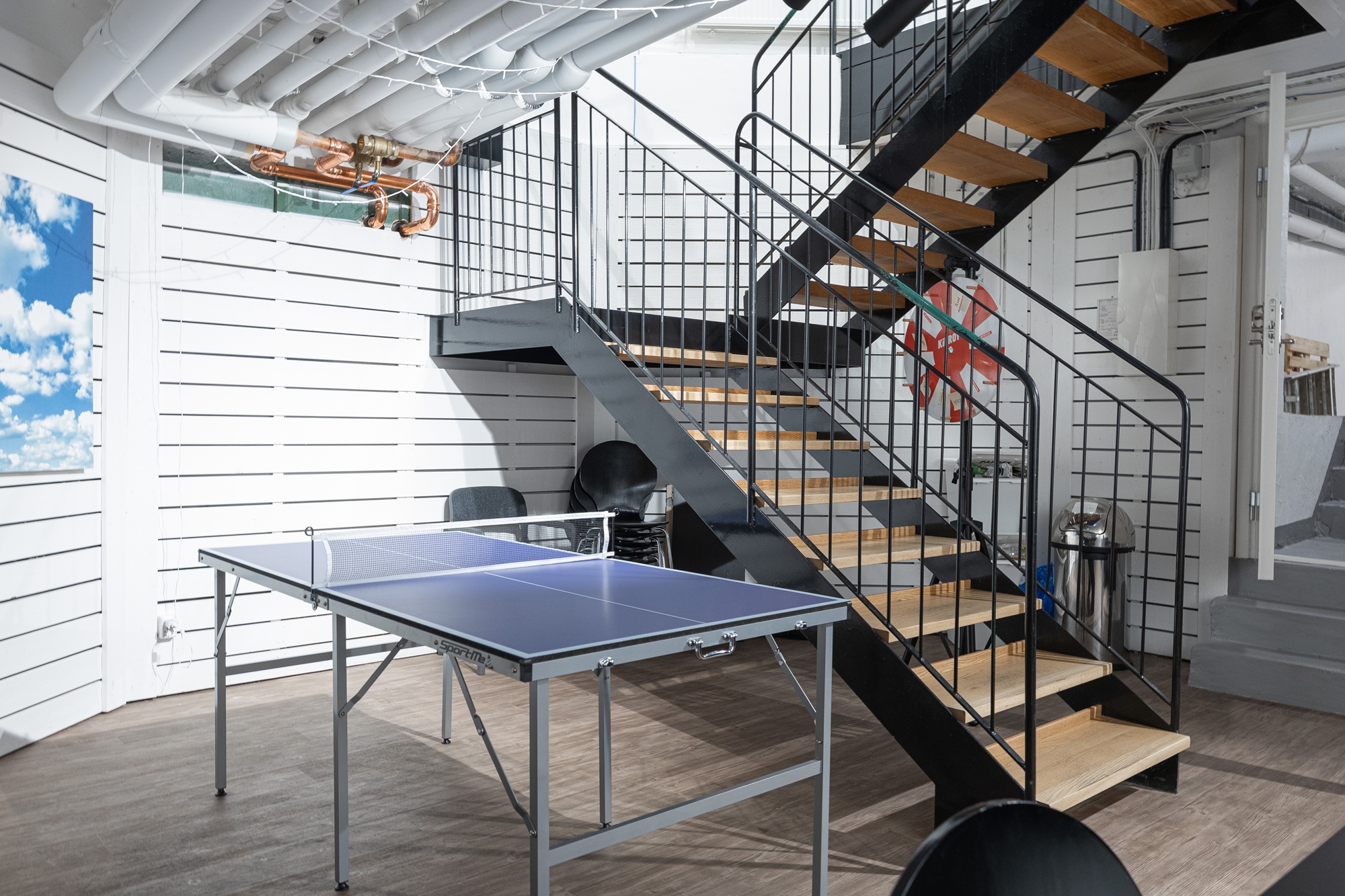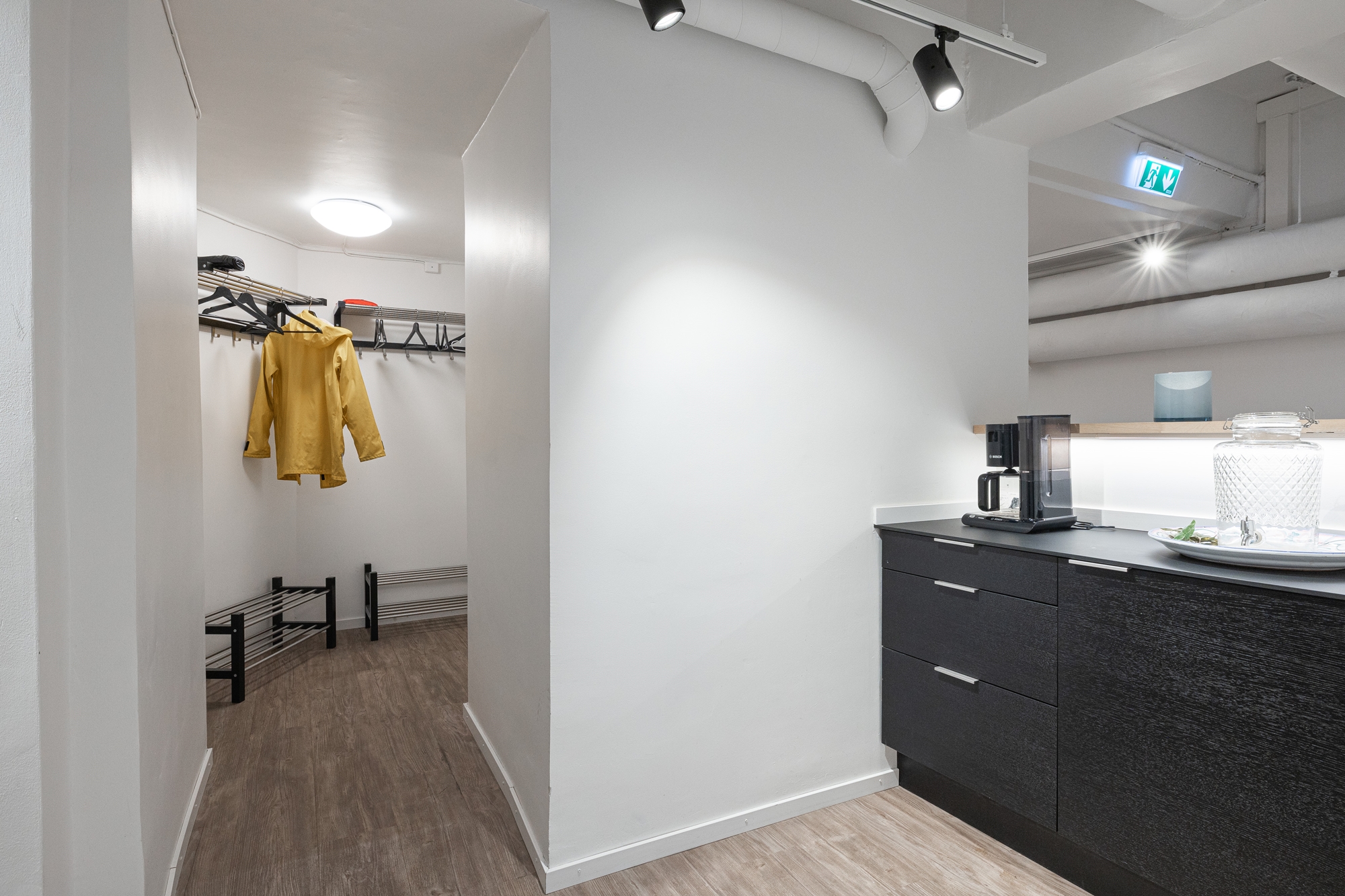 -Genom att gå ner för spiraltrappan som förbinder våningsplanen når du pentryt som är rymligt nog för att samla medarbetarna för internmöten och trivamma luncher