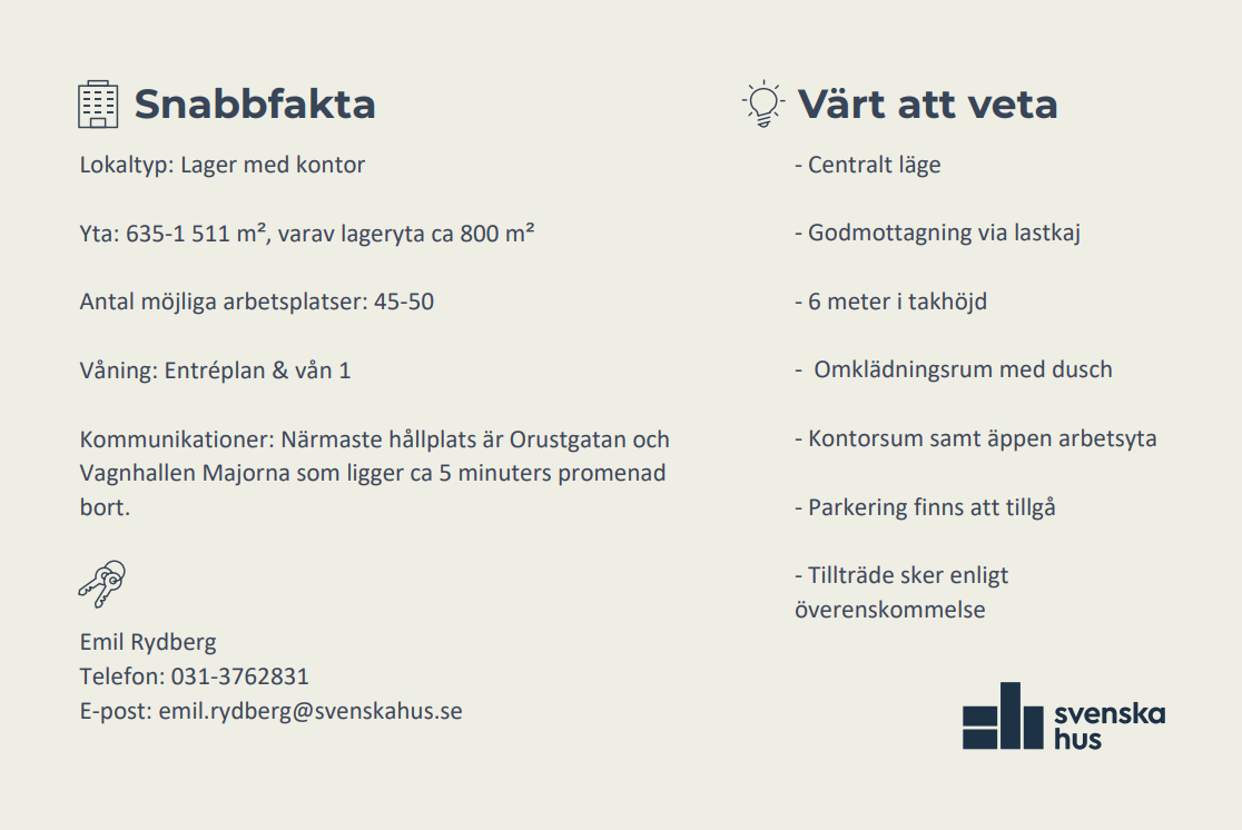 Här erbjuds en kombilokal utöver det vanliga. Lokalen erbjuder en fin lageryta om ca 300 m² med tillgång till inlastning via lastkaj, kontorsytorna är belägna på entréplan samt en trappa upp och är på ca 336 kvm. Ytor innehåller också omklädningsrum med dusch och WC. Lokalen nås via entrén från innergården samt via fastighetens huvudentré. Via interntrappan tar man sig upp till entresol planet där man möts av en öppen kontorsyta samt ett stort rum för möten eller lounge-häng samt omklädningsrum.