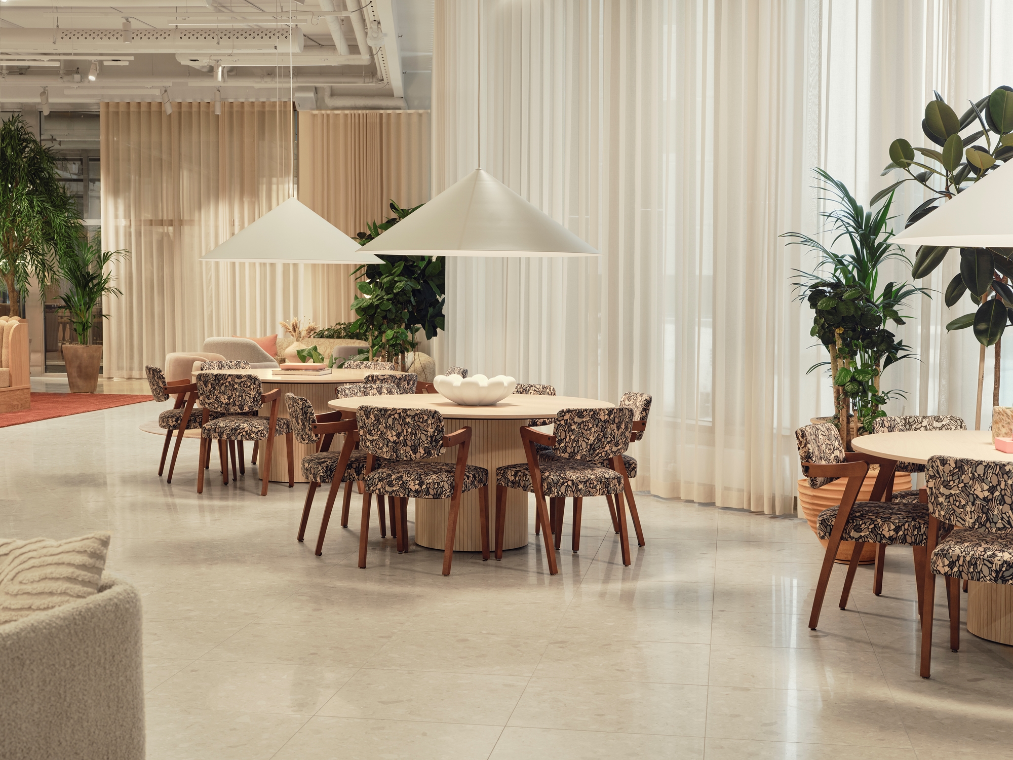 Husets designval av mattor, pentry och mötesrumspartier är hållbara och medvetna materialval. De har en skandinavisk neutral kulörpalett vilket harmoniserar med huset och ger stor frihet till att sätta accentfärger med egna möbler och textilier.