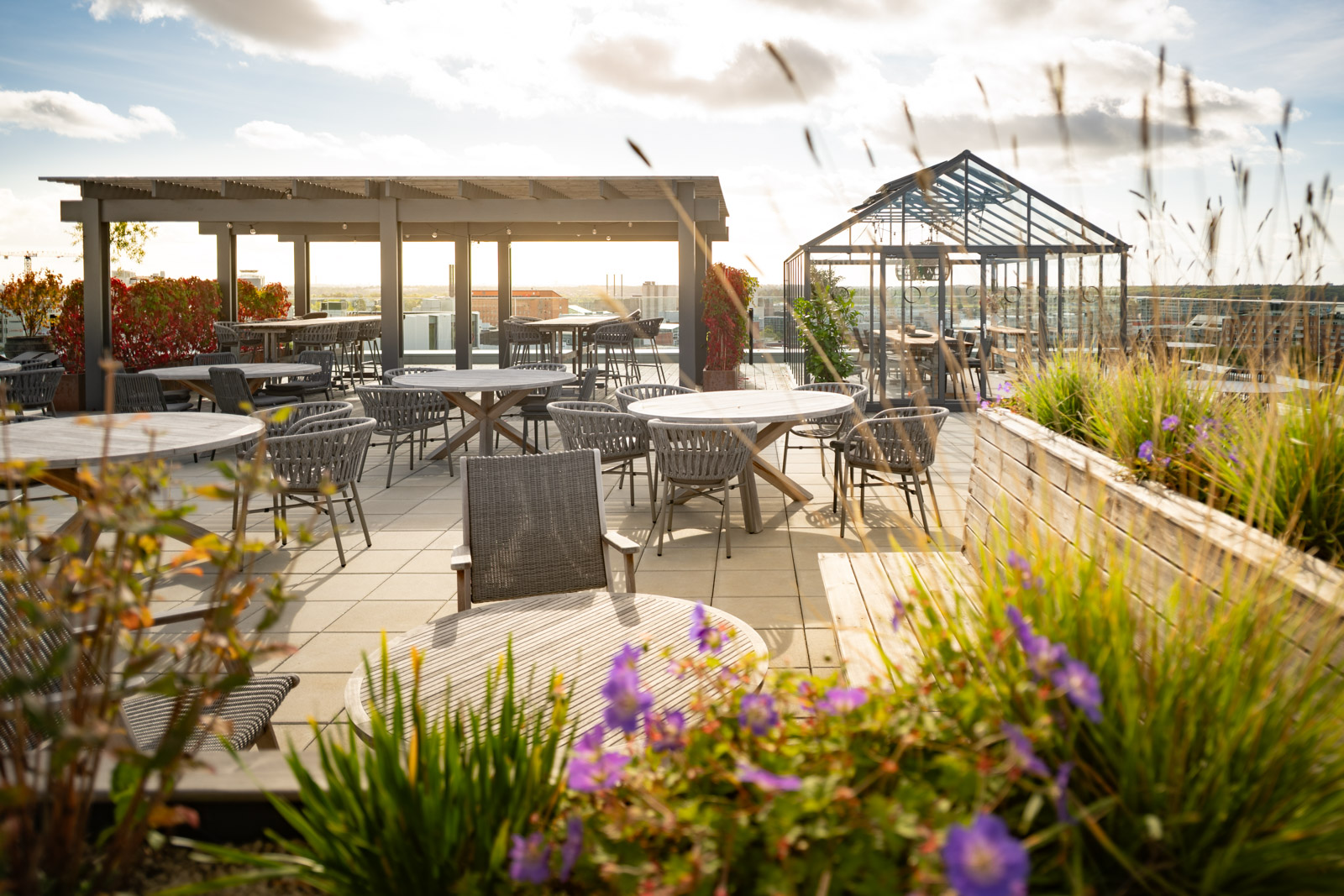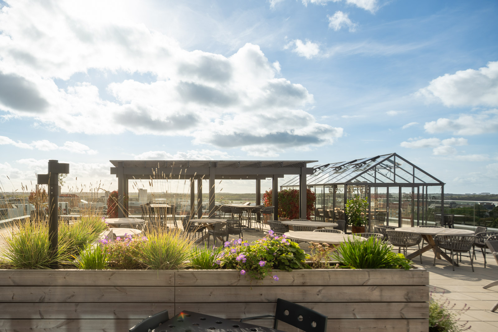 9 våningar upp i Origo finns en unik lokal med egen takterrass och utsikt i fyra väderstreck. Här har ni även nära till husets gemensamma takterrass om 400 kvm med orangeri och utebar.