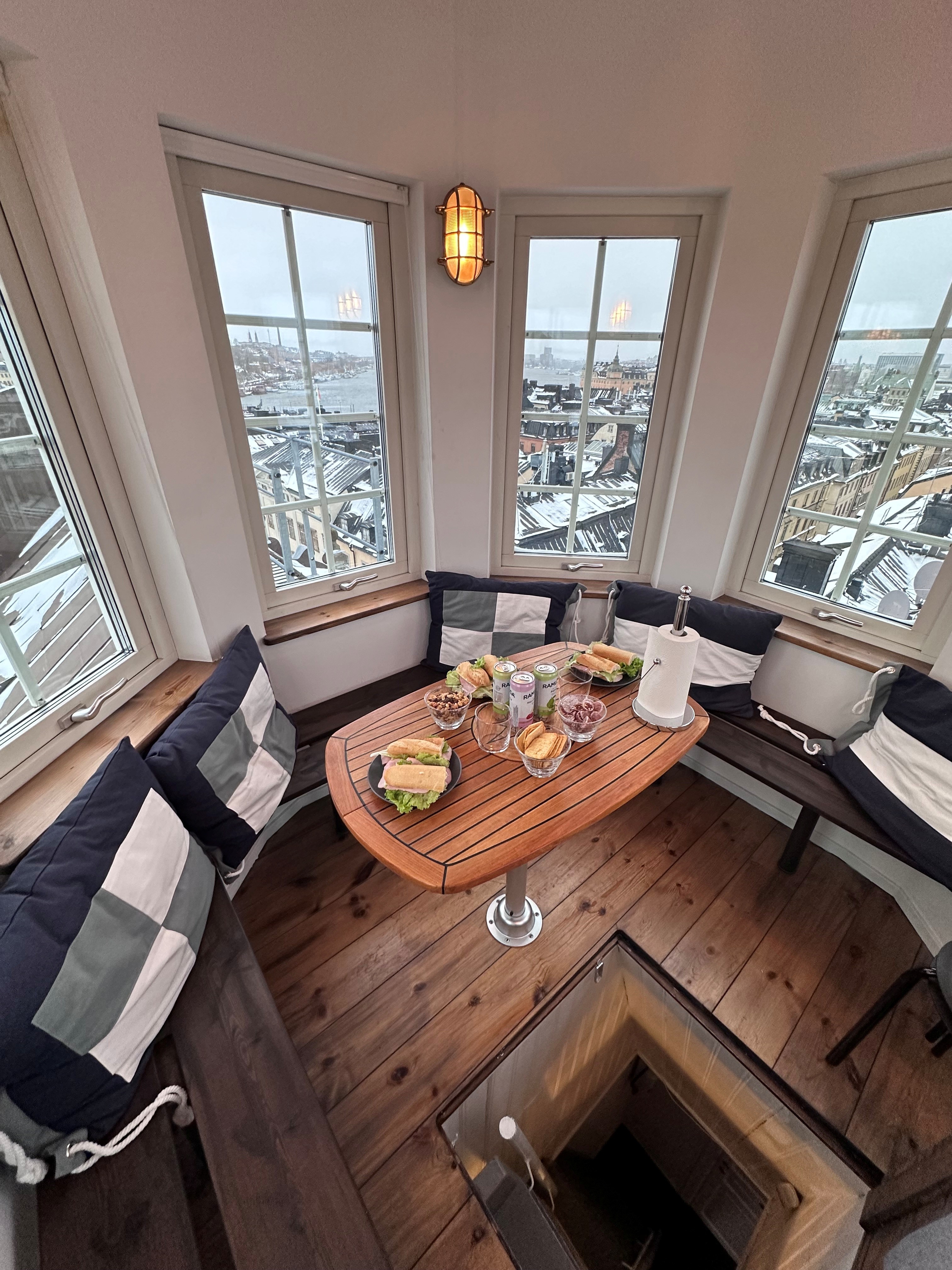 På Kornhamnstorg 49 sitter vi i en ljus och karaktärsfull lokal högst upp i fastigheten – med unikt eget torn, snedtak, stora fönster, vackra vyer och en varm, genomtänkt inredning. Här finns gott om ljus, sociala ytor och en lugn, kreativ atmosfär som gör det enkelt att både fokusera och trivas.