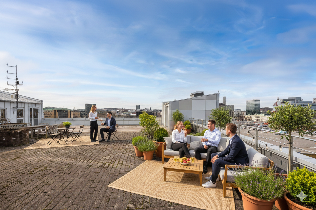 Den egna takterrassen ger stora möjligheter till en attraktiv arbetsmiljö perfekt för pauser i solen, spontana möten, after work eller kundevent. Här finns gott om plats för soffgrupper, bord och andra utemöbler. Enast fantasin sätter gränser.